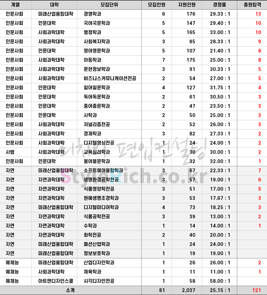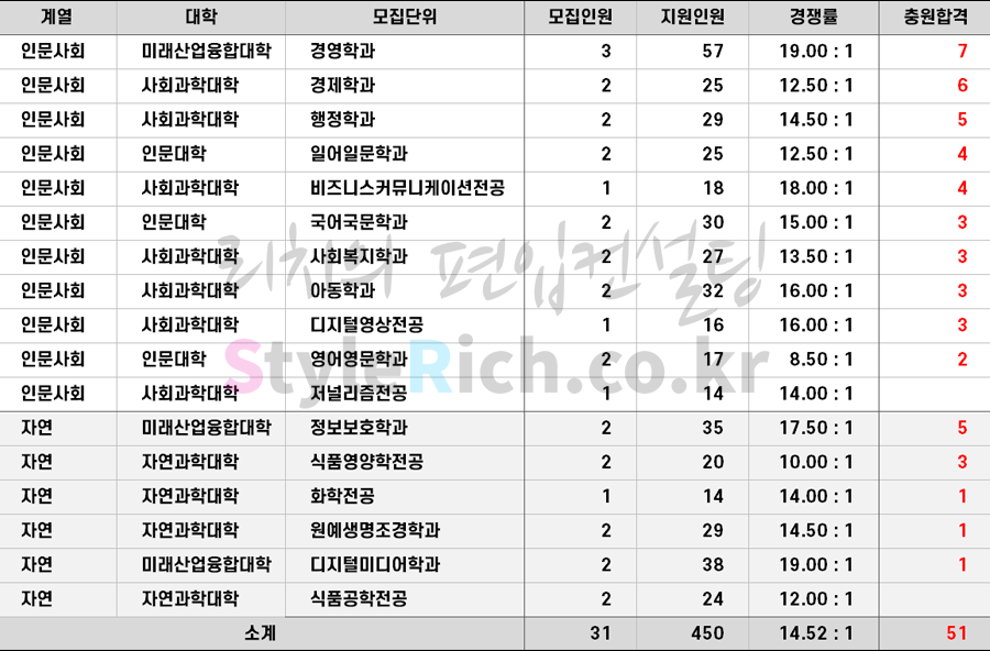 * 모집단위는 인문사회, 자연, 예체능으로 분류 후 추가합격이 많은 순으로 정렬