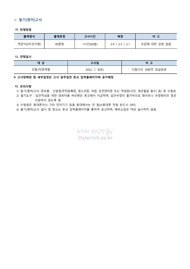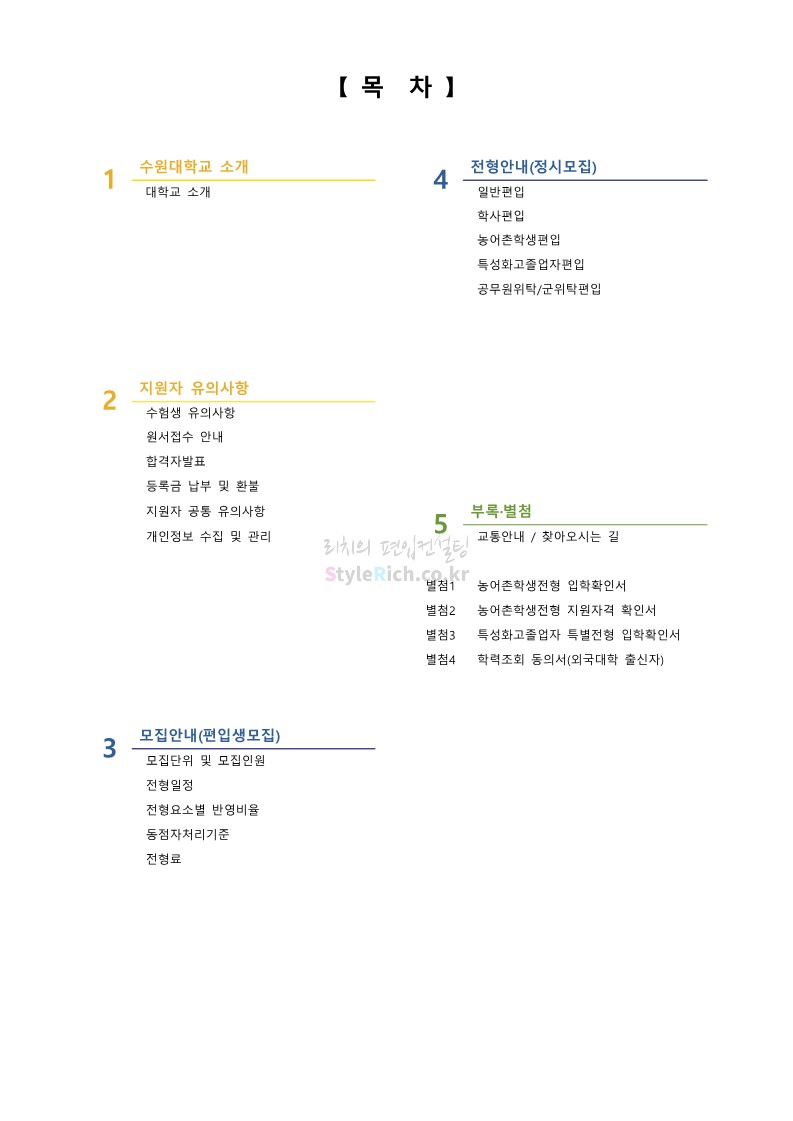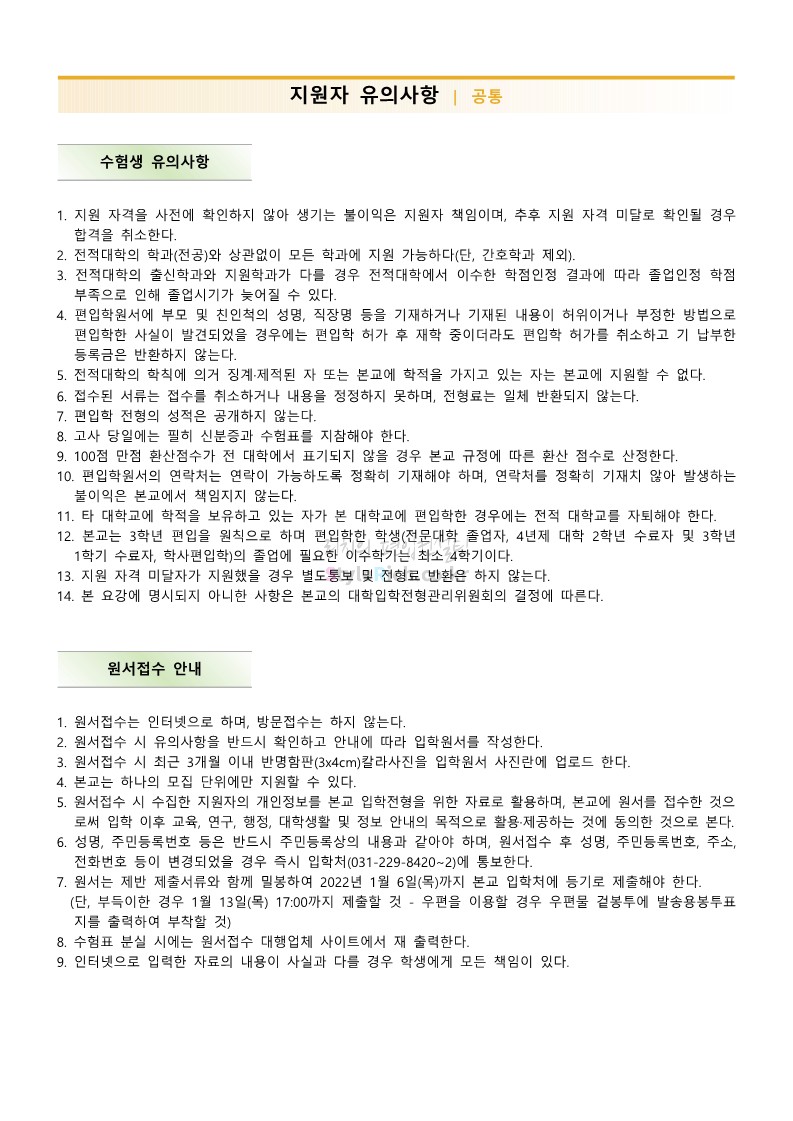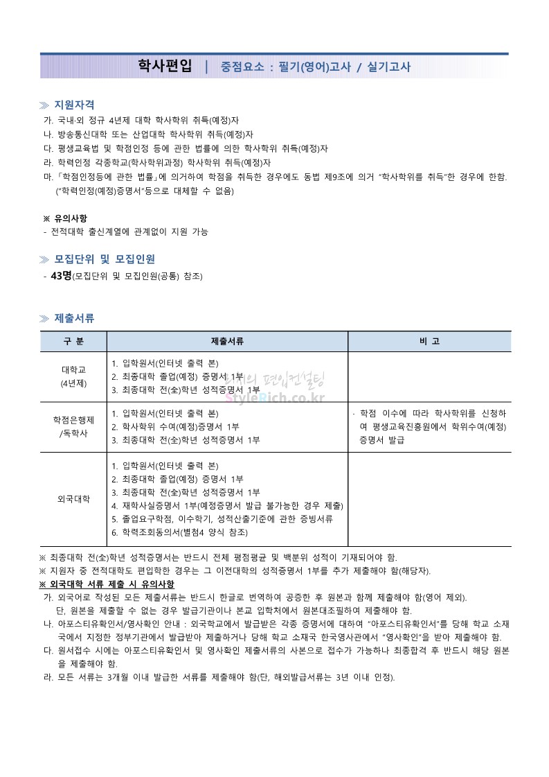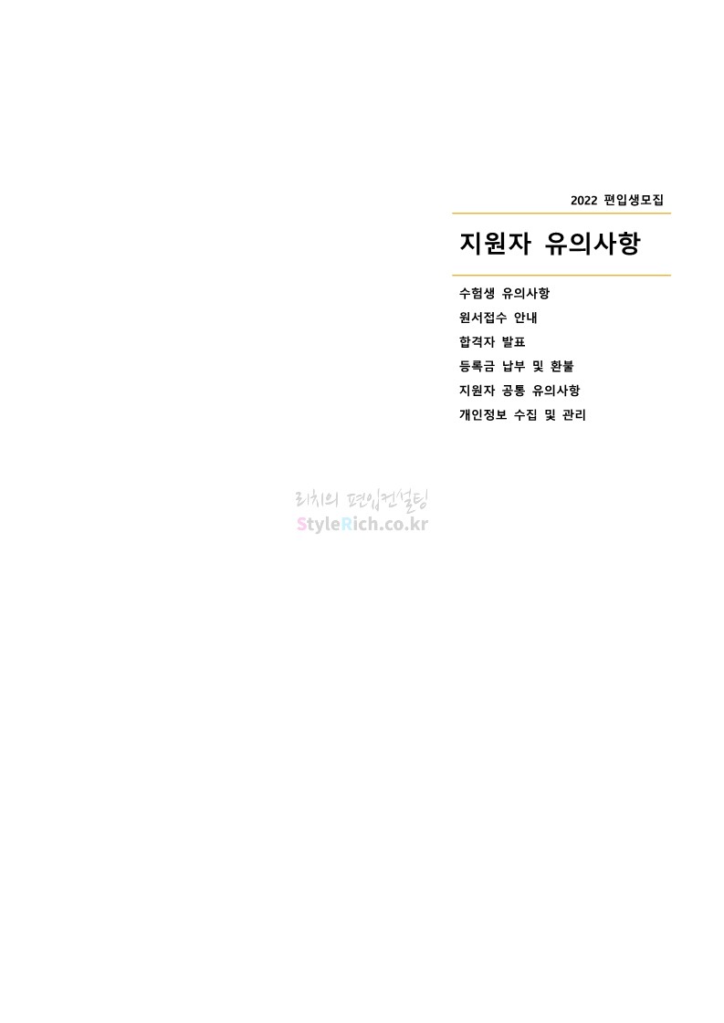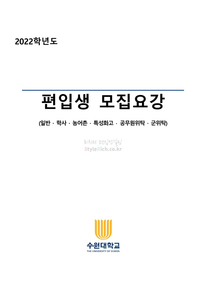 수원대 편입 2022학년도 모집요강 간편하게 보자! 2021.11.29 21:18 편입 모집요강/2022학년도 모집요강 2022학년도 수원대 편입 모집요강(2021.11.29 기준)을 간편하게 확인하세요. * 최종 모집요강 발표 이후에도 내용의 일부가 변경될 수 있으니 지원 전 반드시 수원대 입학처의 모집요강을 확인 바랍니다. 2022학년도 수원대 편입 모집요강 다운받기 <출처: 수원대> [썹프라이즈] 넷플 왓챠 고민 그만! 썹스의 추천작 보고 선택해! 공유하기 게시글 관리 리치의 편입컨설팅 저작자표시 비영리 변경금지 (새창열림) '편입 모집요강 > 2022학년도 모집요강' 카테고리의 다른 글 건국대 편입 2022학년도 모집요강 간편하게 보자! (0) 2021.11.30 한국항공대 편입 2022학년도 모집요강 간편하게 보자! (0) 2021.11.29 가천대 편입 2022학년도 모집요강 간편하게 보자 (0) 2021.11.29 서울대 편입 2022학년도 모집요강 간편하게 보자! (0) 2021.11.28 단국대(천안) 편입 2022학년도 모집요강 간편하게 보자! (0) 2021.11.28 댓글 공유하기 다른 글 댓글 이 글 공유하기 구독하기 구독하기 카카오톡 카카오톡 라인 라인 트위터 트위터 Facebook Facebook 카카오스토리 카카오스토리 밴드 밴드 네이버 블로그 네이버 블로그 Pocket Pocket Evernote Evernote 다른 글 건국대 편입 2022학년도 모집요강 간편하게 보자! 건국대 편입 2022학년도 모집요강 간편하게 보자! 2021.11.30 한국항공대 편입 2022학년도 모집요강 간편하게 보자! 한국항공대 편입 2022학년도 모집요강 간편하게 보자! 2021.11.29 가천대 편입 2022학년도 모집요강 간편하게 보자 가천대 편입 2022학년도 모집요강 간편하게 보자 2021.11.29 서울대 편입 2022학년도 모집요강 간편하게 보자! 서울대 편입 2022학년도 모집요강 간편하게 보자! 2021.11.28 다른 글 더 둘러보기