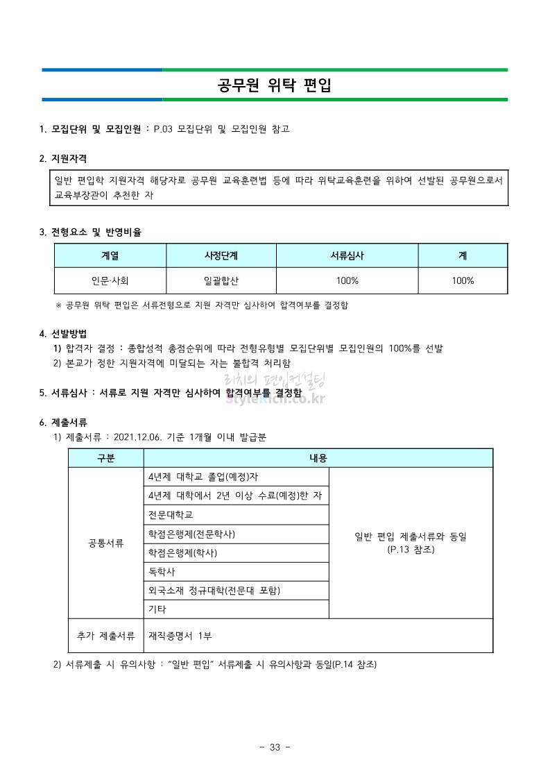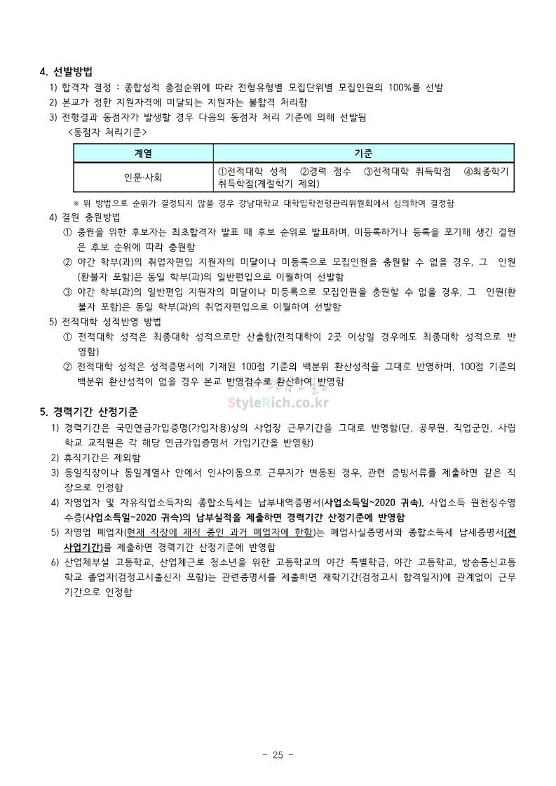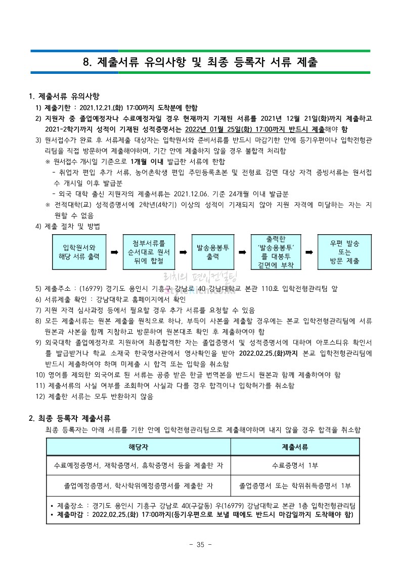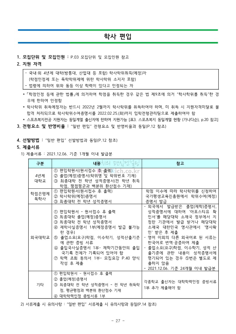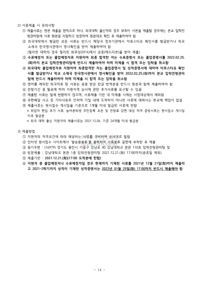 강남대 편입 2022학년도 모집요강을 간편하게 보자! 2021.12.01 00:38 편입 모집요강/2022학년도 모집요강 2022학년도 강남대 편입 모집요강(2021.11.29 기준)을 간편하게 확인하세요. * 최종 모집요강 발표 이후에도 내용의 일부가 변경될 수 있으니 지원 전 반드시 강남대 입학처의 모집요강을 확인 바랍니다. 2022학년도 강남대 편입 모집요강 다운받기 <출처: 강남대> 2022학년도 강남대학교 학교소개 공유하기 게시글 관리 리치의 편입컨설팅 저작자표시 비영리 변경금지 (새창열림) '편입 모집요강 > 2022학년도 모집요강' 카테고리의 다른 글 고려대 편입 2022학년도 모집요강을 간편하게 보자! (0) 2021.12.01 경기대 편입 2022학년도 모집요강을 간편하게 보자! (0) 2021.12.01 연세대 편입 2022학년도 모집요강 간편하게 보자! (0) 2021.11.30 건국대 편입 2022학년도 모집요강 간편하게 보자! (0) 2021.11.30 한국항공대 편입 2022학년도 모집요강 간편하게 보자! (0) 2021.11.29 댓글 공유하기 다른 글 댓글 이 글 공유하기 구독하기 구독하기 카카오톡 카카오톡 라인 라인 트위터 트위터 Facebook Facebook 카카오스토리 카카오스토리 밴드 밴드 네이버 블로그 네이버 블로그 Pocket Pocket Evernote Evernote 다른 글 고려대 편입 2022학년도 모집요강을 간편하게 보자! 고려대 편입 2022학년도 모집요강을 간편하게 보자! 2021.12.01 경기대 편입 2022학년도 모집요강을 간편하게 보자! 경기대 편입 2022학년도 모집요강을 간편하게 보자! 2021.12.01 연세대 편입 2022학년도 모집요강 간편하게 보자! 연세대 편입 2022학년도 모집요강 간편하게 보자! 2021.11.30 건국대 편입 2022학년도 모집요강 간편하게 보자! 건국대 편입 2022학년도 모집요강 간편하게 보자! 2021.11.30 다른 글 더 둘러보기