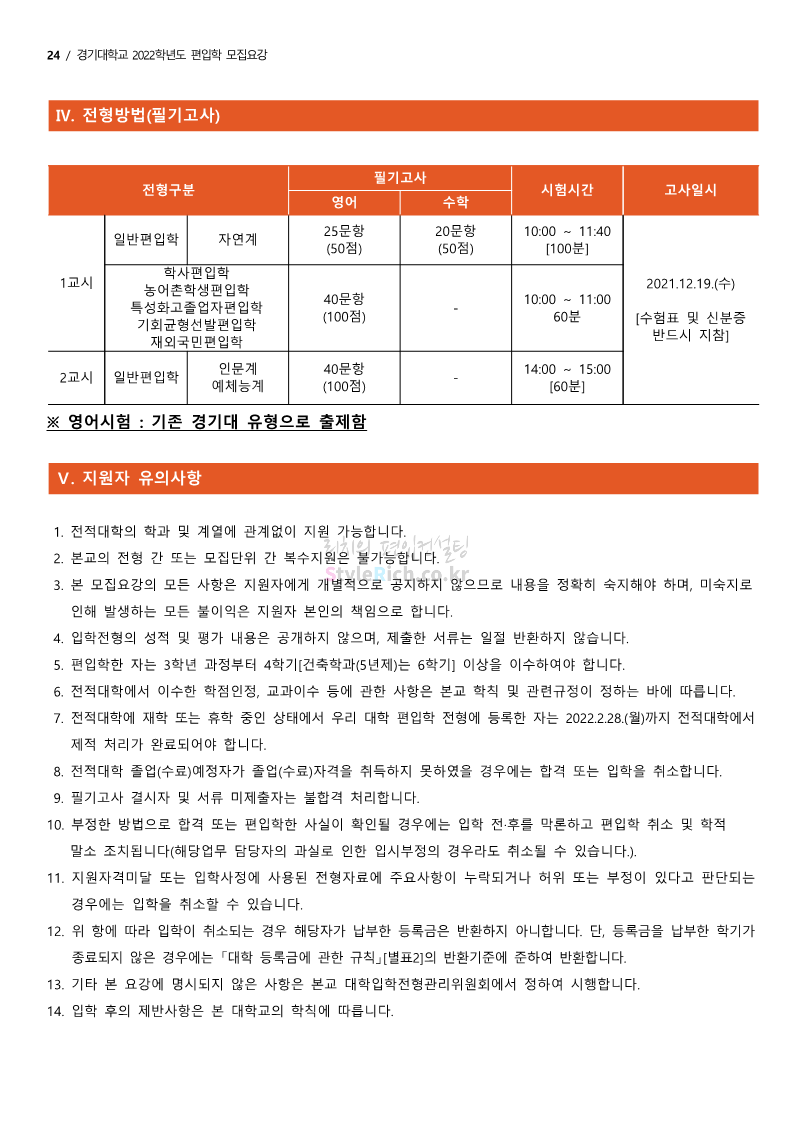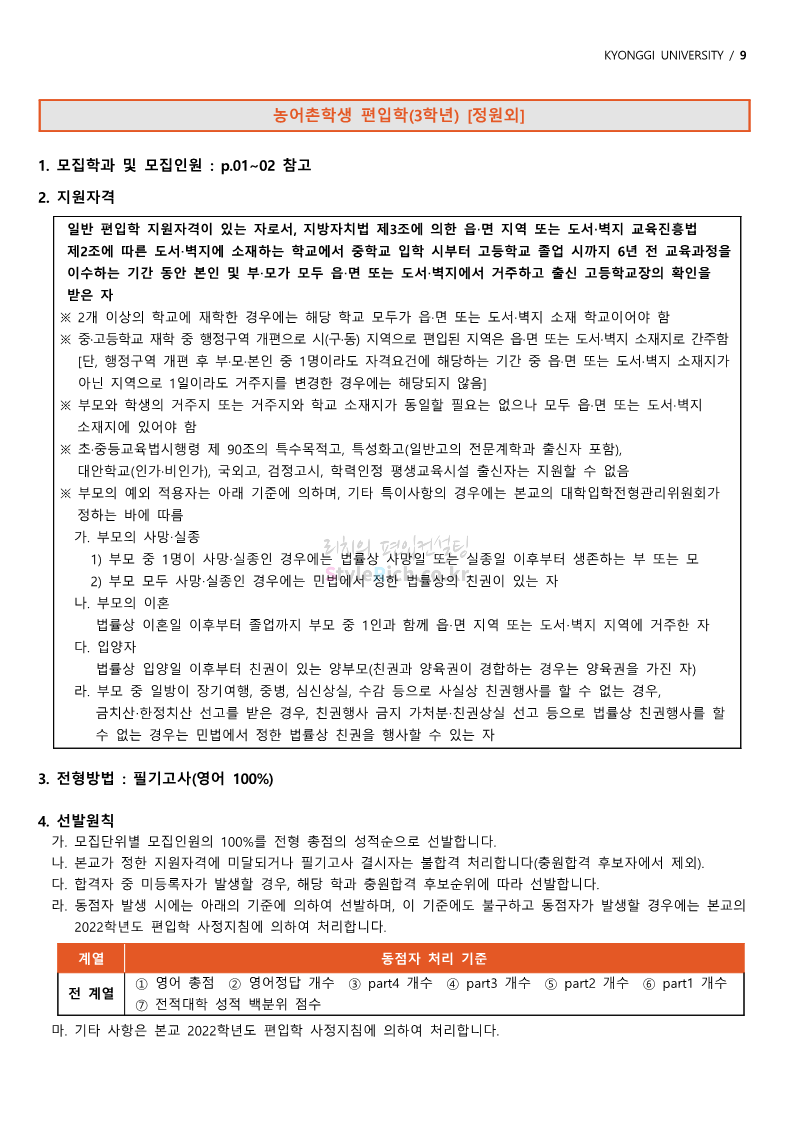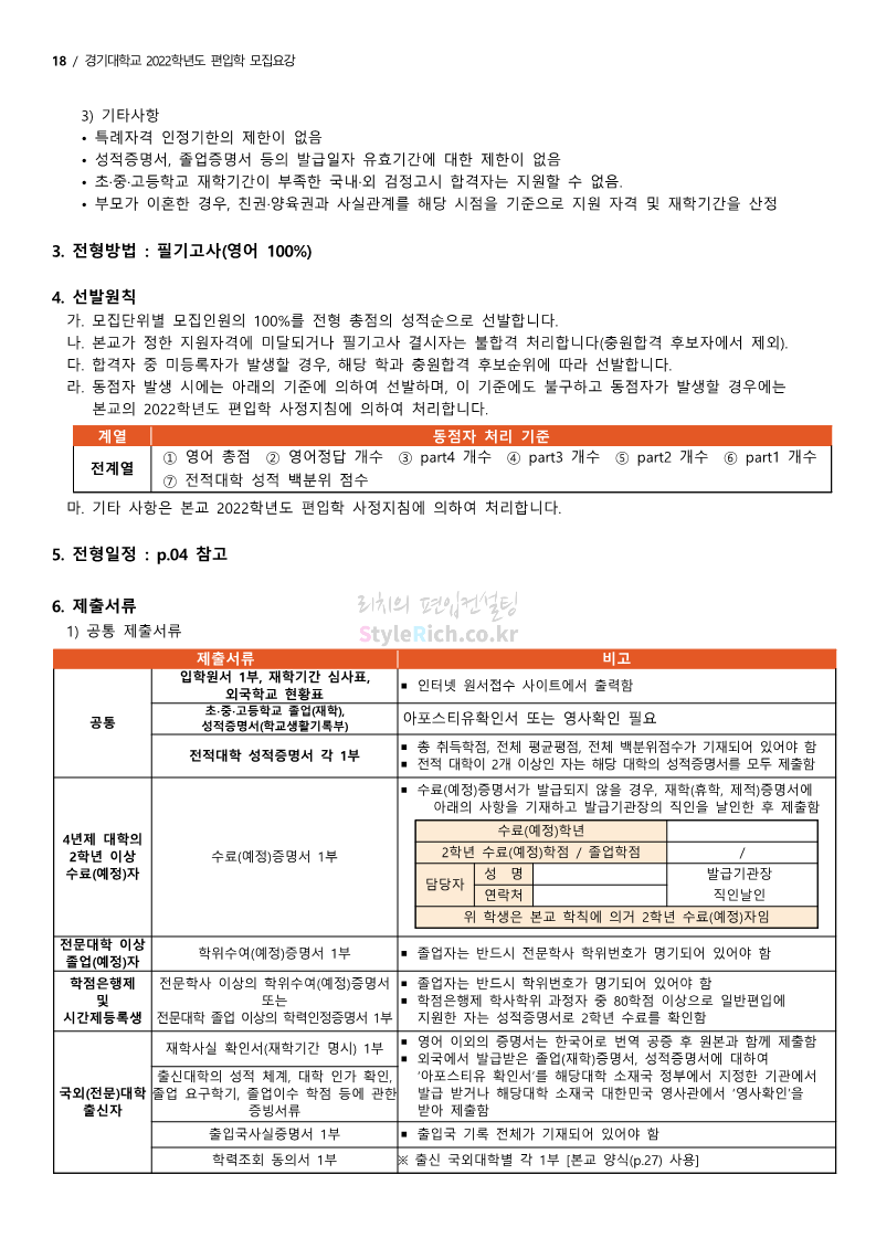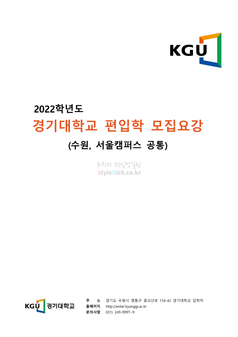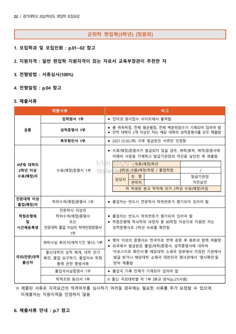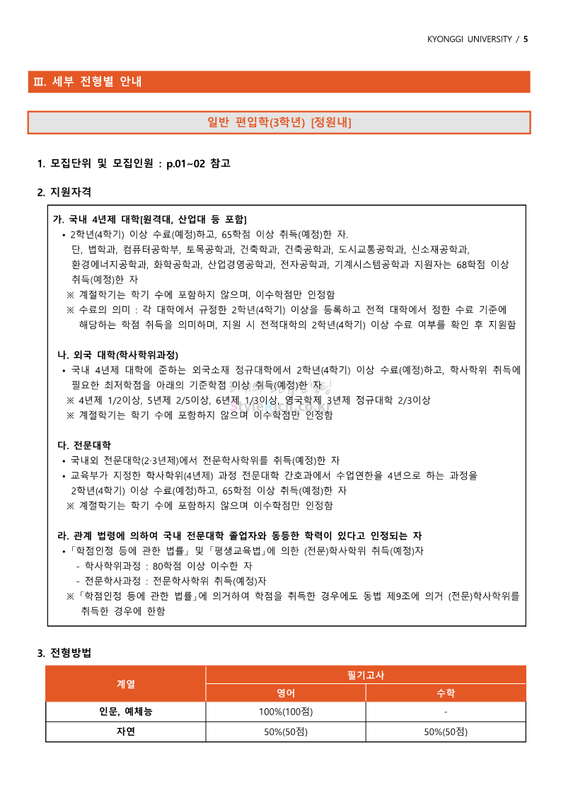 경기대 편입 2022학년도 모집요강을 간편하게 보자! 2021.12.01 21:52 편입 모집요강/2022학년도 모집요강 2022학년도 경기대 편입 모집요강(2021.12.01 기준)을 간편하게 확인하세요. * 최종 모집요강 발표 이후에도 내용의 일부가 변경될 수 있으니 지원 전 반드시 경기대 입학처의 모집요강을 확인 바랍니다. 2022학년도 경기대 편입 모집요강 다운받기 <출처: 경기대> [거북이라이프 - 동아리 체험편 EP.1 태풍] 공유하기 게시글 관리 리치의 편입컨설팅 저작자표시 비영리 변경금지 (새창열림) '편입 모집요강 > 2022학년도 모집요강' 카테고리의 다른 글 명지대 편입 2022학년도 모집요강 간편하게 보자! (0) 2021.12.01 고려대 편입 2022학년도 모집요강을 간편하게 보자! (0) 2021.12.01 강남대 편입 2022학년도 모집요강을 간편하게 보자! (0) 2021.12.01 연세대 편입 2022학년도 모집요강 간편하게 보자! (0) 2021.11.30 건국대 편입 2022학년도 모집요강 간편하게 보자! (0) 2021.11.30 댓글 공유하기 다른 글 댓글 이 글 공유하기 구독하기 구독하기 카카오톡 카카오톡 라인 라인 트위터 트위터 Facebook Facebook 카카오스토리 카카오스토리 밴드 밴드 네이버 블로그 네이버 블로그 Pocket Pocket Evernote Evernote 다른 글 명지대 편입 2022학년도 모집요강 간편하게 보자! 명지대 편입 2022학년도 모집요강 간편하게 보자! 2021.12.01 고려대 편입 2022학년도 모집요강을 간편하게 보자! 고려대 편입 2022학년도 모집요강을 간편하게 보자! 2021.12.01 강남대 편입 2022학년도 모집요강을 간편하게 보자! 강남대 편입 2022학년도 모집요강을 간편하게 보자! 2021.12.01 연세대 편입 2022학년도 모집요강 간편하게 보자! 연세대 편입 2022학년도 모집요강 간편하게 보자! 2021.11.30 다른 글 더 둘러보기