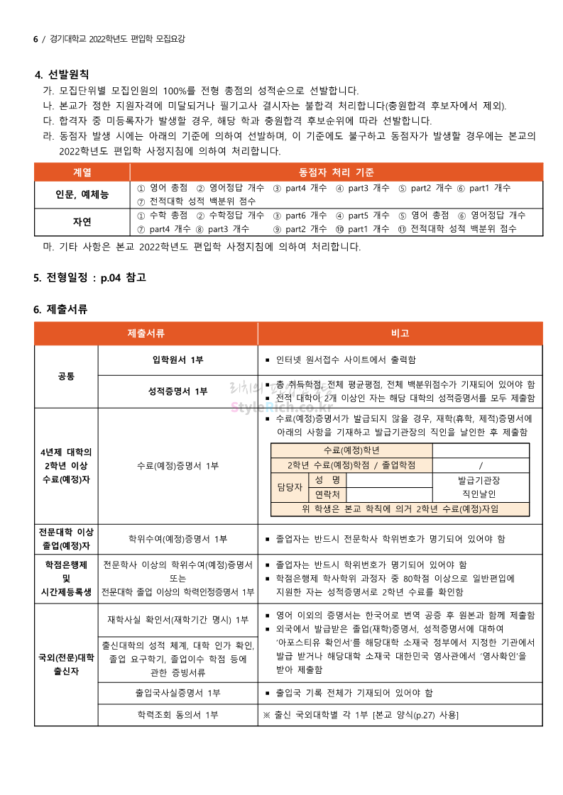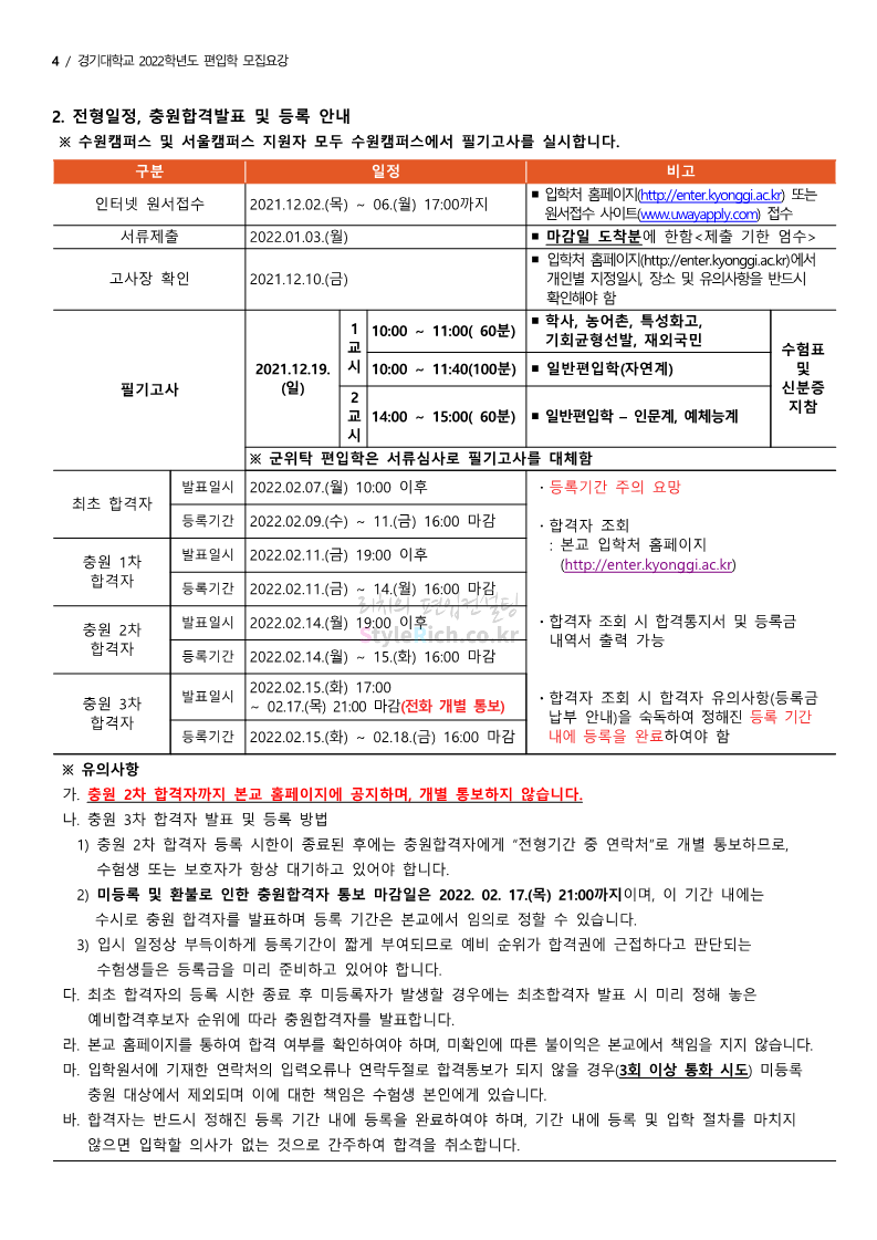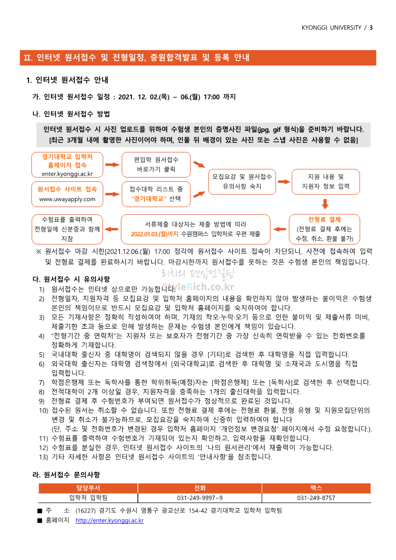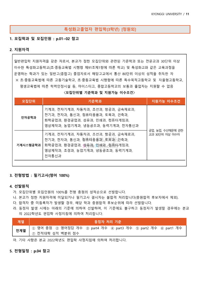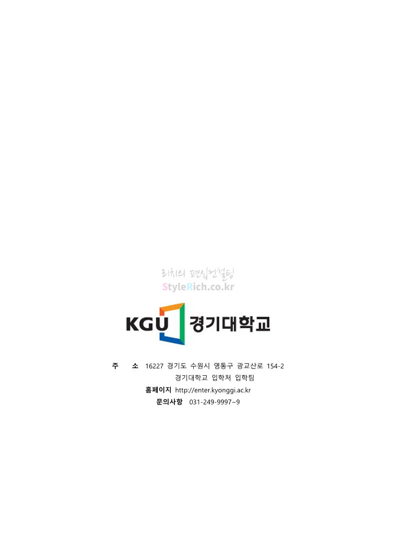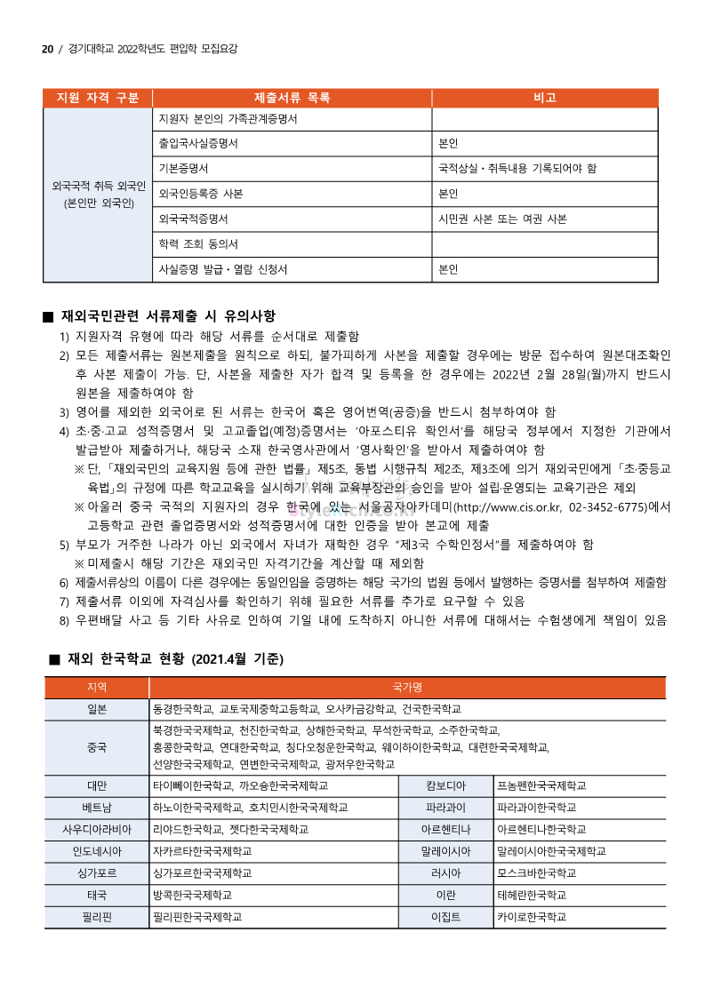 경기대 편입 2022학년도 모집요강을 간편하게 보자! 2021.12.01 21:52 편입 모집요강/2022학년도 모집요강 2022학년도 경기대 편입 모집요강(2021.12.01 기준)을 간편하게 확인하세요. * 최종 모집요강 발표 이후에도 내용의 일부가 변경될 수 있으니 지원 전 반드시 경기대 입학처의 모집요강을 확인 바랍니다. 2022학년도 경기대 편입 모집요강 다운받기 <출처: 경기대> [거북이라이프 - 동아리 체험편 EP.1 태풍] 공유하기 게시글 관리 리치의 편입컨설팅 저작자표시 비영리 변경금지 (새창열림) '편입 모집요강 > 2022학년도 모집요강' 카테고리의 다른 글 명지대 편입 2022학년도 모집요강 간편하게 보자! (0) 2021.12.01 고려대 편입 2022학년도 모집요강을 간편하게 보자! (0) 2021.12.01 강남대 편입 2022학년도 모집요강을 간편하게 보자! (0) 2021.12.01 연세대 편입 2022학년도 모집요강 간편하게 보자! (0) 2021.11.30 건국대 편입 2022학년도 모집요강 간편하게 보자! (0) 2021.11.30 댓글 공유하기 다른 글 댓글 이 글 공유하기 구독하기 구독하기 카카오톡 카카오톡 라인 라인 트위터 트위터 Facebook Facebook 카카오스토리 카카오스토리 밴드 밴드 네이버 블로그 네이버 블로그 Pocket Pocket Evernote Evernote 다른 글 명지대 편입 2022학년도 모집요강 간편하게 보자! 명지대 편입 2022학년도 모집요강 간편하게 보자! 2021.12.01 고려대 편입 2022학년도 모집요강을 간편하게 보자! 고려대 편입 2022학년도 모집요강을 간편하게 보자! 2021.12.01 강남대 편입 2022학년도 모집요강을 간편하게 보자! 강남대 편입 2022학년도 모집요강을 간편하게 보자! 2021.12.01 연세대 편입 2022학년도 모집요강 간편하게 보자! 연세대 편입 2022학년도 모집요강 간편하게 보자! 2021.11.30 다른 글 더 둘러보기
