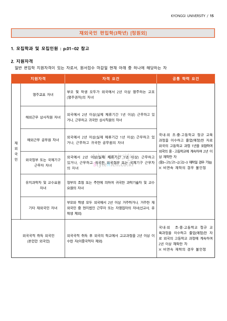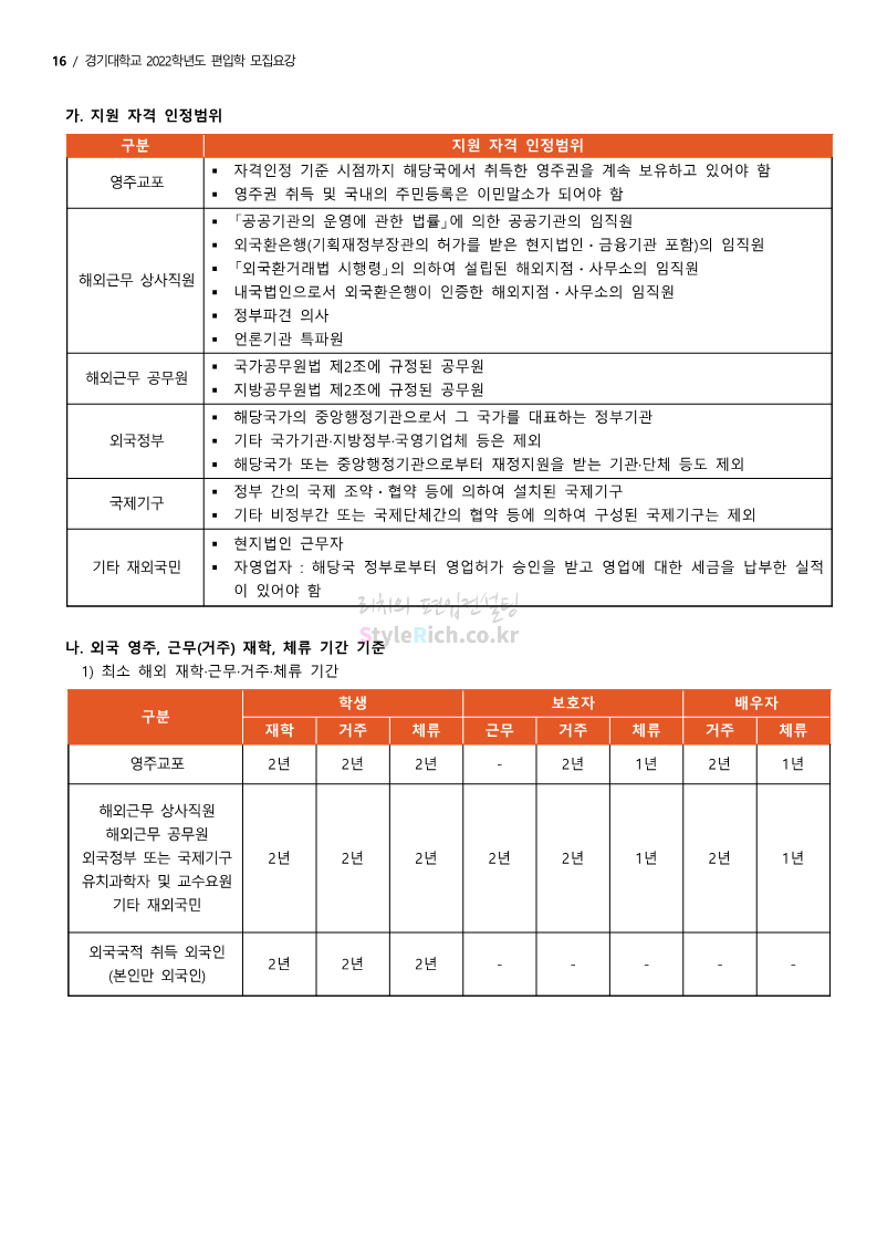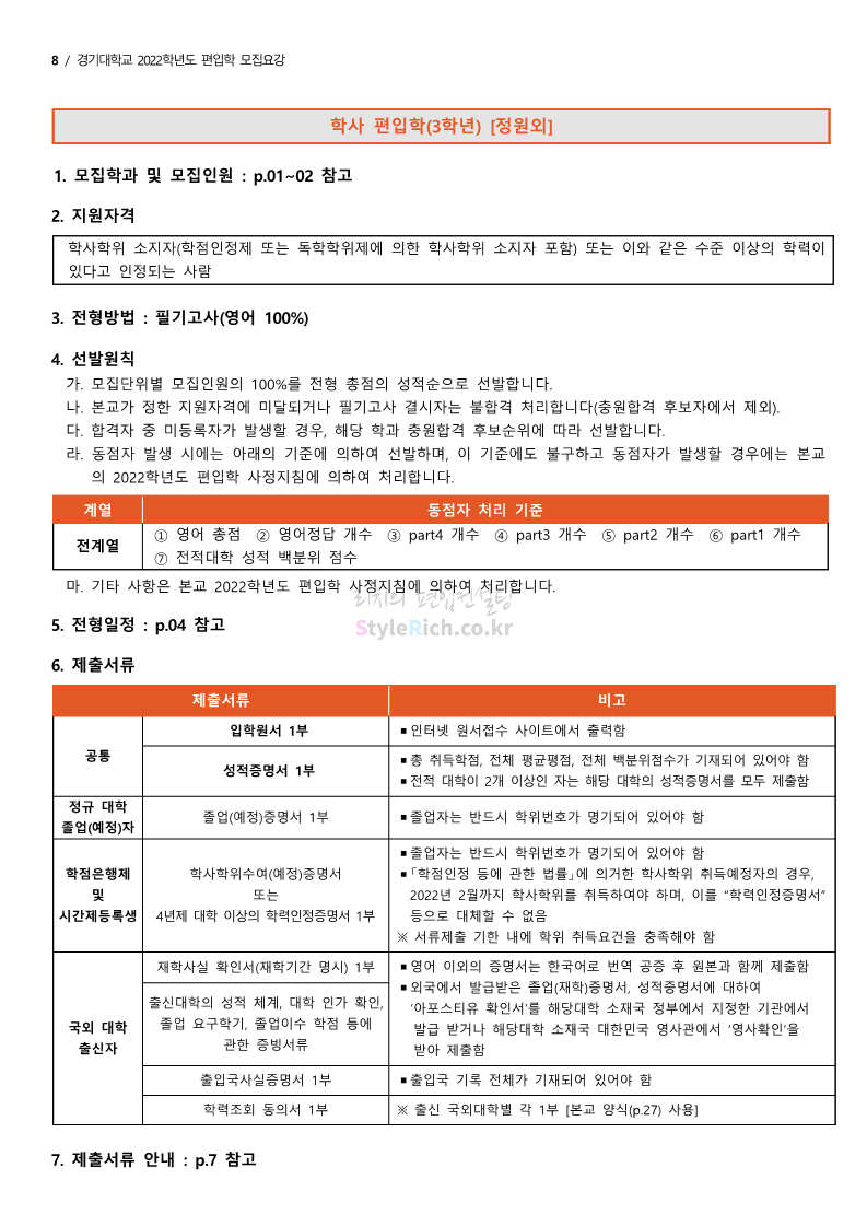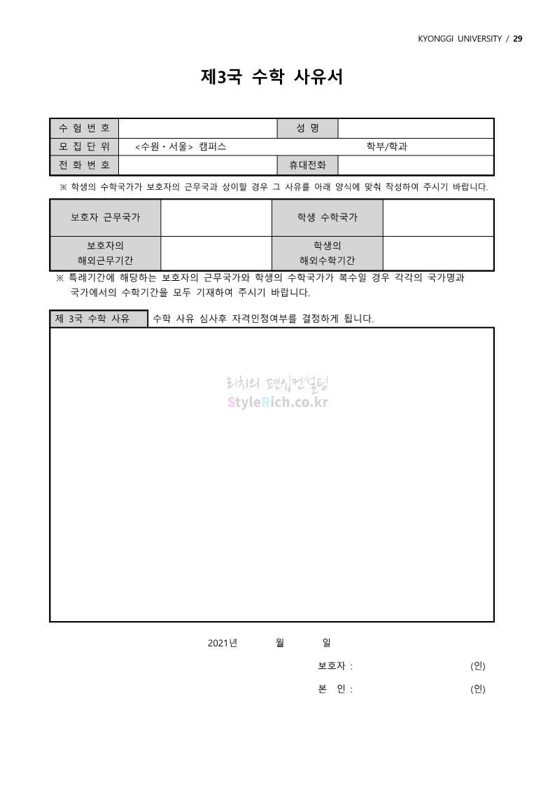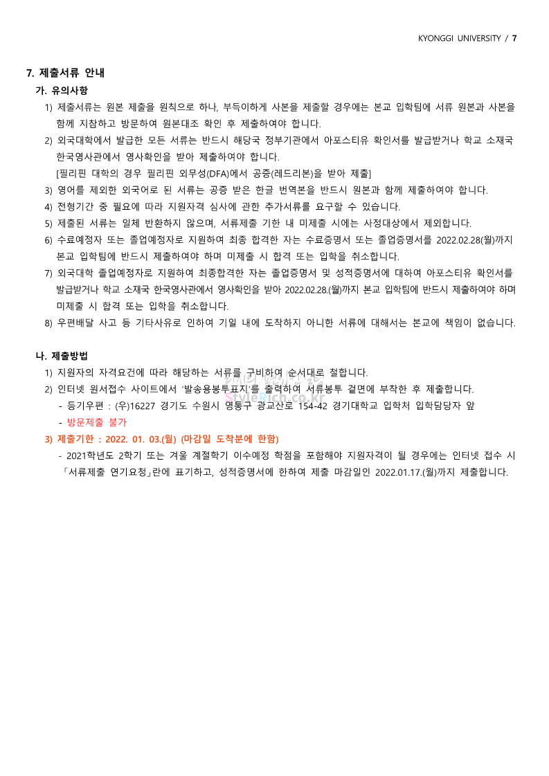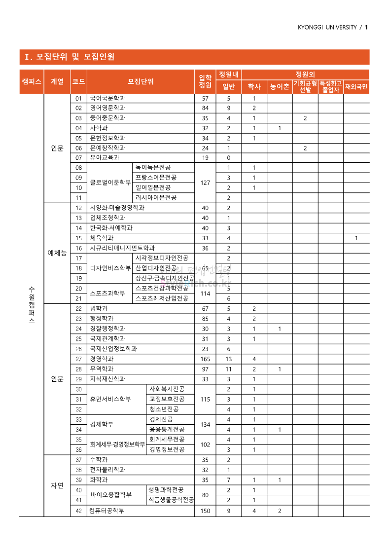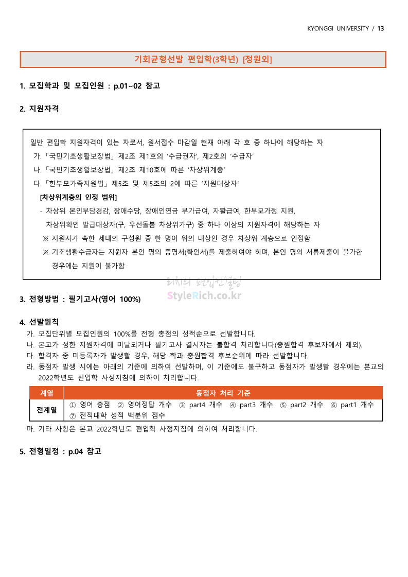 경기대 편입 2022학년도 모집요강을 간편하게 보자! 2021.12.01 21:52 편입 모집요강/2022학년도 모집요강 2022학년도 경기대 편입 모집요강(2021.12.01 기준)을 간편하게 확인하세요. * 최종 모집요강 발표 이후에도 내용의 일부가 변경될 수 있으니 지원 전 반드시 경기대 입학처의 모집요강을 확인 바랍니다. 2022학년도 경기대 편입 모집요강 다운받기 <출처: 경기대> [거북이라이프 - 동아리 체험편 EP.1 태풍] 공유하기 게시글 관리 리치의 편입컨설팅 저작자표시 비영리 변경금지 (새창열림) '편입 모집요강 > 2022학년도 모집요강' 카테고리의 다른 글 명지대 편입 2022학년도 모집요강 간편하게 보자! (0) 2021.12.01 고려대 편입 2022학년도 모집요강을 간편하게 보자! (0) 2021.12.01 강남대 편입 2022학년도 모집요강을 간편하게 보자! (0) 2021.12.01 연세대 편입 2022학년도 모집요강 간편하게 보자! (0) 2021.11.30 건국대 편입 2022학년도 모집요강 간편하게 보자! (0) 2021.11.30 댓글 공유하기 다른 글 댓글 이 글 공유하기 구독하기 구독하기 카카오톡 카카오톡 라인 라인 트위터 트위터 Facebook Facebook 카카오스토리 카카오스토리 밴드 밴드 네이버 블로그 네이버 블로그 Pocket Pocket Evernote Evernote 다른 글 명지대 편입 2022학년도 모집요강 간편하게 보자! 명지대 편입 2022학년도 모집요강 간편하게 보자! 2021.12.01 고려대 편입 2022학년도 모집요강을 간편하게 보자! 고려대 편입 2022학년도 모집요강을 간편하게 보자! 2021.12.01 강남대 편입 2022학년도 모집요강을 간편하게 보자! 강남대 편입 2022학년도 모집요강을 간편하게 보자! 2021.12.01 연세대 편입 2022학년도 모집요강 간편하게 보자! 연세대 편입 2022학년도 모집요강 간편하게 보자! 2021.11.30 다른 글 더 둘러보기