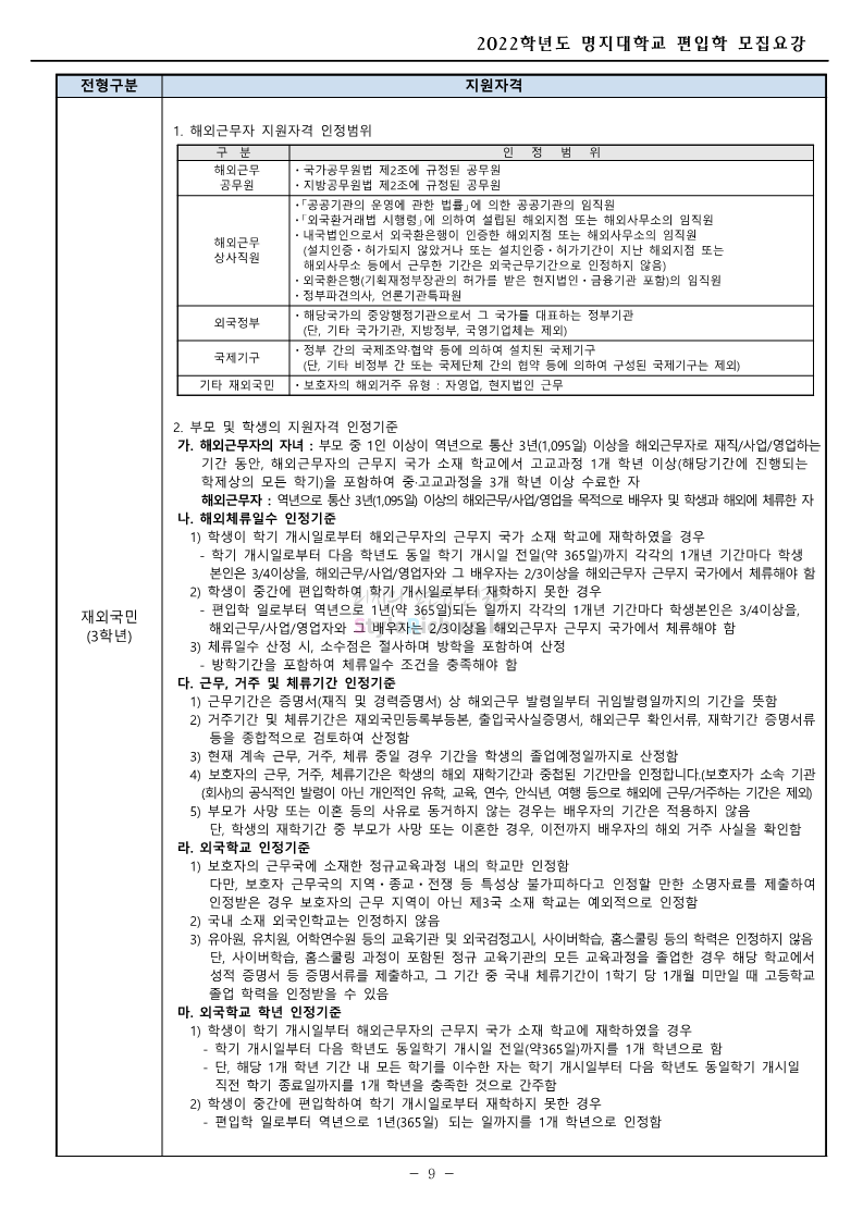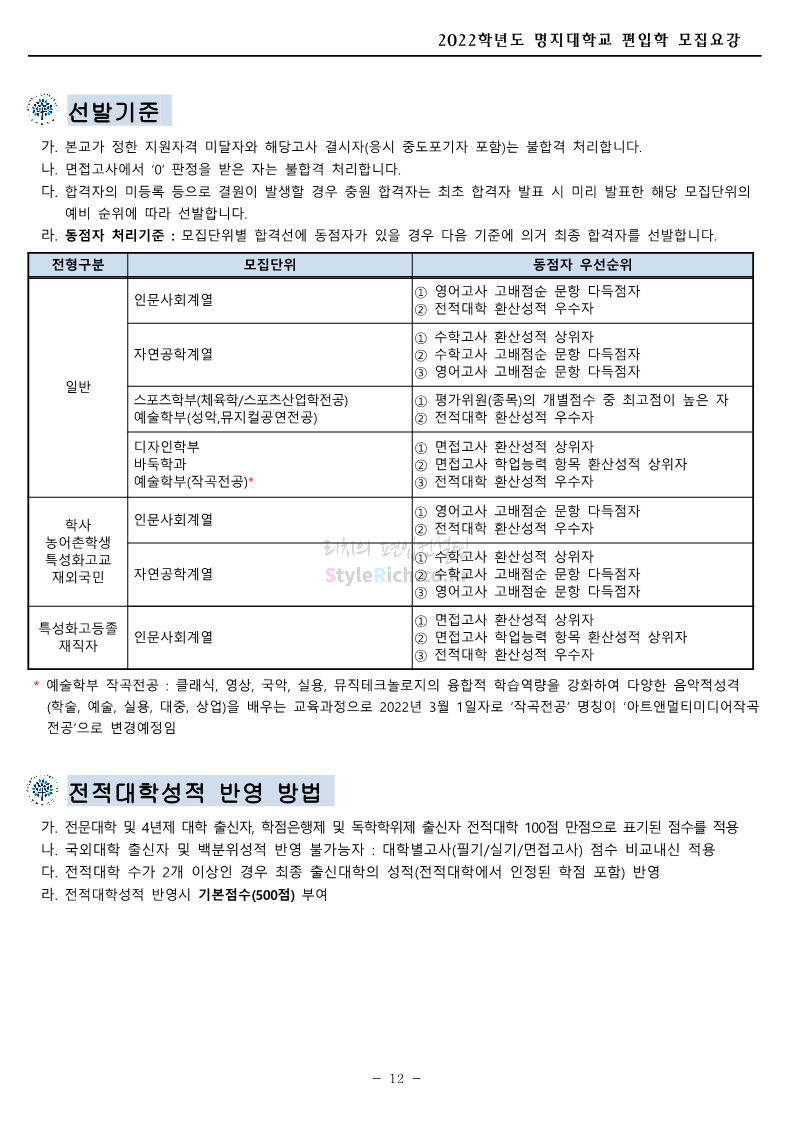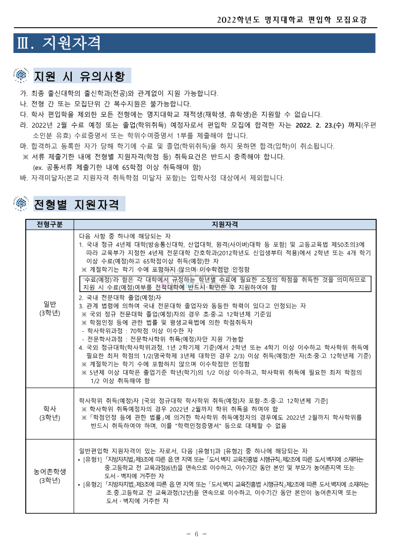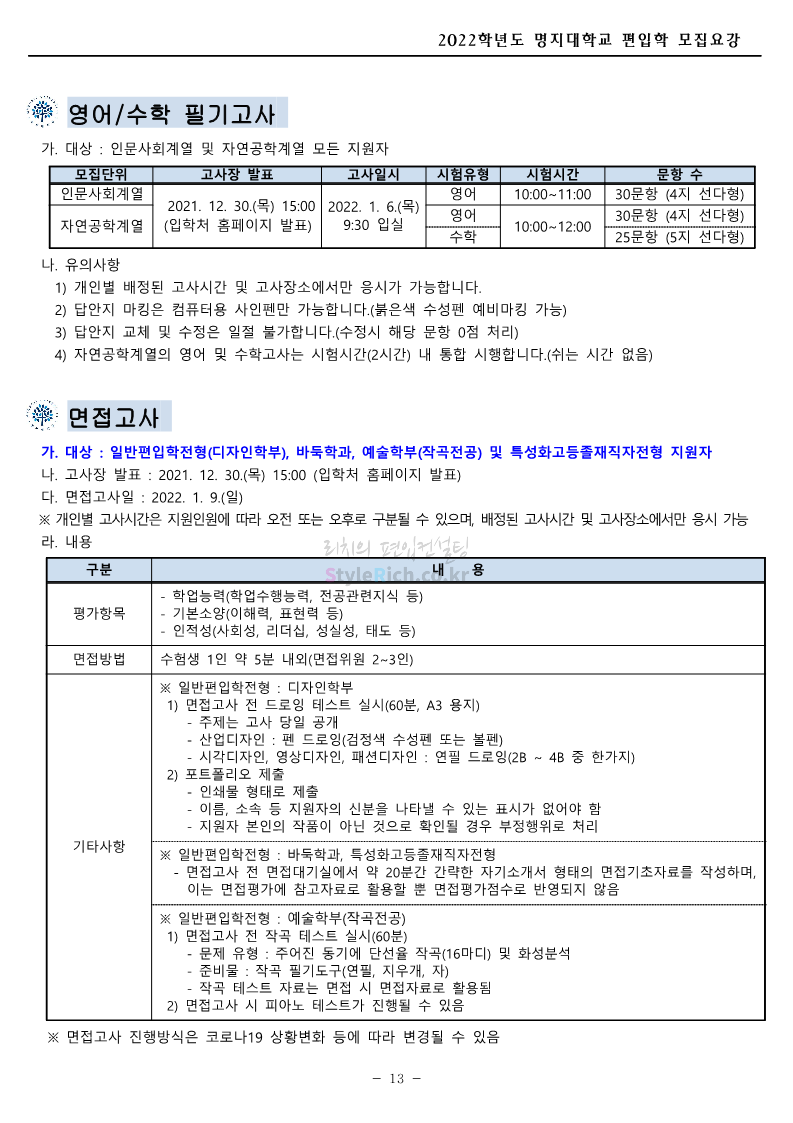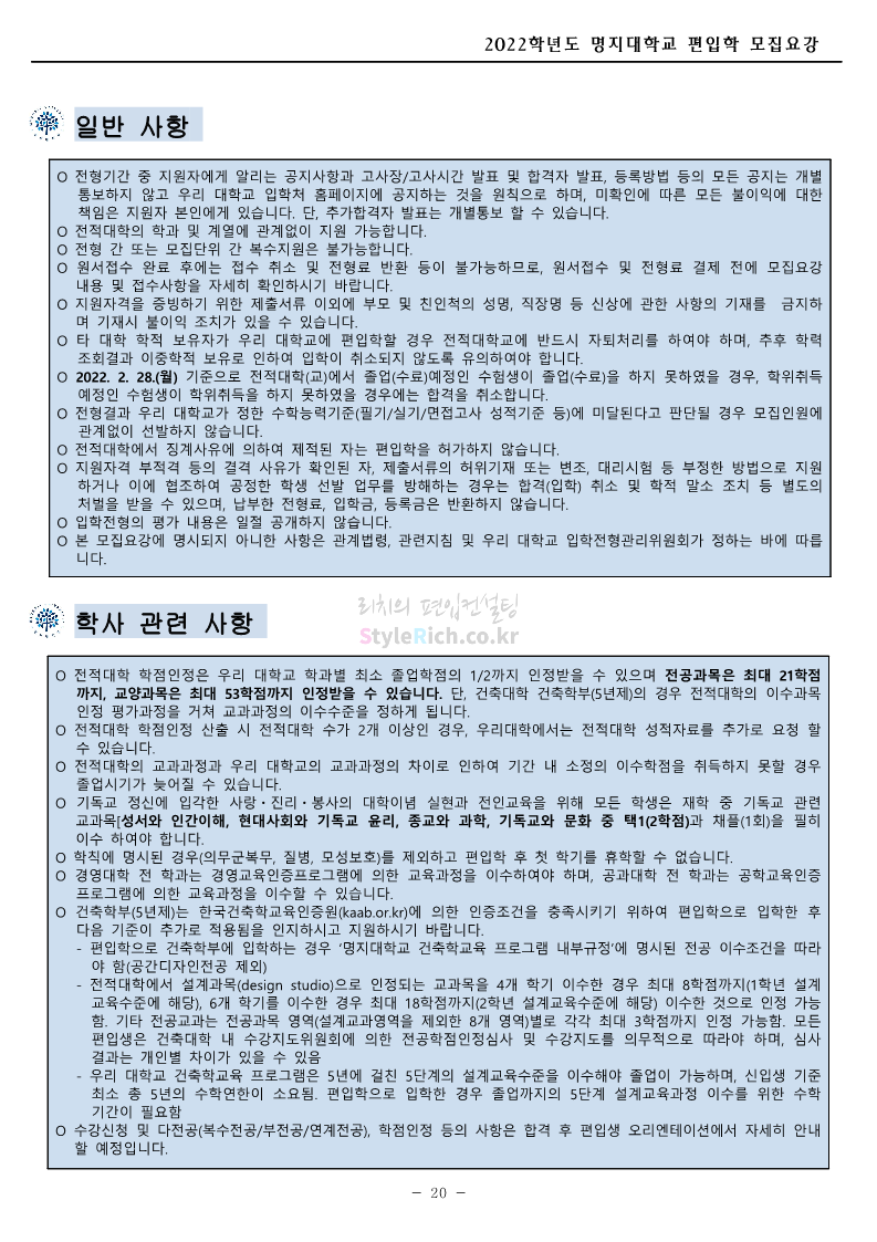 명지대 편입 2022학년도 모집요강 간편하게 보자! 2021.12.01 22:33 편입 모집요강/2022학년도 모집요강 2022학년도 명지대 편입 모집요강(2021.12.01 기준)을 간편하게 확인하세요. * 최종 모집요강 발표 이후에도 내용의 일부가 변경될 수 있으니 지원 전 반드시 명지대 입학처의 모집요강을 확인 바랍니다. 2022학년도 명지대 편입 모집요강 다운받기 <출처: 명지대> [홍보기자단] 명지대학교 자연캠퍼스 단풍길 Vlog🍁(feat.면접시즌) | 명지대에는 한옥이 있다?! | 자캠의 포토스팟📷 공유하기 게시글 관리 리치의 편입컨설팅 저작자표시 비영리 변경금지 (새창열림) '편입 모집요강 > 2022학년도 모집요강' 카테고리의 다른 글 가톨릭대 편입 2022학년도 모집요강 간편하게 보자! (0) 2021.12.02 홍익대 편입 2022학년도 모집요강 간편하게 보자! (0) 2021.12.01 고려대 편입 2022학년도 모집요강을 간편하게 보자! (0) 2021.12.01 경기대 편입 2022학년도 모집요강을 간편하게 보자! (0) 2021.12.01 강남대 편입 2022학년도 모집요강을 간편하게 보자! (0) 2021.12.01 댓글 공유하기 다른 글 댓글 이 글 공유하기 구독하기 구독하기 카카오톡 카카오톡 라인 라인 트위터 트위터 Facebook Facebook 카카오스토리 카카오스토리 밴드 밴드 네이버 블로그 네이버 블로그 Pocket Pocket Evernote Evernote 다른 글 가톨릭대 편입 2022학년도 모집요강 간편하게 보자! 가톨릭대 편입 2022학년도 모집요강 간편하게 보자! 2021.12.02 홍익대 편입 2022학년도 모집요강 간편하게 보자! 홍익대 편입 2022학년도 모집요강 간편하게 보자! 2021.12.01 고려대 편입 2022학년도 모집요강을 간편하게 보자! 고려대 편입 2022학년도 모집요강을 간편하게 보자! 2021.12.01 경기대 편입 2022학년도 모집요강을 간편하게 보자! 경기대 편입 2022학년도 모집요강을 간편하게 보자! 2021.12.01 다른 글 더 둘러보기