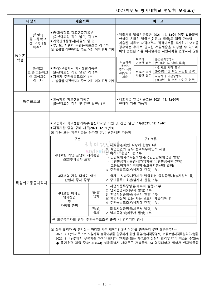 명지대 편입 2022학년도 모집요강 간편하게 보자! 2021.12.01 22:33 편입 모집요강/2022학년도 모집요강 2022학년도 명지대 편입 모집요강(2021.12.01 기준)을 간편하게 확인하세요. * 최종 모집요강 발표 이후에도 내용의 일부가 변경될 수 있으니 지원 전 반드시 명지대 입학처의 모집요강을 확인 바랍니다. 2022학년도 명지대 편입 모집요강 다운받기 <출처: 명지대> [홍보기자단] 명지대학교 자연캠퍼스 단풍길 Vlog🍁(feat.면접시즌) | 명지대에는 한옥이 있다?! | 자캠의 포토스팟📷 공유하기 게시글 관리 리치의 편입컨설팅 저작자표시 비영리 변경금지 (새창열림) '편입 모집요강 > 2022학년도 모집요강' 카테고리의 다른 글 가톨릭대 편입 2022학년도 모집요강 간편하게 보자! (0) 2021.12.02 홍익대 편입 2022학년도 모집요강 간편하게 보자! (0) 2021.12.01 고려대 편입 2022학년도 모집요강을 간편하게 보자! (0) 2021.12.01 경기대 편입 2022학년도 모집요강을 간편하게 보자! (0) 2021.12.01 강남대 편입 2022학년도 모집요강을 간편하게 보자! (0) 2021.12.01 댓글 공유하기 다른 글 댓글 이 글 공유하기 구독하기 구독하기 카카오톡 카카오톡 라인 라인 트위터 트위터 Facebook Facebook 카카오스토리 카카오스토리 밴드 밴드 네이버 블로그 네이버 블로그 Pocket Pocket Evernote Evernote 다른 글 가톨릭대 편입 2022학년도 모집요강 간편하게 보자! 가톨릭대 편입 2022학년도 모집요강 간편하게 보자! 2021.12.02 홍익대 편입 2022학년도 모집요강 간편하게 보자! 홍익대 편입 2022학년도 모집요강 간편하게 보자! 2021.12.01 고려대 편입 2022학년도 모집요강을 간편하게 보자! 고려대 편입 2022학년도 모집요강을 간편하게 보자! 2021.12.01 경기대 편입 2022학년도 모집요강을 간편하게 보자! 경기대 편입 2022학년도 모집요강을 간편하게 보자! 2021.12.01 다른 글 더 둘러보기