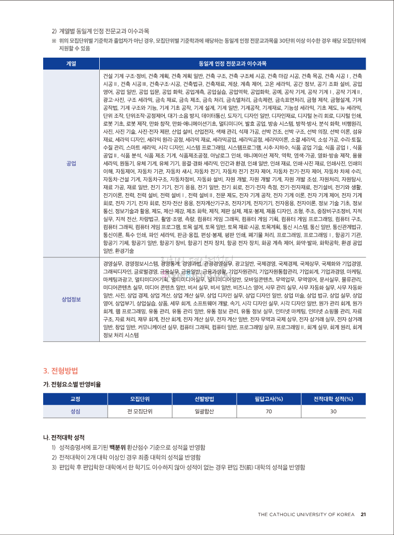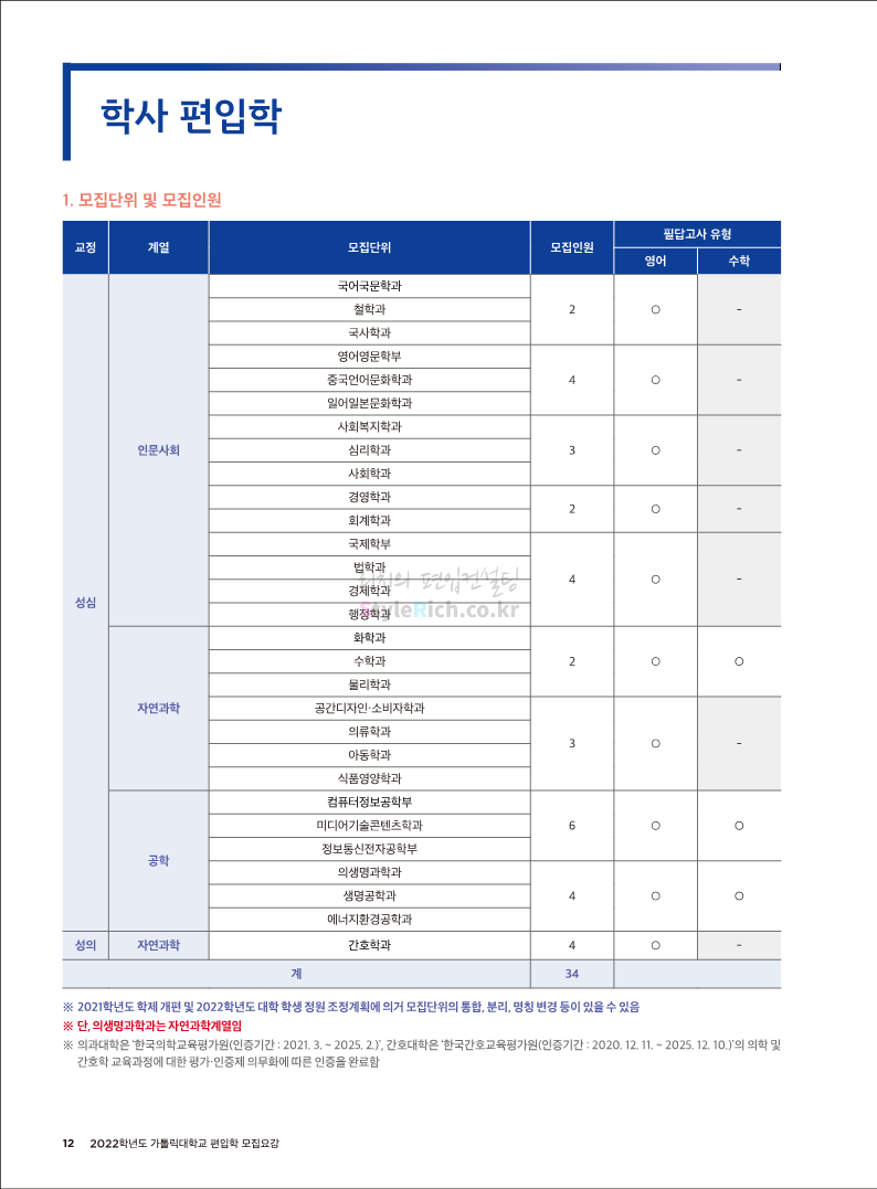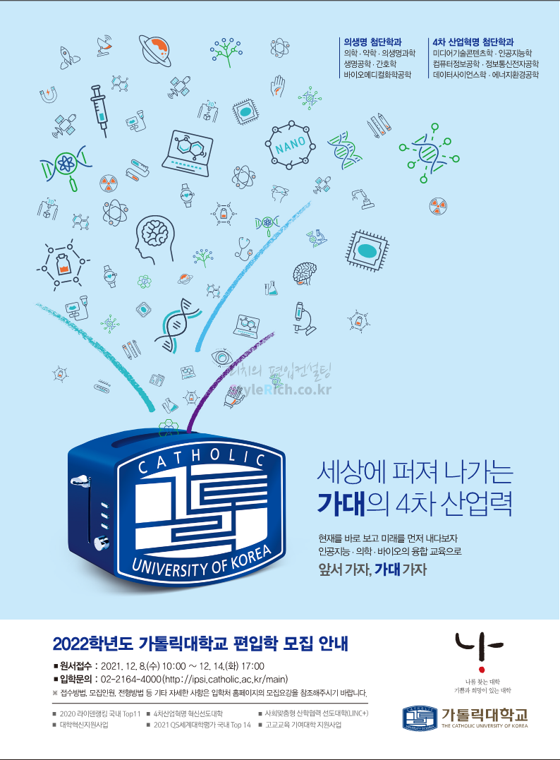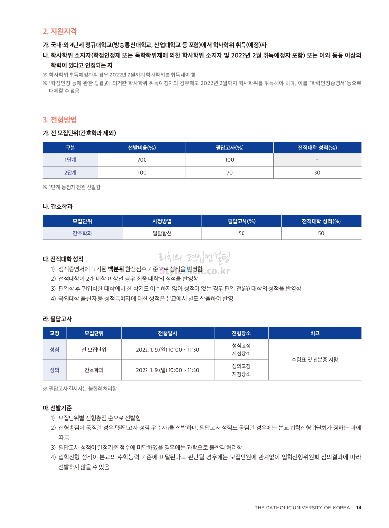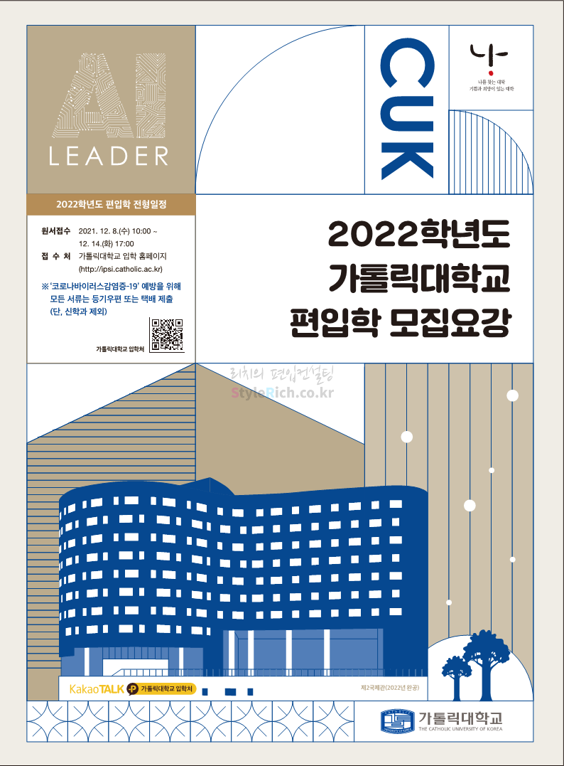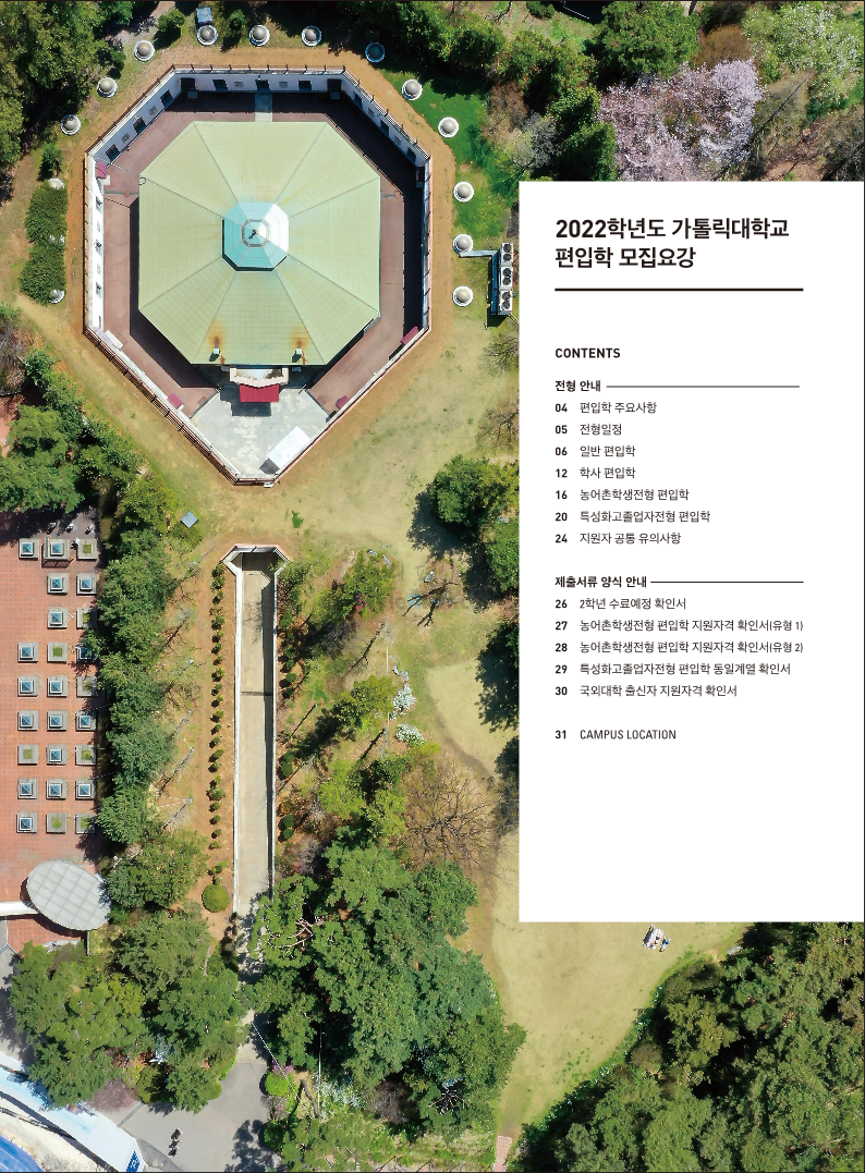 가톨릭대 편입 2022학년도 모집요강 간편하게 보자! 2021.12.02 20:50 편입 모집요강/2022학년도 모집요강 2022학년도 가톨릭대 편입 모집요강(2021.12.02 기준)을 간편하게 확인하세요. * 최종 모집요강 발표 이후에도 내용의 일부가 변경될 수 있으니 지원 전 반드시 가톨릭대 입학처의 모집요강을 확인 바랍니다. 2022학년도 가톨릭대 편입 모집요강 다운받기 <출처: 가톨릭대> 가톨릭대학교 홍보 영상_KOR (2021ver) 공유하기 게시글 관리 리치의 편입컨설팅 저작자표시 비영리 변경금지 (새창열림) '편입 모집요강 > 2022학년도 모집요강' 카테고리의 다른 글 서울과학기술대 편입 2022학년도 모집요강 간편하게 보자! (0) 2021.12.04 광운대 편입 2022학년도 모집요강 간편하게 보자 (0) 2021.12.02 홍익대 편입 2022학년도 모집요강 간편하게 보자! (0) 2021.12.01 명지대 편입 2022학년도 모집요강 간편하게 보자! (0) 2021.12.01 고려대 편입 2022학년도 모집요강을 간편하게 보자! (0) 2021.12.01 댓글 공유하기 다른 글 댓글 이 글 공유하기 구독하기 구독하기 카카오톡 카카오톡 라인 라인 트위터 트위터 Facebook Facebook 카카오스토리 카카오스토리 밴드 밴드 네이버 블로그 네이버 블로그 Pocket Pocket Evernote Evernote 다른 글 서울과학기술대 편입 2022학년도 모집요강 간편하게 보자! 서울과학기술대 편입 2022학년도 모집요강 간편하게 보자! 2021.12.04 광운대 편입 2022학년도 모집요강 간편하게 보자 광운대 편입 2022학년도 모집요강 간편하게 보자 2021.12.02 홍익대 편입 2022학년도 모집요강 간편하게 보자! 홍익대 편입 2022학년도 모집요강 간편하게 보자! 2021.12.01 명지대 편입 2022학년도 모집요강 간편하게 보자! 명지대 편입 2022학년도 모집요강 간편하게 보자! 2021.12.01 다른 글 더 둘러보기