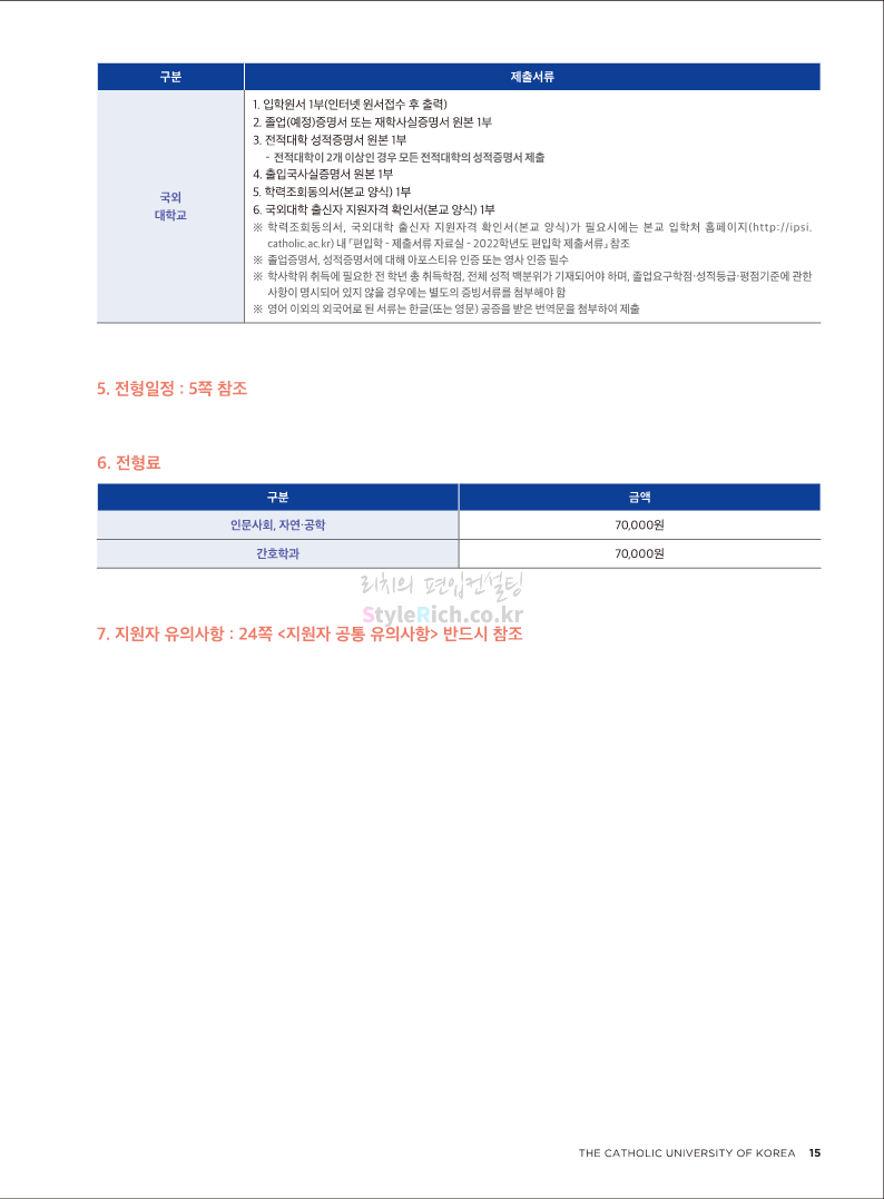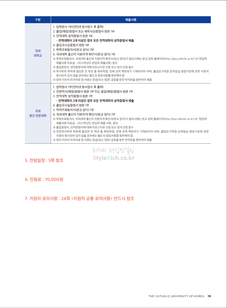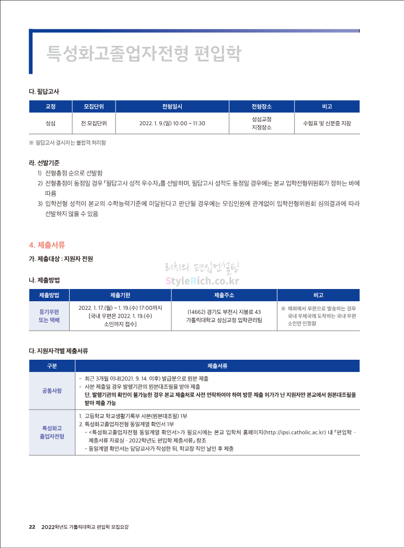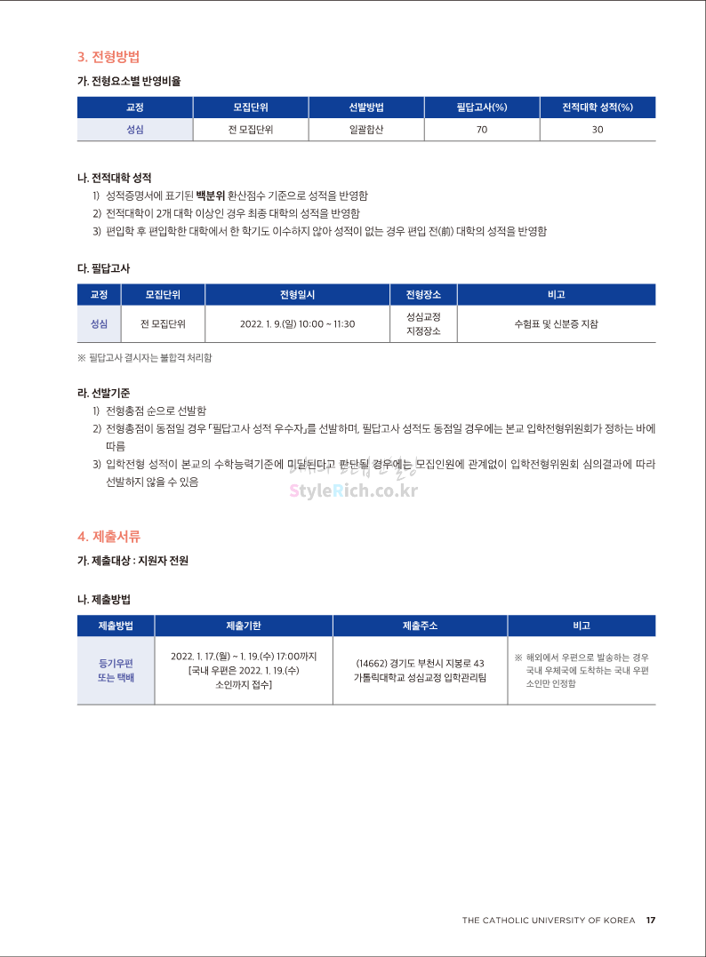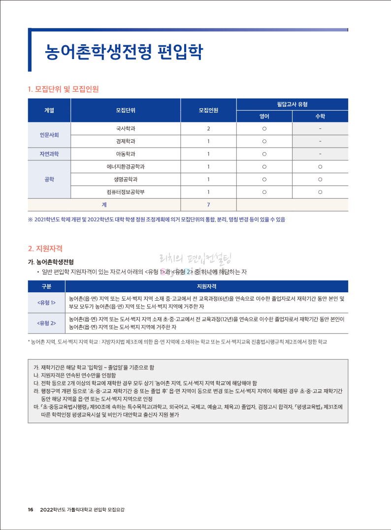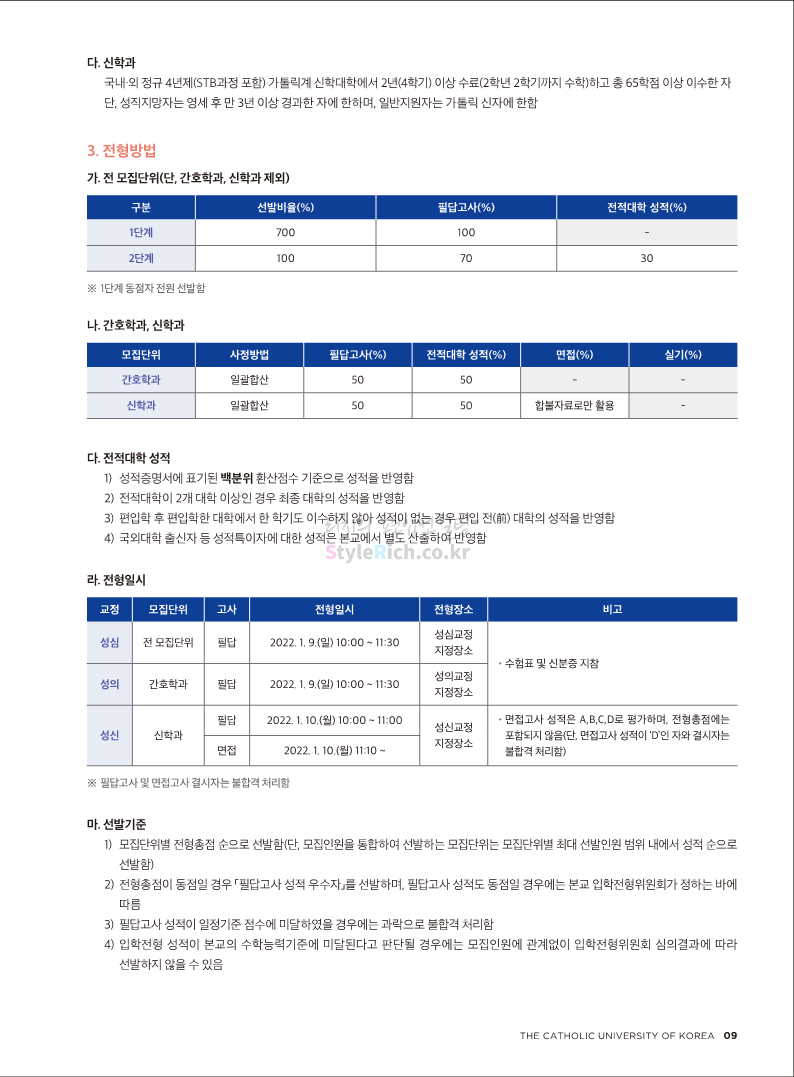 가톨릭대 편입 2022학년도 모집요강 간편하게 보자! 2021.12.02 20:50 편입 모집요강/2022학년도 모집요강 2022학년도 가톨릭대 편입 모집요강(2021.12.02 기준)을 간편하게 확인하세요. * 최종 모집요강 발표 이후에도 내용의 일부가 변경될 수 있으니 지원 전 반드시 가톨릭대 입학처의 모집요강을 확인 바랍니다. 2022학년도 가톨릭대 편입 모집요강 다운받기 <출처: 가톨릭대> 가톨릭대학교 홍보 영상_KOR (2021ver) 공유하기 게시글 관리 리치의 편입컨설팅 저작자표시 비영리 변경금지 (새창열림) '편입 모집요강 > 2022학년도 모집요강' 카테고리의 다른 글 서울과학기술대 편입 2022학년도 모집요강 간편하게 보자! (0) 2021.12.04 광운대 편입 2022학년도 모집요강 간편하게 보자 (0) 2021.12.02 홍익대 편입 2022학년도 모집요강 간편하게 보자! (0) 2021.12.01 명지대 편입 2022학년도 모집요강 간편하게 보자! (0) 2021.12.01 고려대 편입 2022학년도 모집요강을 간편하게 보자! (0) 2021.12.01 댓글 공유하기 다른 글 댓글 이 글 공유하기 구독하기 구독하기 카카오톡 카카오톡 라인 라인 트위터 트위터 Facebook Facebook 카카오스토리 카카오스토리 밴드 밴드 네이버 블로그 네이버 블로그 Pocket Pocket Evernote Evernote 다른 글 서울과학기술대 편입 2022학년도 모집요강 간편하게 보자! 서울과학기술대 편입 2022학년도 모집요강 간편하게 보자! 2021.12.04 광운대 편입 2022학년도 모집요강 간편하게 보자 광운대 편입 2022학년도 모집요강 간편하게 보자 2021.12.02 홍익대 편입 2022학년도 모집요강 간편하게 보자! 홍익대 편입 2022학년도 모집요강 간편하게 보자! 2021.12.01 명지대 편입 2022학년도 모집요강 간편하게 보자! 명지대 편입 2022학년도 모집요강 간편하게 보자! 2021.12.01 다른 글 더 둘러보기
