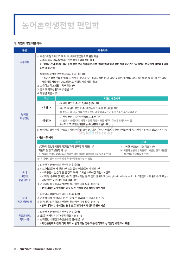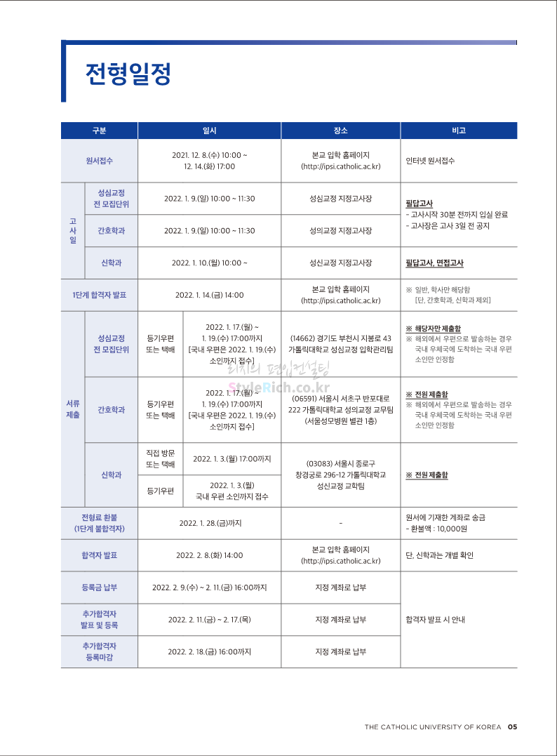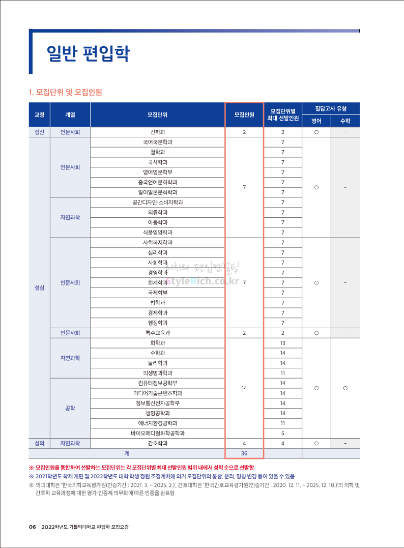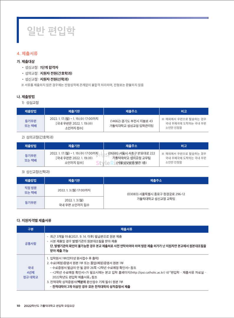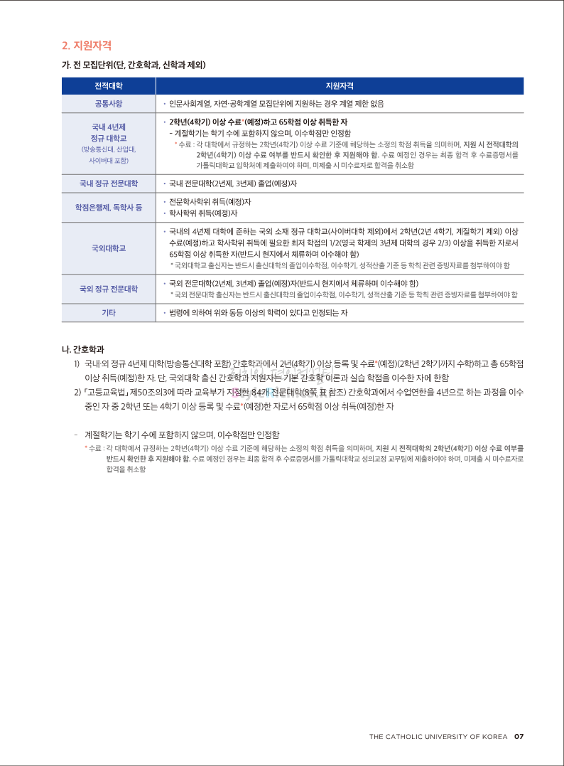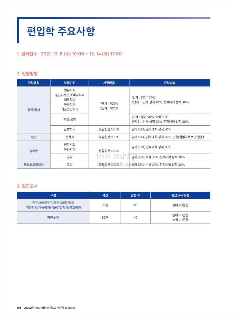 가톨릭대 편입 2022학년도 모집요강 간편하게 보자! 2021.12.02 20:50 편입 모집요강/2022학년도 모집요강 2022학년도 가톨릭대 편입 모집요강(2021.12.02 기준)을 간편하게 확인하세요. * 최종 모집요강 발표 이후에도 내용의 일부가 변경될 수 있으니 지원 전 반드시 가톨릭대 입학처의 모집요강을 확인 바랍니다. 2022학년도 가톨릭대 편입 모집요강 다운받기 <출처: 가톨릭대> 가톨릭대학교 홍보 영상_KOR (2021ver) 공유하기 게시글 관리 리치의 편입컨설팅 저작자표시 비영리 변경금지 (새창열림) '편입 모집요강 > 2022학년도 모집요강' 카테고리의 다른 글 서울과학기술대 편입 2022학년도 모집요강 간편하게 보자! (0) 2021.12.04 광운대 편입 2022학년도 모집요강 간편하게 보자 (0) 2021.12.02 홍익대 편입 2022학년도 모집요강 간편하게 보자! (0) 2021.12.01 명지대 편입 2022학년도 모집요강 간편하게 보자! (0) 2021.12.01 고려대 편입 2022학년도 모집요강을 간편하게 보자! (0) 2021.12.01 댓글 공유하기 다른 글 댓글 이 글 공유하기 구독하기 구독하기 카카오톡 카카오톡 라인 라인 트위터 트위터 Facebook Facebook 카카오스토리 카카오스토리 밴드 밴드 네이버 블로그 네이버 블로그 Pocket Pocket Evernote Evernote 다른 글 서울과학기술대 편입 2022학년도 모집요강 간편하게 보자! 서울과학기술대 편입 2022학년도 모집요강 간편하게 보자! 2021.12.04 광운대 편입 2022학년도 모집요강 간편하게 보자 광운대 편입 2022학년도 모집요강 간편하게 보자 2021.12.02 홍익대 편입 2022학년도 모집요강 간편하게 보자! 홍익대 편입 2022학년도 모집요강 간편하게 보자! 2021.12.01 명지대 편입 2022학년도 모집요강 간편하게 보자! 명지대 편입 2022학년도 모집요강 간편하게 보자! 2021.12.01 다른 글 더 둘러보기
