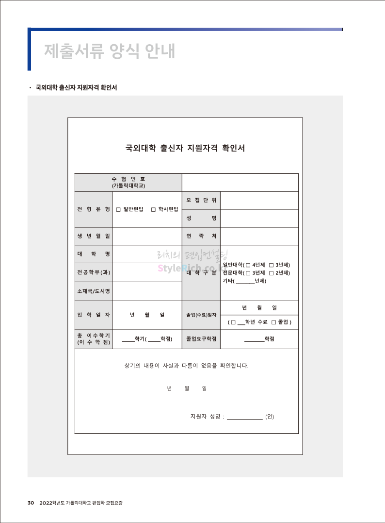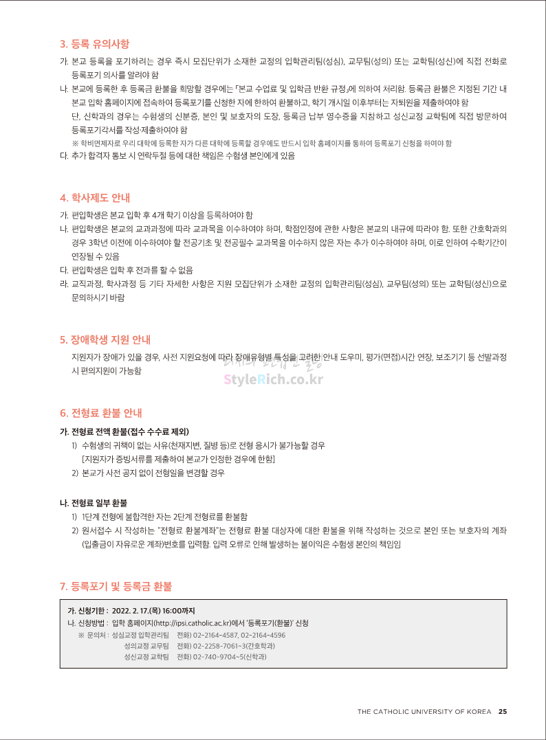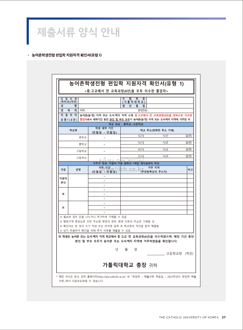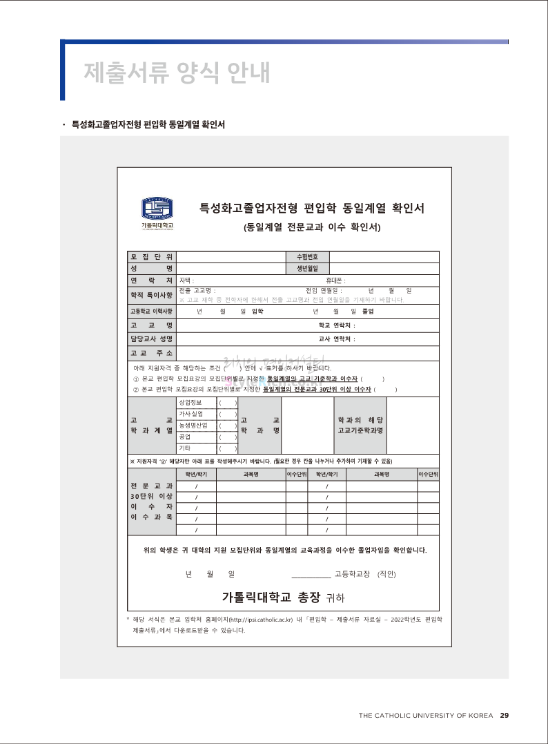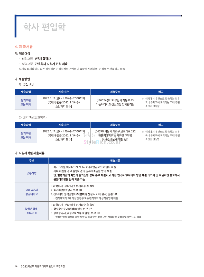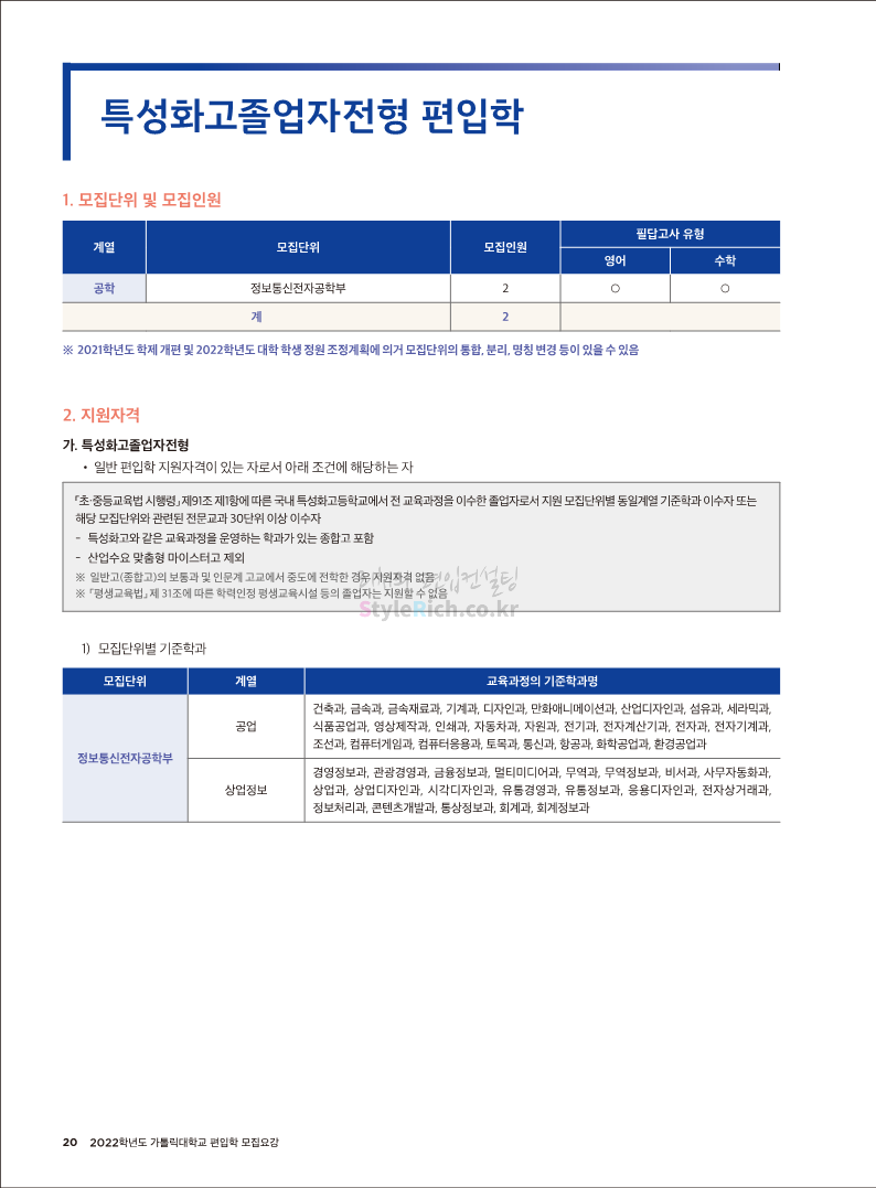 가톨릭대 편입 2022학년도 모집요강 간편하게 보자! 2021.12.02 20:50 편입 모집요강/2022학년도 모집요강 2022학년도 가톨릭대 편입 모집요강(2021.12.02 기준)을 간편하게 확인하세요. * 최종 모집요강 발표 이후에도 내용의 일부가 변경될 수 있으니 지원 전 반드시 가톨릭대 입학처의 모집요강을 확인 바랍니다. 2022학년도 가톨릭대 편입 모집요강 다운받기 <출처: 가톨릭대> 가톨릭대학교 홍보 영상_KOR (2021ver) 공유하기 게시글 관리 리치의 편입컨설팅 저작자표시 비영리 변경금지 (새창열림) '편입 모집요강 > 2022학년도 모집요강' 카테고리의 다른 글 서울과학기술대 편입 2022학년도 모집요강 간편하게 보자! (0) 2021.12.04 광운대 편입 2022학년도 모집요강 간편하게 보자 (0) 2021.12.02 홍익대 편입 2022학년도 모집요강 간편하게 보자! (0) 2021.12.01 명지대 편입 2022학년도 모집요강 간편하게 보자! (0) 2021.12.01 고려대 편입 2022학년도 모집요강을 간편하게 보자! (0) 2021.12.01 댓글 공유하기 다른 글 댓글 이 글 공유하기 구독하기 구독하기 카카오톡 카카오톡 라인 라인 트위터 트위터 Facebook Facebook 카카오스토리 카카오스토리 밴드 밴드 네이버 블로그 네이버 블로그 Pocket Pocket Evernote Evernote 다른 글 서울과학기술대 편입 2022학년도 모집요강 간편하게 보자! 서울과학기술대 편입 2022학년도 모집요강 간편하게 보자! 2021.12.04 광운대 편입 2022학년도 모집요강 간편하게 보자 광운대 편입 2022학년도 모집요강 간편하게 보자 2021.12.02 홍익대 편입 2022학년도 모집요강 간편하게 보자! 홍익대 편입 2022학년도 모집요강 간편하게 보자! 2021.12.01 명지대 편입 2022학년도 모집요강 간편하게 보자! 명지대 편입 2022학년도 모집요강 간편하게 보자! 2021.12.01 다른 글 더 둘러보기