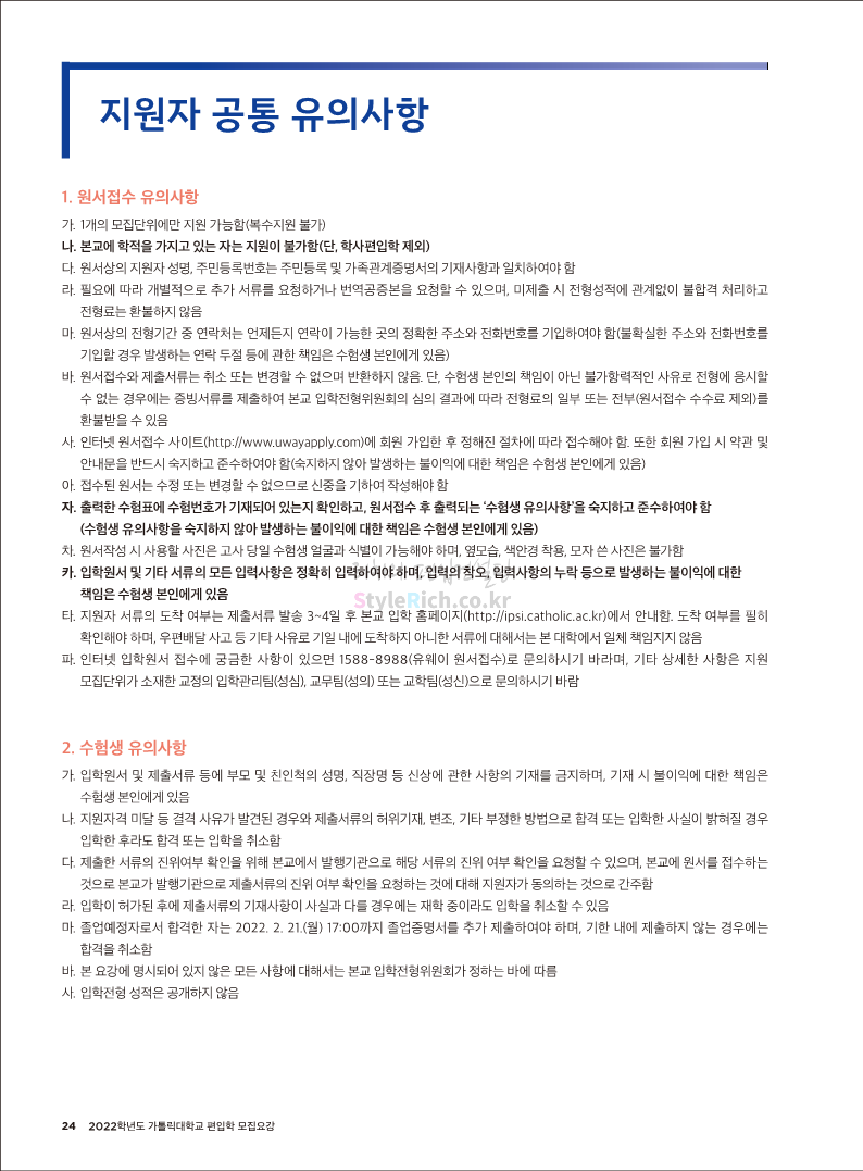가톨릭대 편입 2022학년도 모집요강 간편하게 보자! 2021.12.02 20:50 편입 모집요강/2022학년도 모집요강 2022학년도 가톨릭대 편입 모집요강(2021.12.02 기준)을 간편하게 확인하세요. * 최종 모집요강 발표 이후에도 내용의 일부가 변경될 수 있으니 지원 전 반드시 가톨릭대 입학처의 모집요강을 확인 바랍니다. 2022학년도 가톨릭대 편입 모집요강 다운받기 <출처: 가톨릭대> 가톨릭대학교 홍보 영상_KOR (2021ver) 공유하기 게시글 관리 리치의 편입컨설팅 저작자표시 비영리 변경금지 (새창열림) '편입 모집요강 > 2022학년도 모집요강' 카테고리의 다른 글 서울과학기술대 편입 2022학년도 모집요강 간편하게 보자! (0) 2021.12.04 광운대 편입 2022학년도 모집요강 간편하게 보자 (0) 2021.12.02 홍익대 편입 2022학년도 모집요강 간편하게 보자! (0) 2021.12.01 명지대 편입 2022학년도 모집요강 간편하게 보자! (0) 2021.12.01 고려대 편입 2022학년도 모집요강을 간편하게 보자! (0) 2021.12.01 댓글 공유하기 다른 글 댓글 이 글 공유하기 구독하기 구독하기 카카오톡 카카오톡 라인 라인 트위터 트위터 Facebook Facebook 카카오스토리 카카오스토리 밴드 밴드 네이버 블로그 네이버 블로그 Pocket Pocket Evernote Evernote 다른 글 서울과학기술대 편입 2022학년도 모집요강 간편하게 보자! 서울과학기술대 편입 2022학년도 모집요강 간편하게 보자! 2021.12.04 광운대 편입 2022학년도 모집요강 간편하게 보자 광운대 편입 2022학년도 모집요강 간편하게 보자 2021.12.02 홍익대 편입 2022학년도 모집요강 간편하게 보자! 홍익대 편입 2022학년도 모집요강 간편하게 보자! 2021.12.01 명지대 편입 2022학년도 모집요강 간편하게 보자! 명지대 편입 2022학년도 모집요강 간편하게 보자! 2021.12.01 다른 글 더 둘러보기