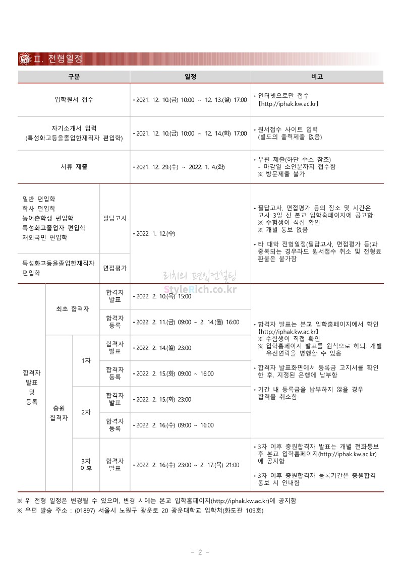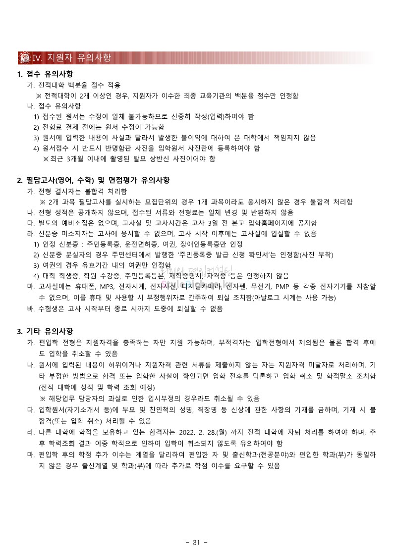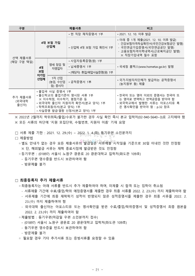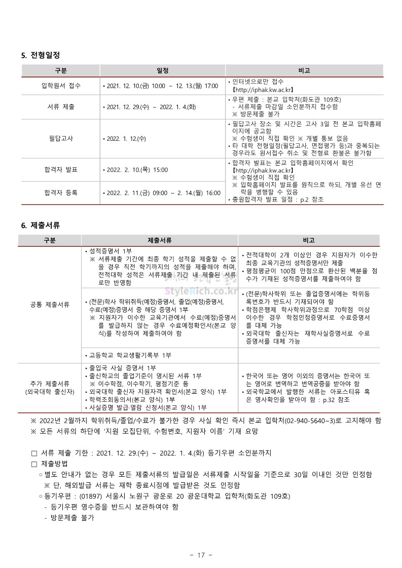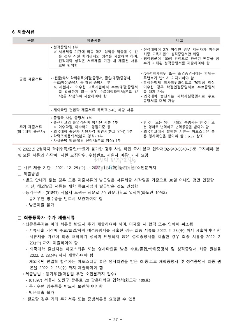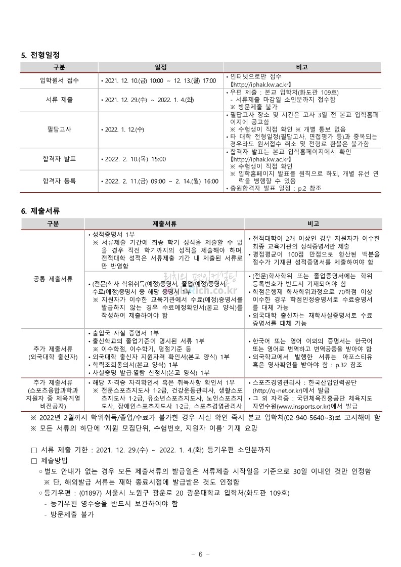 광운대 편입 2022학년도 모집요강 간편하게 보자 2021.12.02 21:43 편입 모집요강/2022학년도 모집요강 2022학년도 광운대 편입 모집요강(2021.12.02 기준)을 간편하게 확인하세요. * 최종 모집요강 발표 이후에도 내용의 일부가 변경될 수 있으니 지원 전 반드시 광운대 입학처의 모집요강을 확인 바랍니다. 2022학년도 광운대 편입 모집요강 다운받기 <출처: 광운대> [광운뉴스 236회] 변경된 학부 수업 운영 방침과 관련 유의사항 공유하기 게시글 관리 리치의 편입컨설팅 저작자표시 비영리 변경금지 (새창열림) '편입 모집요강 > 2022학년도 모집요강' 카테고리의 다른 글 숙명여대 편입 2022학년도 모집요강을 확인해 보자! (0) 2021.12.04 서울과학기술대 편입 2022학년도 모집요강 간편하게 보자! (0) 2021.12.04 가톨릭대 편입 2022학년도 모집요강 간편하게 보자! (0) 2021.12.02 홍익대 편입 2022학년도 모집요강 간편하게 보자! (0) 2021.12.01 명지대 편입 2022학년도 모집요강 간편하게 보자! (0) 2021.12.01 댓글 공유하기 다른 글 댓글 이 글 공유하기 구독하기 구독하기 카카오톡 카카오톡 라인 라인 트위터 트위터 Facebook Facebook 카카오스토리 카카오스토리 밴드 밴드 네이버 블로그 네이버 블로그 Pocket Pocket Evernote Evernote 다른 글 숙명여대 편입 2022학년도 모집요강을 확인해 보자! 숙명여대 편입 2022학년도 모집요강을 확인해 보자! 2021.12.04 서울과학기술대 편입 2022학년도 모집요강 간편하게 보자! 서울과학기술대 편입 2022학년도 모집요강 간편하게 보자! 2021.12.04 가톨릭대 편입 2022학년도 모집요강 간편하게 보자! 가톨릭대 편입 2022학년도 모집요강 간편하게 보자! 2021.12.02 홍익대 편입 2022학년도 모집요강 간편하게 보자! 홍익대 편입 2022학년도 모집요강 간편하게 보자! 2021.12.01 다른 글 더 둘러보기