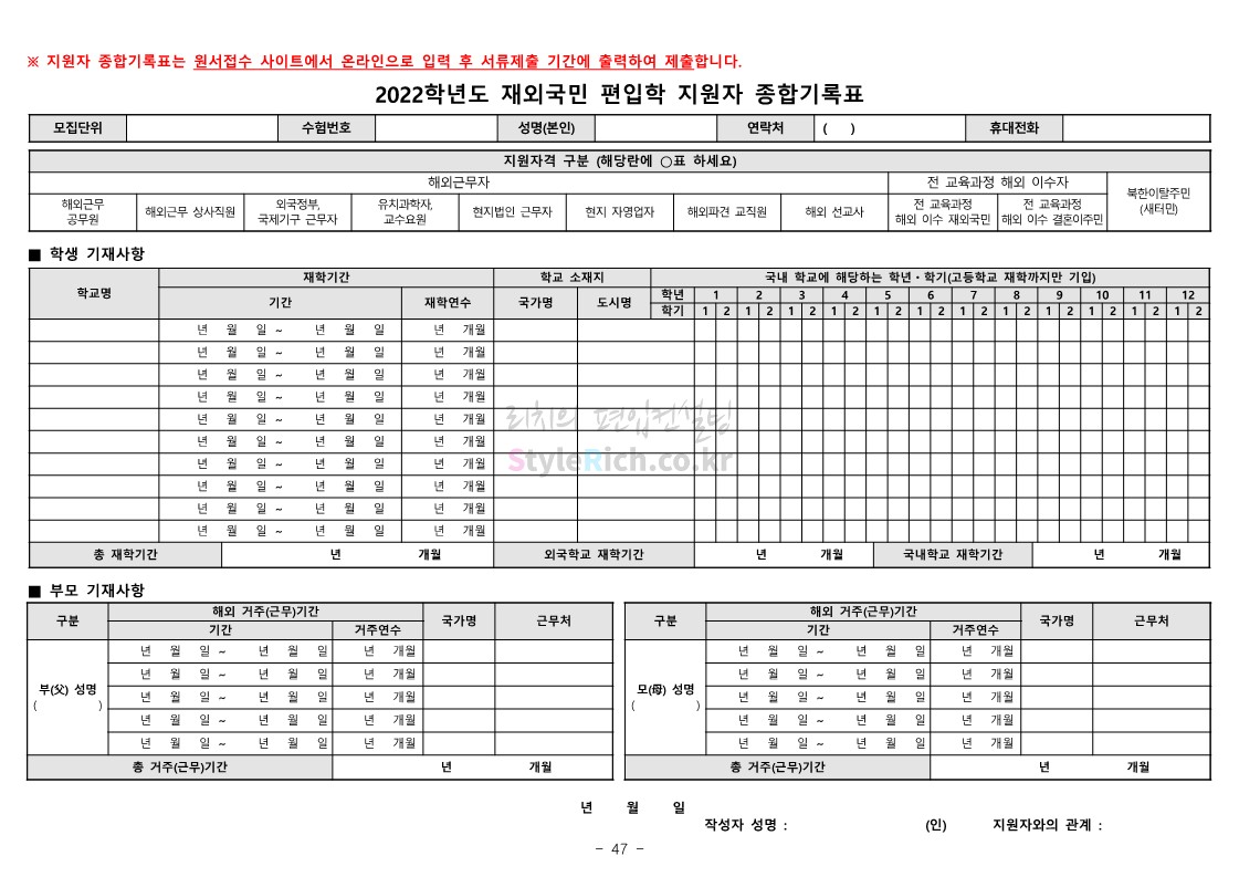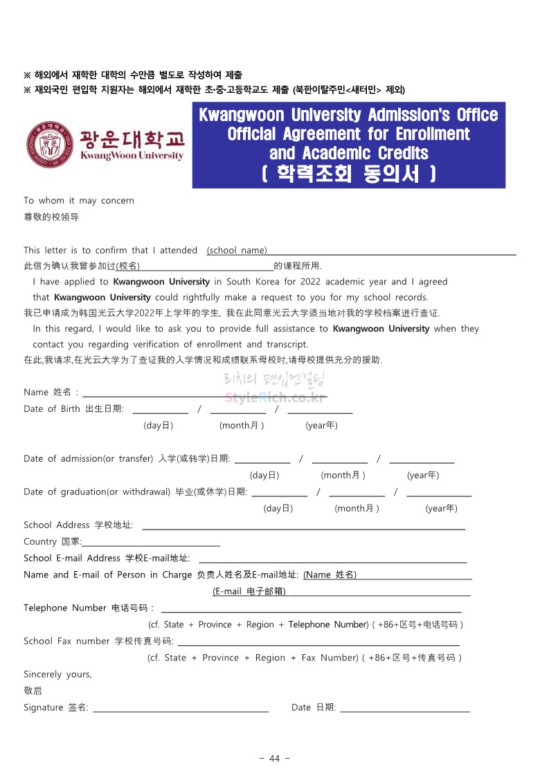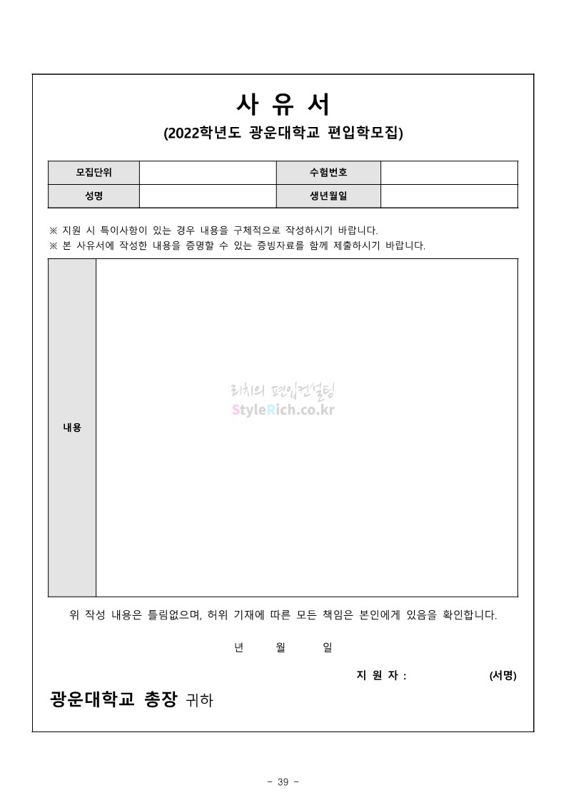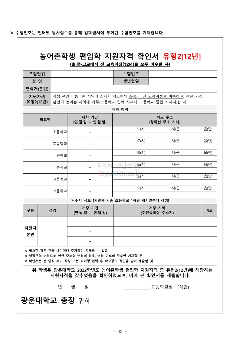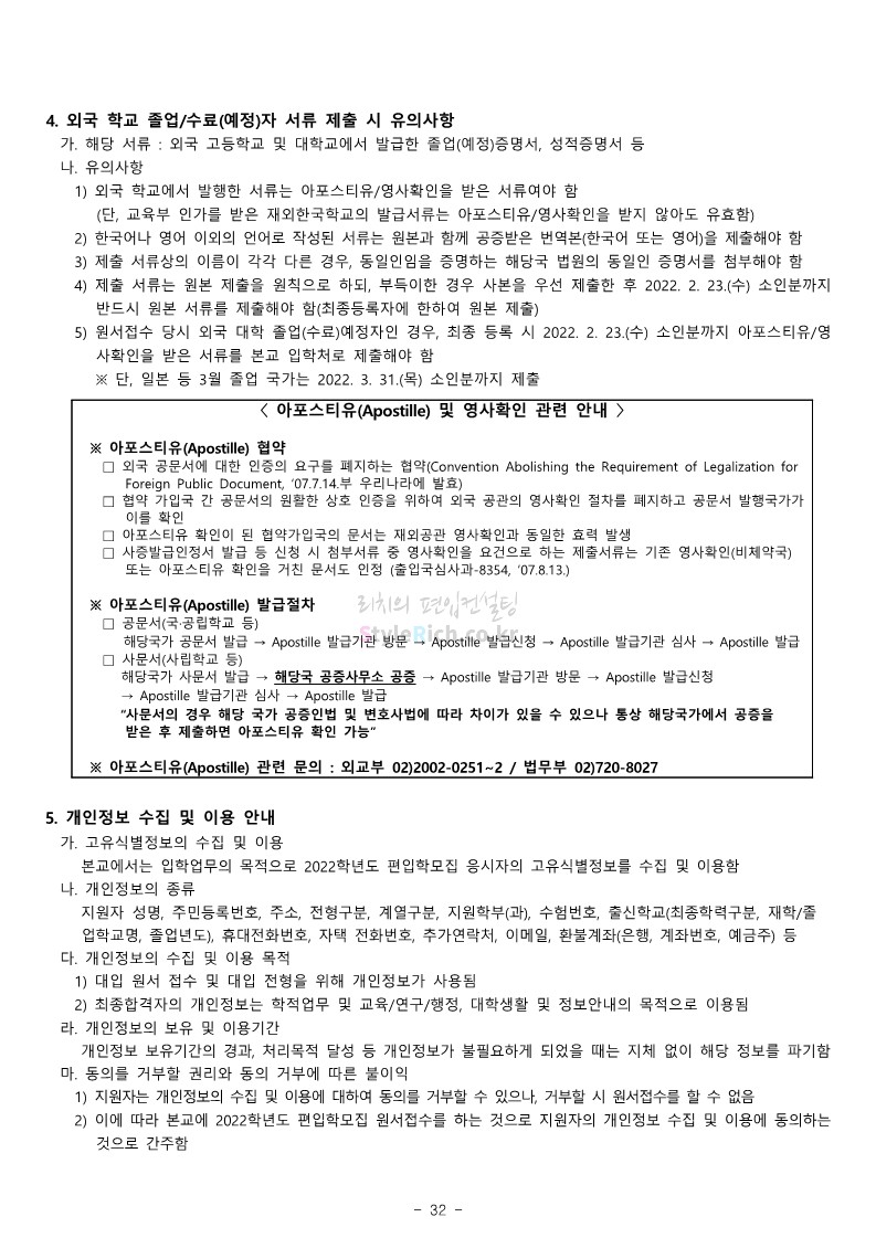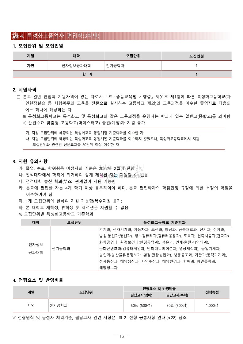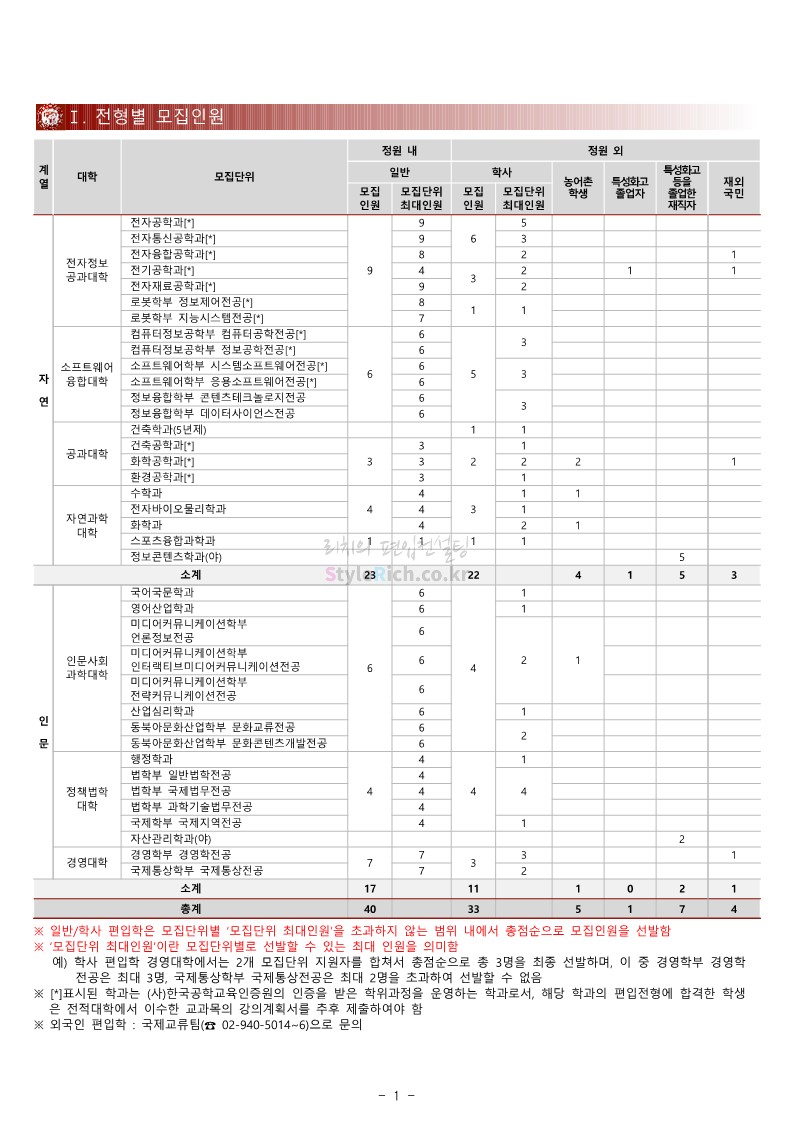광운대 편입 2022학년도 모집요강 간편하게 보자 2021.12.02 21:43 편입 모집요강/2022학년도 모집요강 2022학년도 광운대 편입 모집요강(2021.12.02 기준)을 간편하게 확인하세요. * 최종 모집요강 발표 이후에도 내용의 일부가 변경될 수 있으니 지원 전 반드시 광운대 입학처의 모집요강을 확인 바랍니다. 2022학년도 광운대 편입 모집요강 다운받기 <출처: 광운대> [광운뉴스 236회] 변경된 학부 수업 운영 방침과 관련 유의사항 공유하기 게시글 관리 리치의 편입컨설팅 저작자표시 비영리 변경금지 (새창열림) '편입 모집요강 > 2022학년도 모집요강' 카테고리의 다른 글 숙명여대 편입 2022학년도 모집요강을 확인해 보자! (0) 2021.12.04 서울과학기술대 편입 2022학년도 모집요강 간편하게 보자! (0) 2021.12.04 가톨릭대 편입 2022학년도 모집요강 간편하게 보자! (0) 2021.12.02 홍익대 편입 2022학년도 모집요강 간편하게 보자! (0) 2021.12.01 명지대 편입 2022학년도 모집요강 간편하게 보자! (0) 2021.12.01 댓글 공유하기 다른 글 댓글 이 글 공유하기 구독하기 구독하기 카카오톡 카카오톡 라인 라인 트위터 트위터 Facebook Facebook 카카오스토리 카카오스토리 밴드 밴드 네이버 블로그 네이버 블로그 Pocket Pocket Evernote Evernote 다른 글 숙명여대 편입 2022학년도 모집요강을 확인해 보자! 숙명여대 편입 2022학년도 모집요강을 확인해 보자! 2021.12.04 서울과학기술대 편입 2022학년도 모집요강 간편하게 보자! 서울과학기술대 편입 2022학년도 모집요강 간편하게 보자! 2021.12.04 가톨릭대 편입 2022학년도 모집요강 간편하게 보자! 가톨릭대 편입 2022학년도 모집요강 간편하게 보자! 2021.12.02 홍익대 편입 2022학년도 모집요강 간편하게 보자! 홍익대 편입 2022학년도 모집요강 간편하게 보자! 2021.12.01 다른 글 더 둘러보기