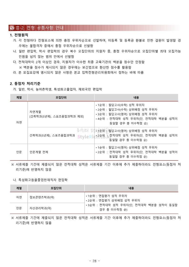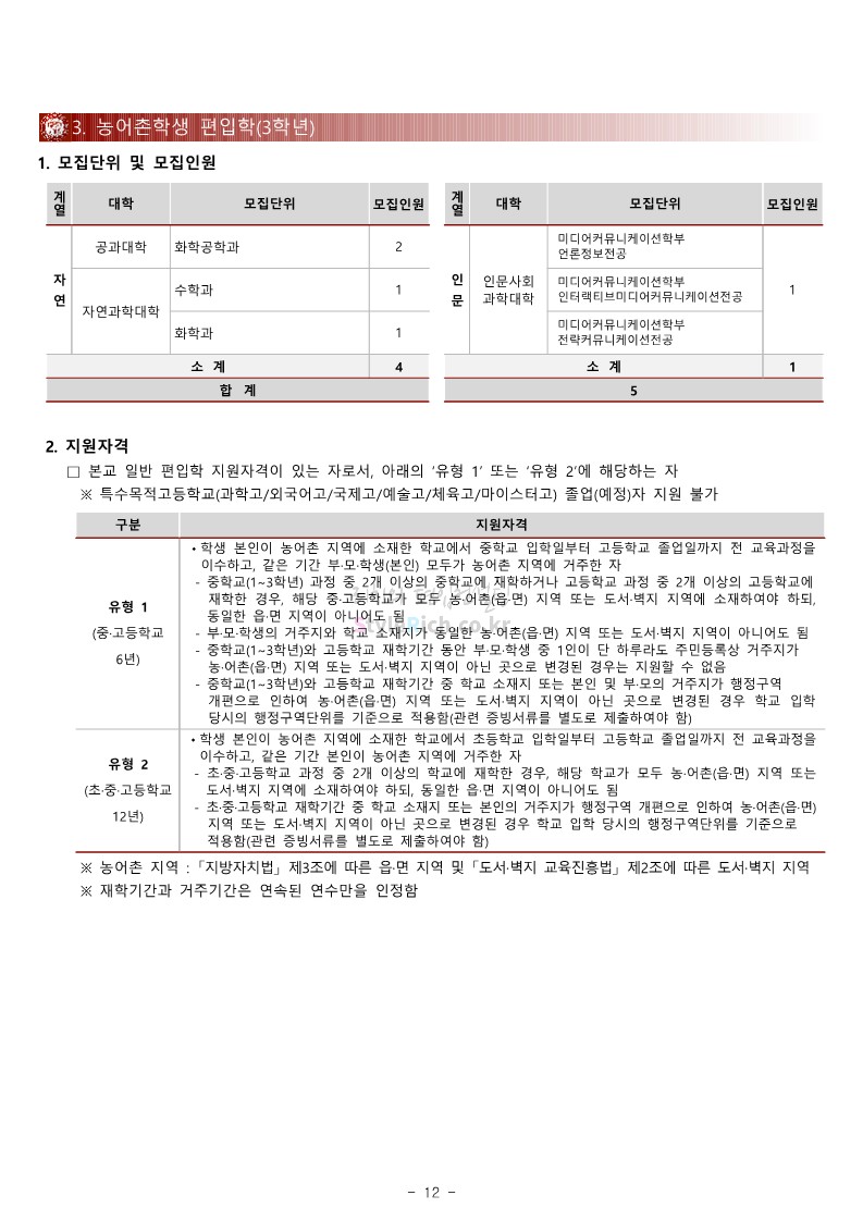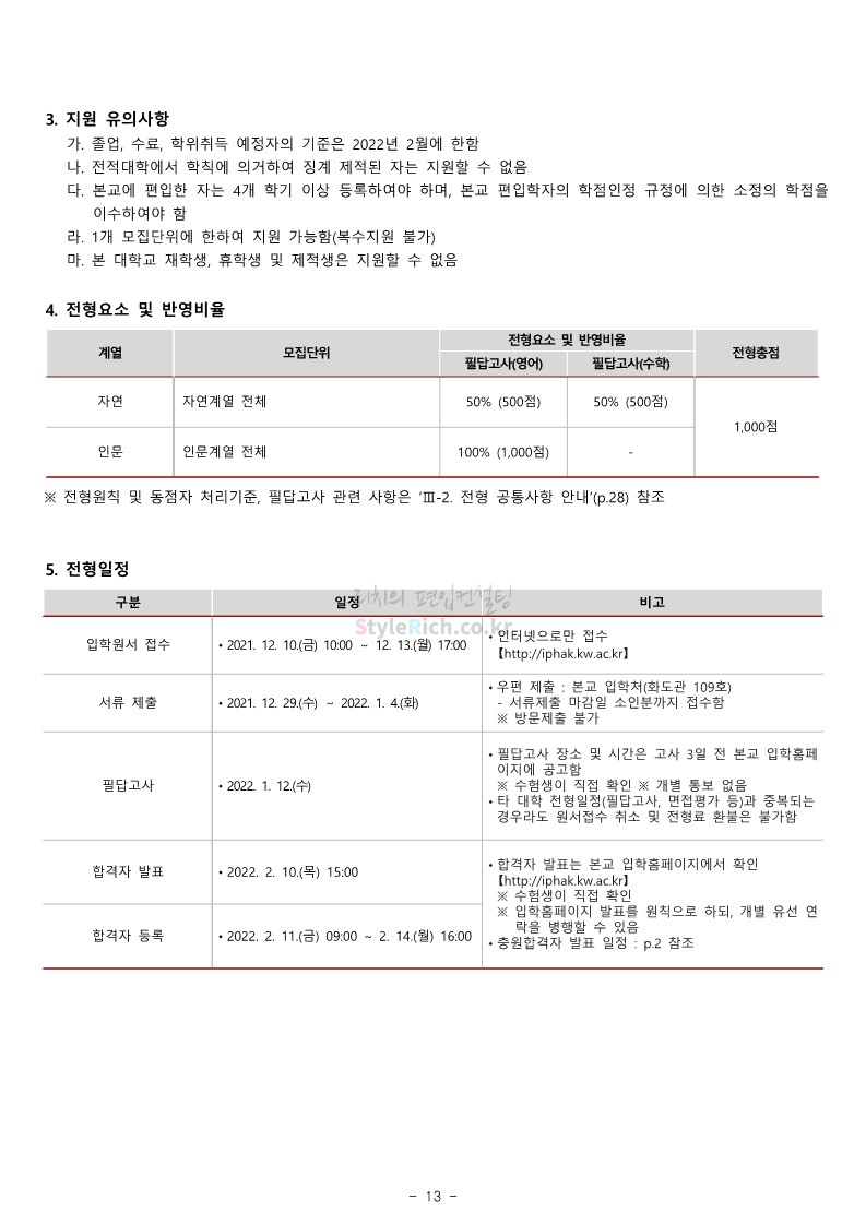 광운대 편입 2022학년도 모집요강 간편하게 보자 2021.12.02 21:43 편입 모집요강/2022학년도 모집요강 2022학년도 광운대 편입 모집요강(2021.12.02 기준)을 간편하게 확인하세요. * 최종 모집요강 발표 이후에도 내용의 일부가 변경될 수 있으니 지원 전 반드시 광운대 입학처의 모집요강을 확인 바랍니다. 2022학년도 광운대 편입 모집요강 다운받기 <출처: 광운대> [광운뉴스 236회] 변경된 학부 수업 운영 방침과 관련 유의사항 공유하기 게시글 관리 리치의 편입컨설팅 저작자표시 비영리 변경금지 (새창열림) '편입 모집요강 > 2022학년도 모집요강' 카테고리의 다른 글 숙명여대 편입 2022학년도 모집요강을 확인해 보자! (0) 2021.12.04 서울과학기술대 편입 2022학년도 모집요강 간편하게 보자! (0) 2021.12.04 가톨릭대 편입 2022학년도 모집요강 간편하게 보자! (0) 2021.12.02 홍익대 편입 2022학년도 모집요강 간편하게 보자! (0) 2021.12.01 명지대 편입 2022학년도 모집요강 간편하게 보자! (0) 2021.12.01 댓글 공유하기 다른 글 댓글 이 글 공유하기 구독하기 구독하기 카카오톡 카카오톡 라인 라인 트위터 트위터 Facebook Facebook 카카오스토리 카카오스토리 밴드 밴드 네이버 블로그 네이버 블로그 Pocket Pocket Evernote Evernote 다른 글 숙명여대 편입 2022학년도 모집요강을 확인해 보자! 숙명여대 편입 2022학년도 모집요강을 확인해 보자! 2021.12.04 서울과학기술대 편입 2022학년도 모집요강 간편하게 보자! 서울과학기술대 편입 2022학년도 모집요강 간편하게 보자! 2021.12.04 가톨릭대 편입 2022학년도 모집요강 간편하게 보자! 가톨릭대 편입 2022학년도 모집요강 간편하게 보자! 2021.12.02 홍익대 편입 2022학년도 모집요강 간편하게 보자! 홍익대 편입 2022학년도 모집요강 간편하게 보자! 2021.12.01 다른 글 더 둘러보기
