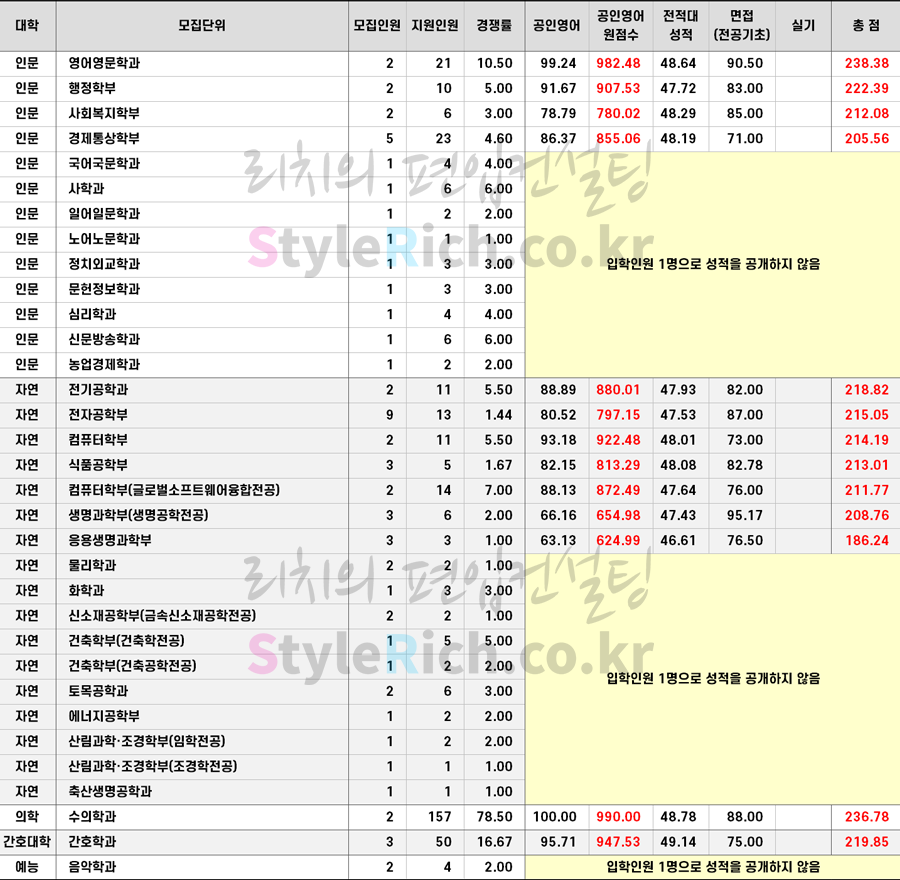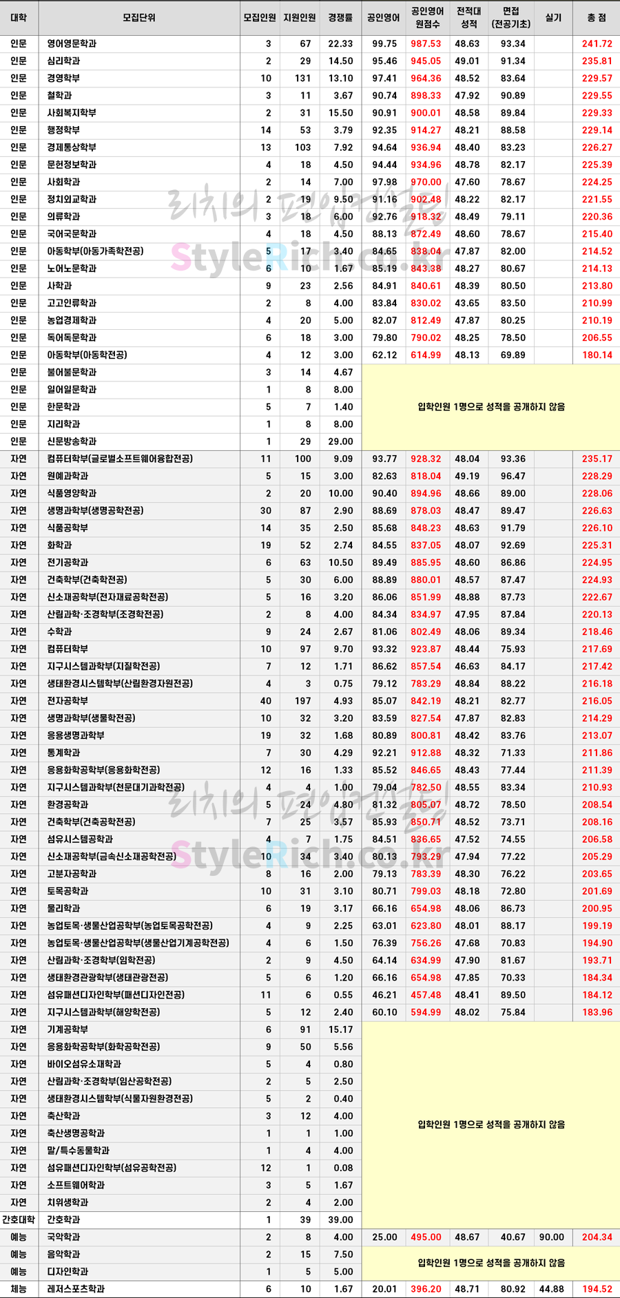 * 입학인원이 1명인 모집단위는 개인정보보호를 위해 성적을 공개하지 않음