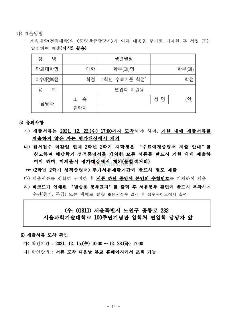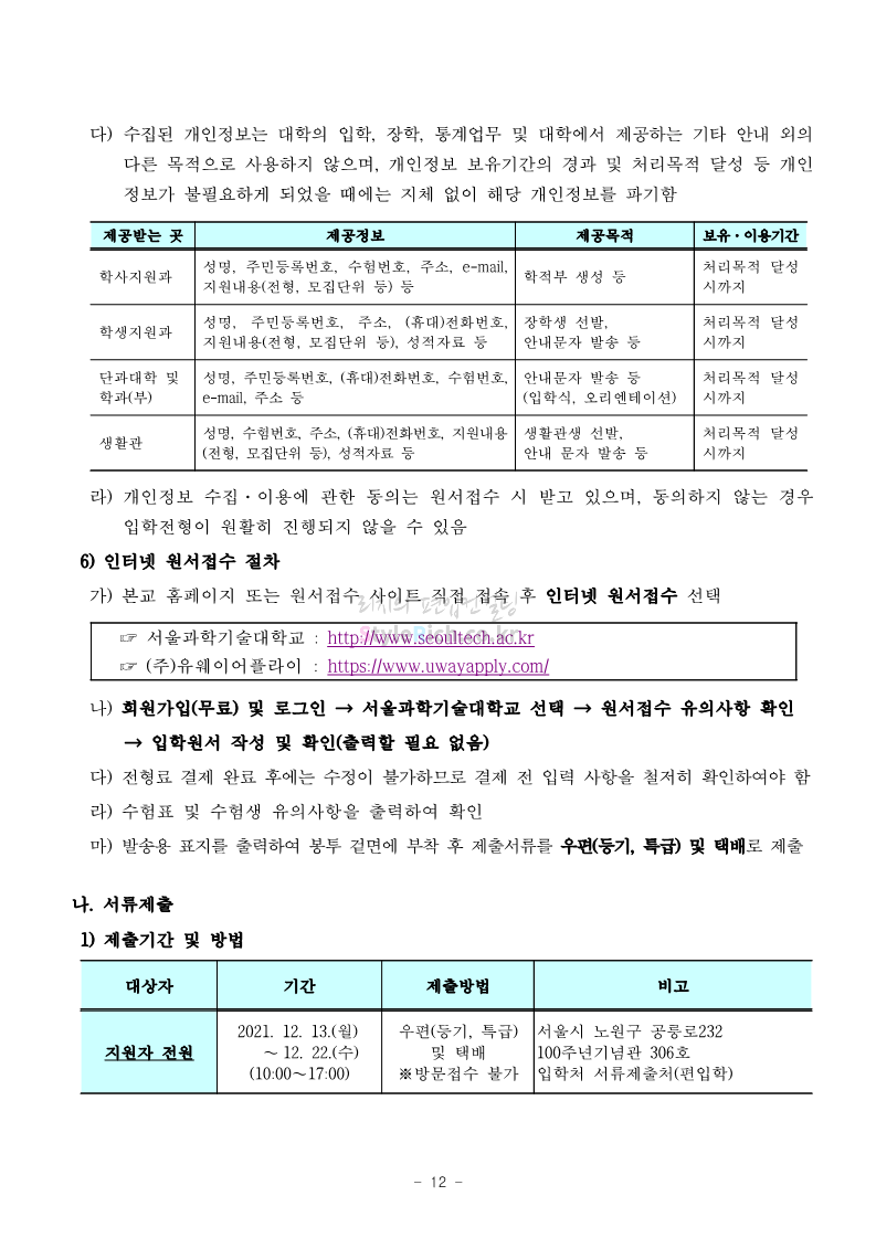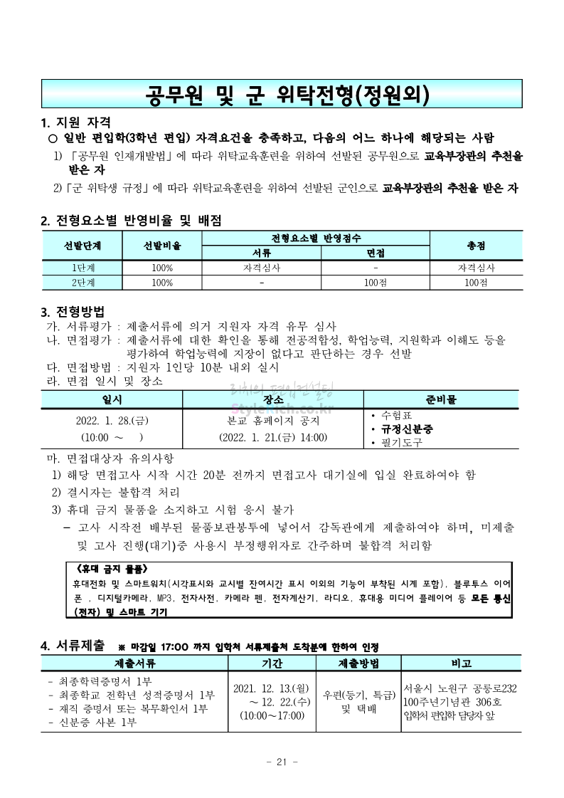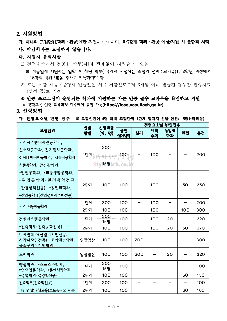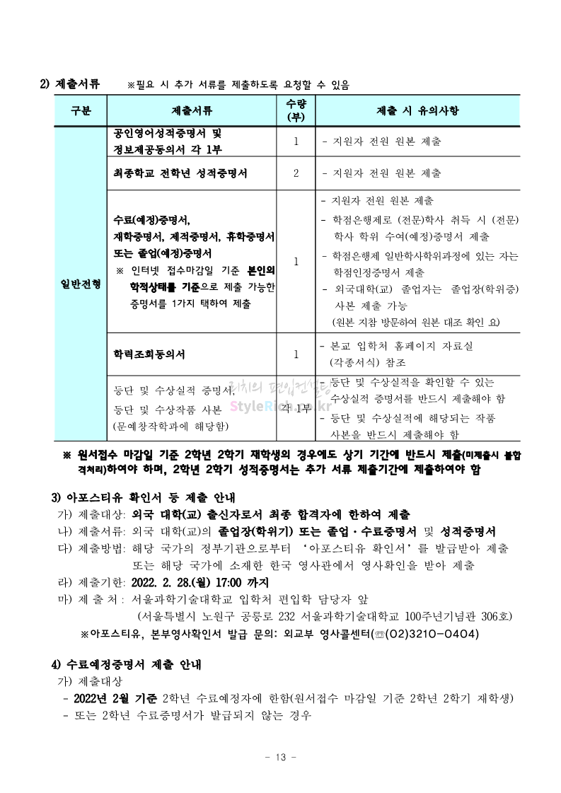 서울과학기술대 편입 2022학년도 모집요강 간편하게 보자! 2021.12.04 00:22 편입 모집요강/2022학년도 모집요강 2022학년도 서울과학기술대 편입 모집요강(2021.12.03 기준)을 간편하게 확인하세요. * 최종 모집요강 발표 이후에도 내용의 일부가 변경될 수 있으니 지원 전 반드시 서울과학기술대 입학처의 모집요강을 확인 바랍니다. 2022학년도 서울과학기술대 편입 모집요강 다운받기 <출처: 서울과학기술대> 2021년 서울과학기술대학교 홍보영상 공유하기 게시글 관리 리치의 편입컨설팅 저작자표시 비영리 변경금지 (새창열림) '편입 모집요강 > 2022학년도 모집요강' 카테고리의 다른 글 연세대(미래) 편입 2022학년도 모집요강 간편하게 보자! (0) 2021.12.04 숙명여대 편입 2022학년도 모집요강을 확인해 보자! (0) 2021.12.04 광운대 편입 2022학년도 모집요강 간편하게 보자 (0) 2021.12.02 가톨릭대 편입 2022학년도 모집요강 간편하게 보자! (0) 2021.12.02 홍익대 편입 2022학년도 모집요강 간편하게 보자! (0) 2021.12.01 댓글 공유하기 다른 글 댓글 이 글 공유하기 구독하기 구독하기 카카오톡 카카오톡 라인 라인 트위터 트위터 Facebook Facebook 카카오스토리 카카오스토리 밴드 밴드 네이버 블로그 네이버 블로그 Pocket Pocket Evernote Evernote 다른 글 연세대(미래) 편입 2022학년도 모집요강 간편하게 보자! 연세대(미래) 편입 2022학년도 모집요강 간편하게 보자! 2021.12.04 숙명여대 편입 2022학년도 모집요강을 확인해 보자! 숙명여대 편입 2022학년도 모집요강을 확인해 보자! 2021.12.04 광운대 편입 2022학년도 모집요강 간편하게 보자 광운대 편입 2022학년도 모집요강 간편하게 보자 2021.12.02 가톨릭대 편입 2022학년도 모집요강 간편하게 보자! 가톨릭대 편입 2022학년도 모집요강 간편하게 보자! 2021.12.02 다른 글 더 둘러보기