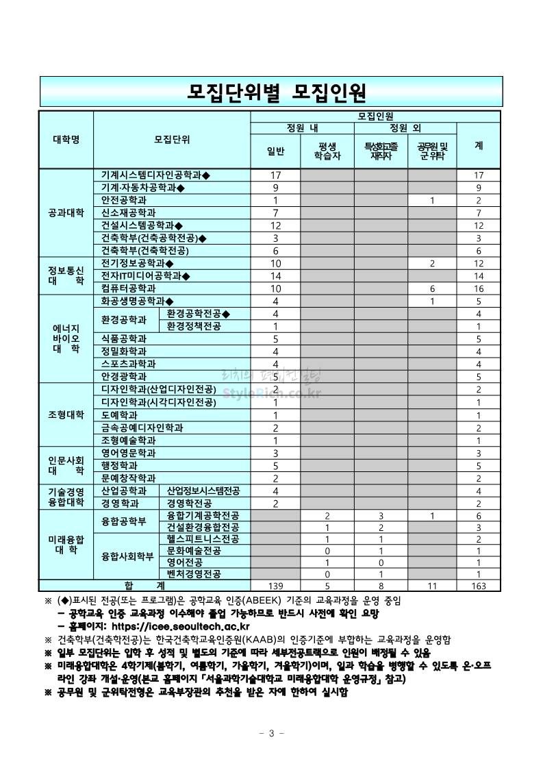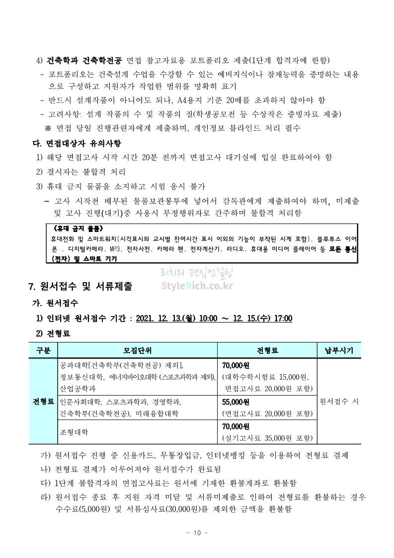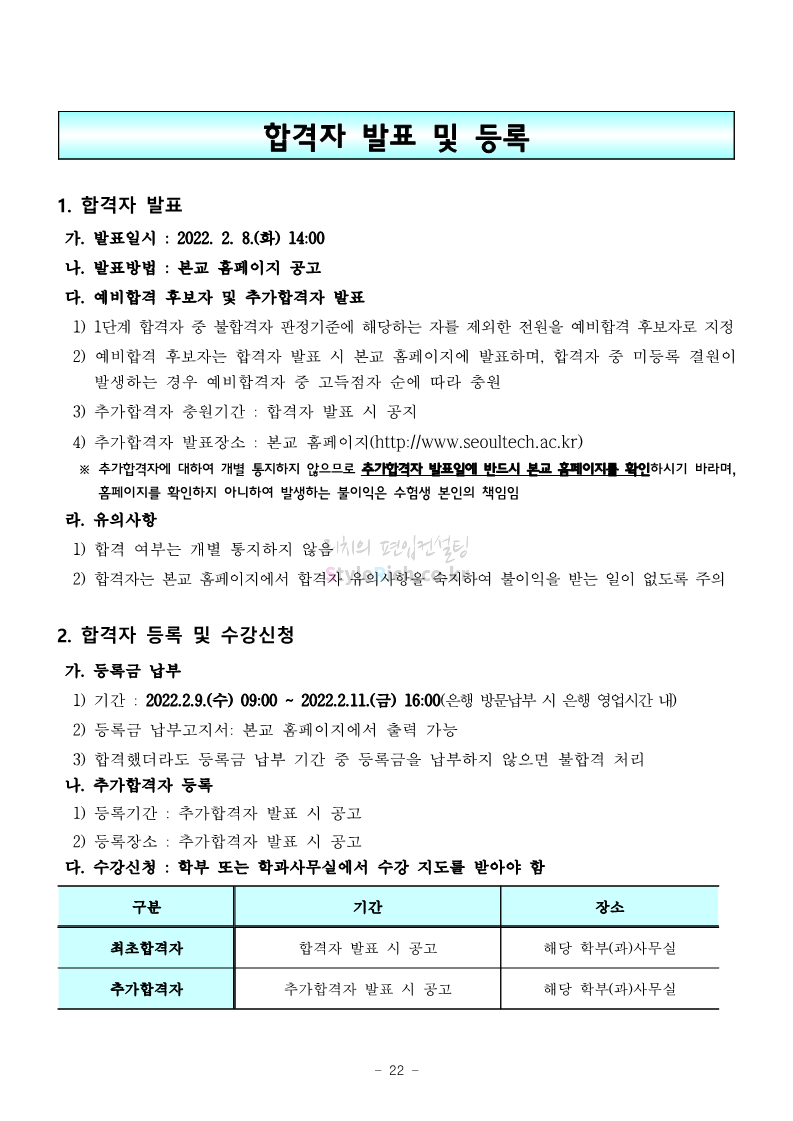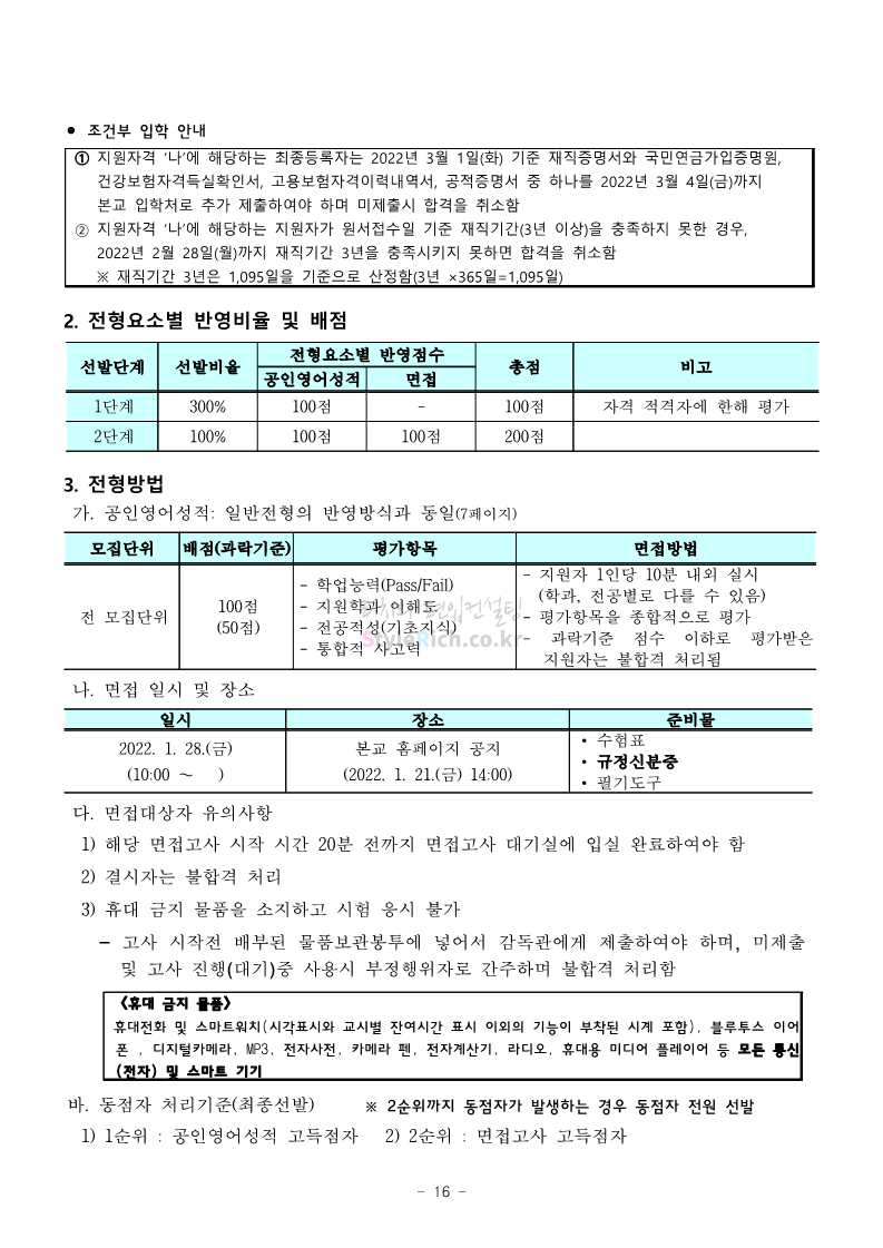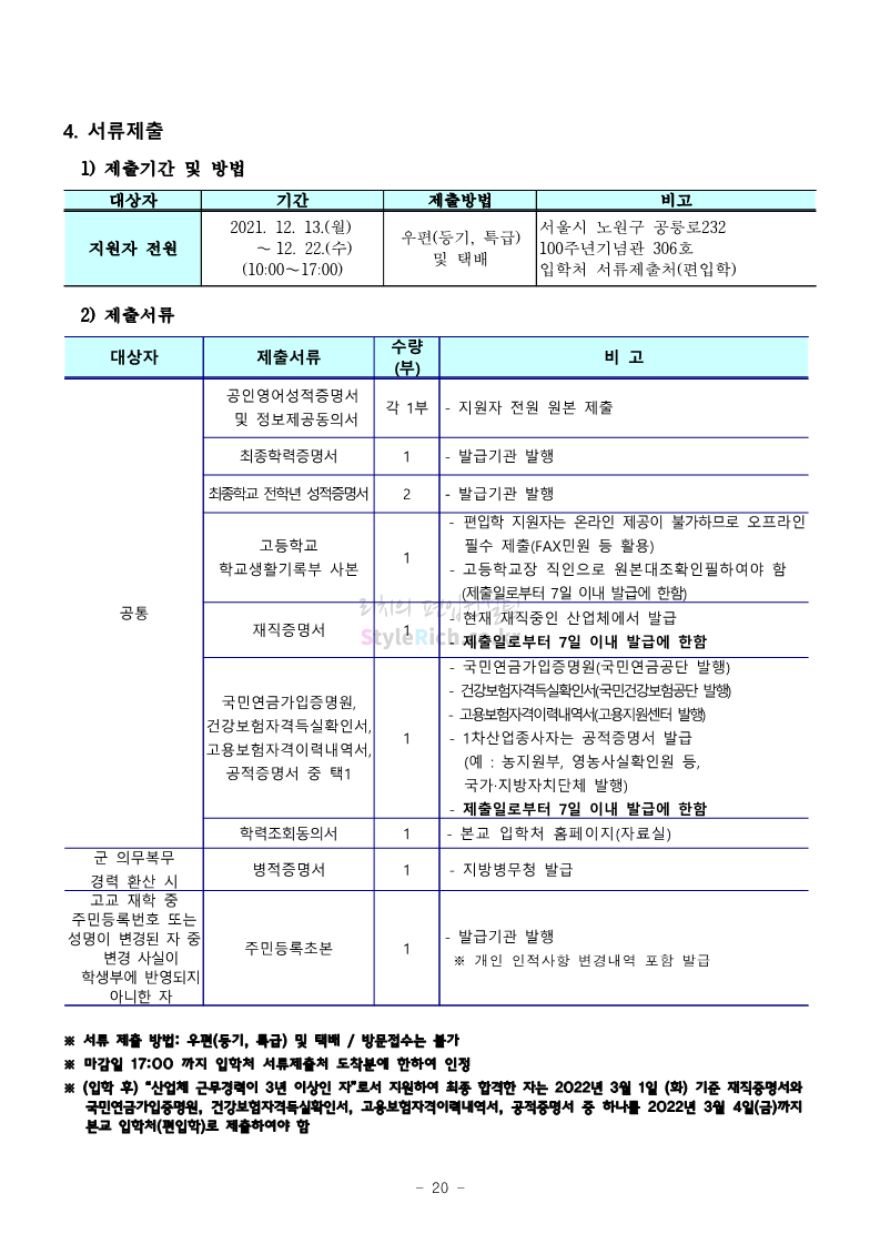 서울과학기술대 편입 2022학년도 모집요강 간편하게 보자! 2021.12.04 00:22 편입 모집요강/2022학년도 모집요강 2022학년도 서울과학기술대 편입 모집요강(2021.12.03 기준)을 간편하게 확인하세요. * 최종 모집요강 발표 이후에도 내용의 일부가 변경될 수 있으니 지원 전 반드시 서울과학기술대 입학처의 모집요강을 확인 바랍니다. 2022학년도 서울과학기술대 편입 모집요강 다운받기 <출처: 서울과학기술대> 2021년 서울과학기술대학교 홍보영상 공유하기 게시글 관리 리치의 편입컨설팅 저작자표시 비영리 변경금지 (새창열림) '편입 모집요강 > 2022학년도 모집요강' 카테고리의 다른 글 연세대(미래) 편입 2022학년도 모집요강 간편하게 보자! (0) 2021.12.04 숙명여대 편입 2022학년도 모집요강을 확인해 보자! (0) 2021.12.04 광운대 편입 2022학년도 모집요강 간편하게 보자 (0) 2021.12.02 가톨릭대 편입 2022학년도 모집요강 간편하게 보자! (0) 2021.12.02 홍익대 편입 2022학년도 모집요강 간편하게 보자! (0) 2021.12.01 댓글 공유하기 다른 글 댓글 이 글 공유하기 구독하기 구독하기 카카오톡 카카오톡 라인 라인 트위터 트위터 Facebook Facebook 카카오스토리 카카오스토리 밴드 밴드 네이버 블로그 네이버 블로그 Pocket Pocket Evernote Evernote 다른 글 연세대(미래) 편입 2022학년도 모집요강 간편하게 보자! 연세대(미래) 편입 2022학년도 모집요강 간편하게 보자! 2021.12.04 숙명여대 편입 2022학년도 모집요강을 확인해 보자! 숙명여대 편입 2022학년도 모집요강을 확인해 보자! 2021.12.04 광운대 편입 2022학년도 모집요강 간편하게 보자 광운대 편입 2022학년도 모집요강 간편하게 보자 2021.12.02 가톨릭대 편입 2022학년도 모집요강 간편하게 보자! 가톨릭대 편입 2022학년도 모집요강 간편하게 보자! 2021.12.02 다른 글 더 둘러보기