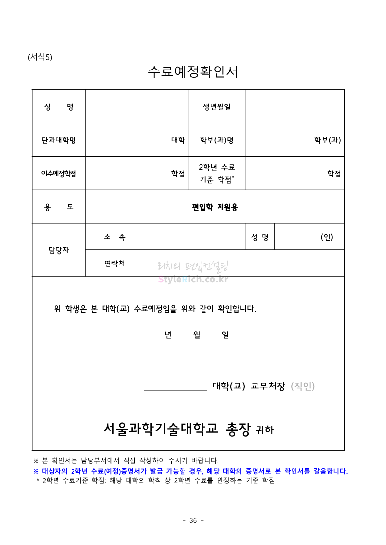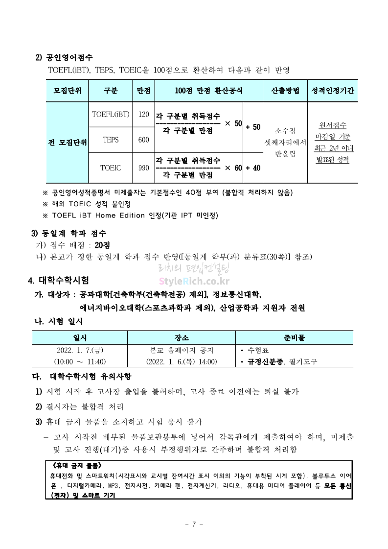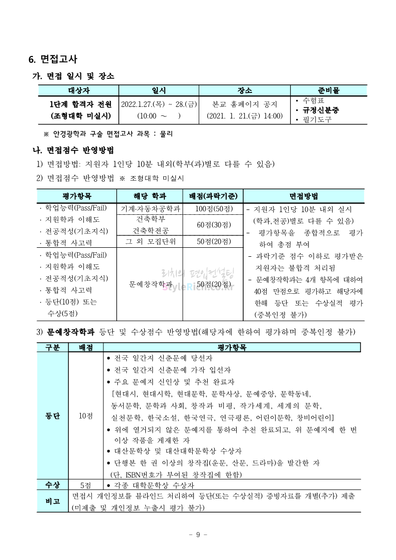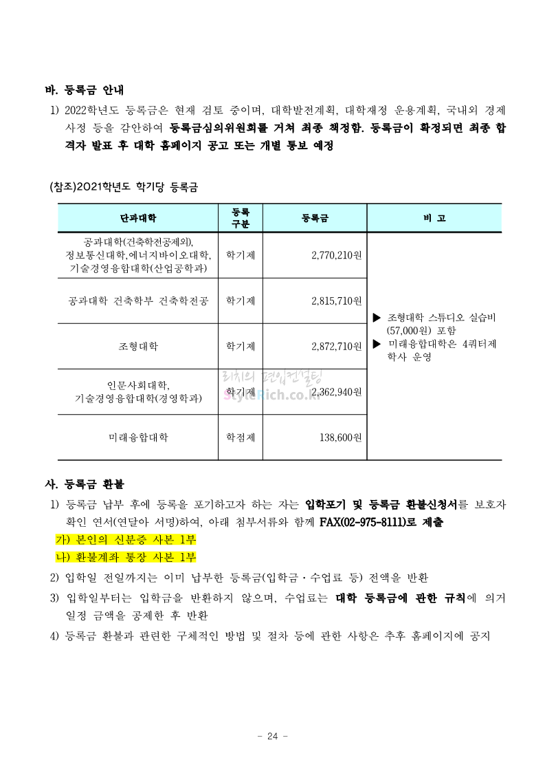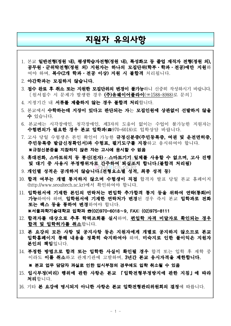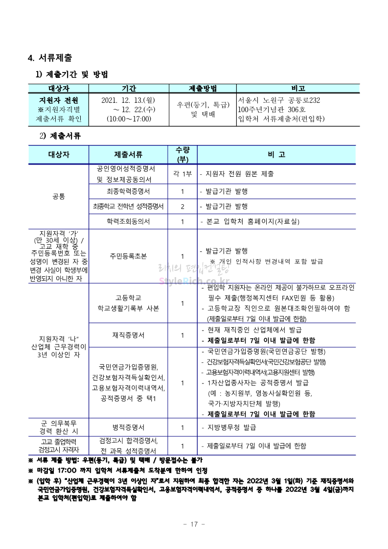 서울과학기술대 편입 2022학년도 모집요강 간편하게 보자! 2021.12.04 00:22 편입 모집요강/2022학년도 모집요강 2022학년도 서울과학기술대 편입 모집요강(2021.12.03 기준)을 간편하게 확인하세요. * 최종 모집요강 발표 이후에도 내용의 일부가 변경될 수 있으니 지원 전 반드시 서울과학기술대 입학처의 모집요강을 확인 바랍니다. 2022학년도 서울과학기술대 편입 모집요강 다운받기 <출처: 서울과학기술대> 2021년 서울과학기술대학교 홍보영상 공유하기 게시글 관리 리치의 편입컨설팅 저작자표시 비영리 변경금지 (새창열림) '편입 모집요강 > 2022학년도 모집요강' 카테고리의 다른 글 연세대(미래) 편입 2022학년도 모집요강 간편하게 보자! (0) 2021.12.04 숙명여대 편입 2022학년도 모집요강을 확인해 보자! (0) 2021.12.04 광운대 편입 2022학년도 모집요강 간편하게 보자 (0) 2021.12.02 가톨릭대 편입 2022학년도 모집요강 간편하게 보자! (0) 2021.12.02 홍익대 편입 2022학년도 모집요강 간편하게 보자! (0) 2021.12.01 댓글 공유하기 다른 글 댓글 이 글 공유하기 구독하기 구독하기 카카오톡 카카오톡 라인 라인 트위터 트위터 Facebook Facebook 카카오스토리 카카오스토리 밴드 밴드 네이버 블로그 네이버 블로그 Pocket Pocket Evernote Evernote 다른 글 연세대(미래) 편입 2022학년도 모집요강 간편하게 보자! 연세대(미래) 편입 2022학년도 모집요강 간편하게 보자! 2021.12.04 숙명여대 편입 2022학년도 모집요강을 확인해 보자! 숙명여대 편입 2022학년도 모집요강을 확인해 보자! 2021.12.04 광운대 편입 2022학년도 모집요강 간편하게 보자 광운대 편입 2022학년도 모집요강 간편하게 보자 2021.12.02 가톨릭대 편입 2022학년도 모집요강 간편하게 보자! 가톨릭대 편입 2022학년도 모집요강 간편하게 보자! 2021.12.02 다른 글 더 둘러보기