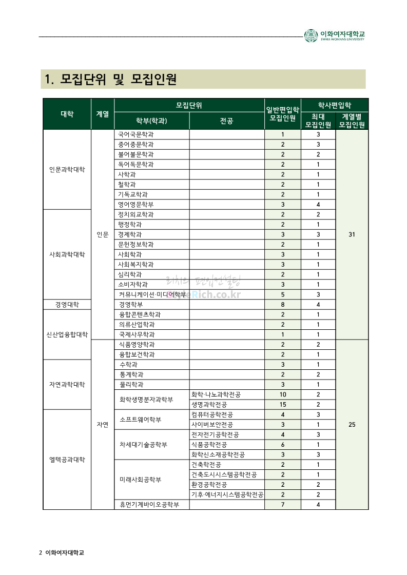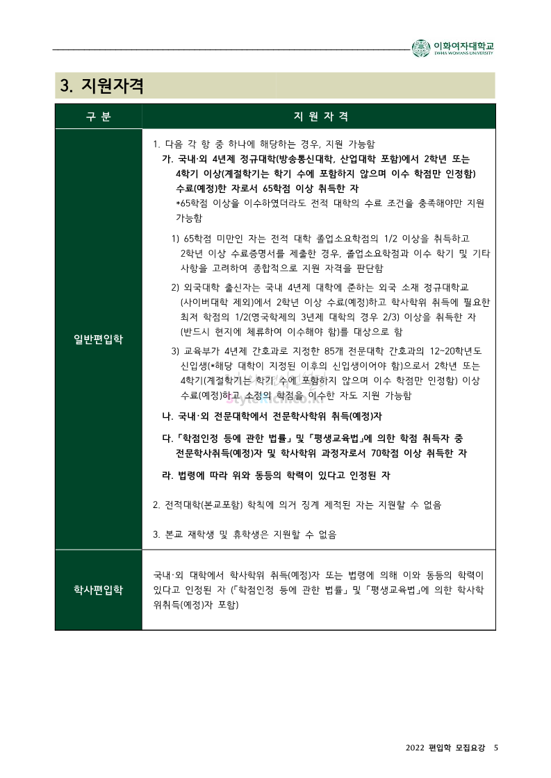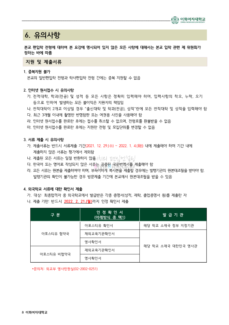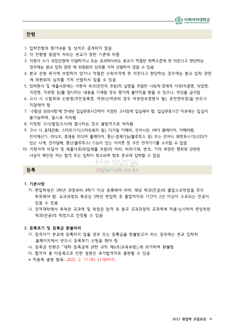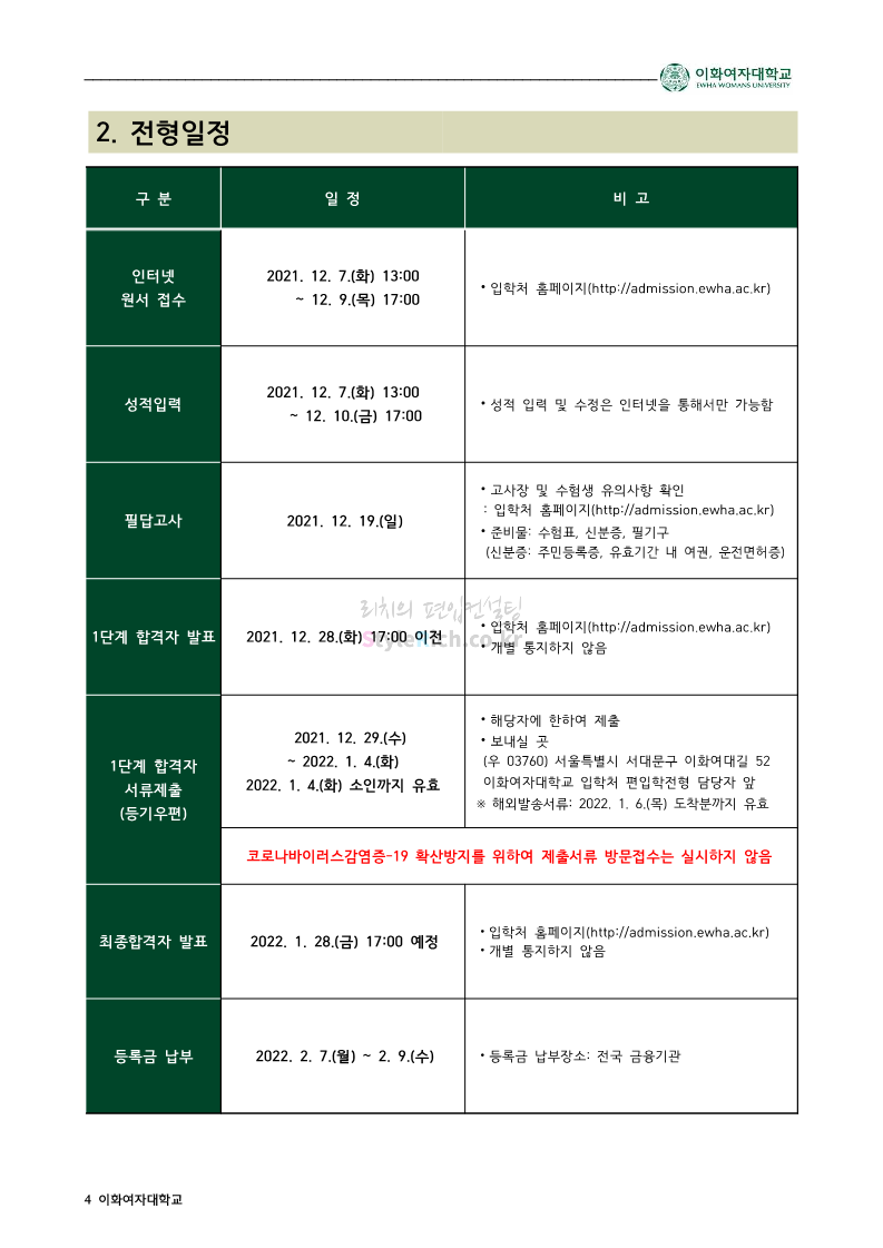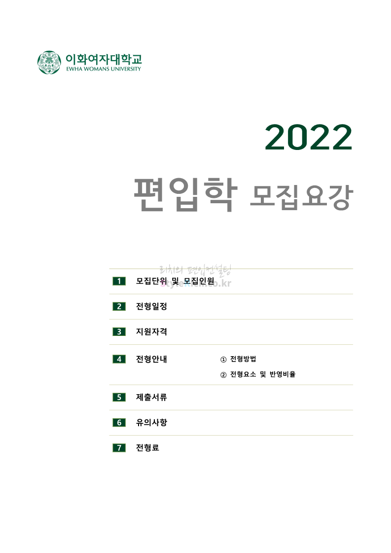 이화여대 편입 2022학년도 모집요강 간편하게 보자! 2021.12.04 01:47 편입 모집요강/2022학년도 모집요강 2022학년도 이화여대 편입 모집요강(2021.12.03 기준)을 간편하게 확인하세요. * 최종 모집요강 발표 이후에도 내용의 일부가 변경될 수 있으니 지원 전 반드시 이화여대 입학처의 모집요강을 확인 바랍니다. 2022학년도 이화여대 편입 모집요강 다운받기 <출처: 이화여대> [오늘자 이화캠] 아름다운 가을캠퍼스 공유하기 게시글 관리 리치의 편입컨설팅 저작자표시 비영리 변경금지 (새창열림) '편입 모집요강 > 2022학년도 모집요강' 카테고리의 다른 글 영남대 편입 2022학년도 모집요강 간편하게 보자! (0) 2021.12.04 인하대 편입 2022학년도 모집요강 간편하게 보자! (0) 2021.12.04 연세대(미래) 편입 2022학년도 모집요강 간편하게 보자! (0) 2021.12.04 숙명여대 편입 2022학년도 모집요강을 확인해 보자! (0) 2021.12.04 서울과학기술대 편입 2022학년도 모집요강 간편하게 보자! (0) 2021.12.04 댓글 공유하기 다른 글 댓글 이 글 공유하기 구독하기 구독하기 카카오톡 카카오톡 라인 라인 트위터 트위터 Facebook Facebook 카카오스토리 카카오스토리 밴드 밴드 네이버 블로그 네이버 블로그 Pocket Pocket Evernote Evernote 다른 글 영남대 편입 2022학년도 모집요강 간편하게 보자! 영남대 편입 2022학년도 모집요강 간편하게 보자! 2021.12.04 인하대 편입 2022학년도 모집요강 간편하게 보자! 인하대 편입 2022학년도 모집요강 간편하게 보자! 2021.12.04 연세대(미래) 편입 2022학년도 모집요강 간편하게 보자! 연세대(미래) 편입 2022학년도 모집요강 간편하게 보자! 2021.12.04 숙명여대 편입 2022학년도 모집요강을 확인해 보자! 숙명여대 편입 2022학년도 모집요강을 확인해 보자! 2021.12.04 다른 글 더 둘러보기