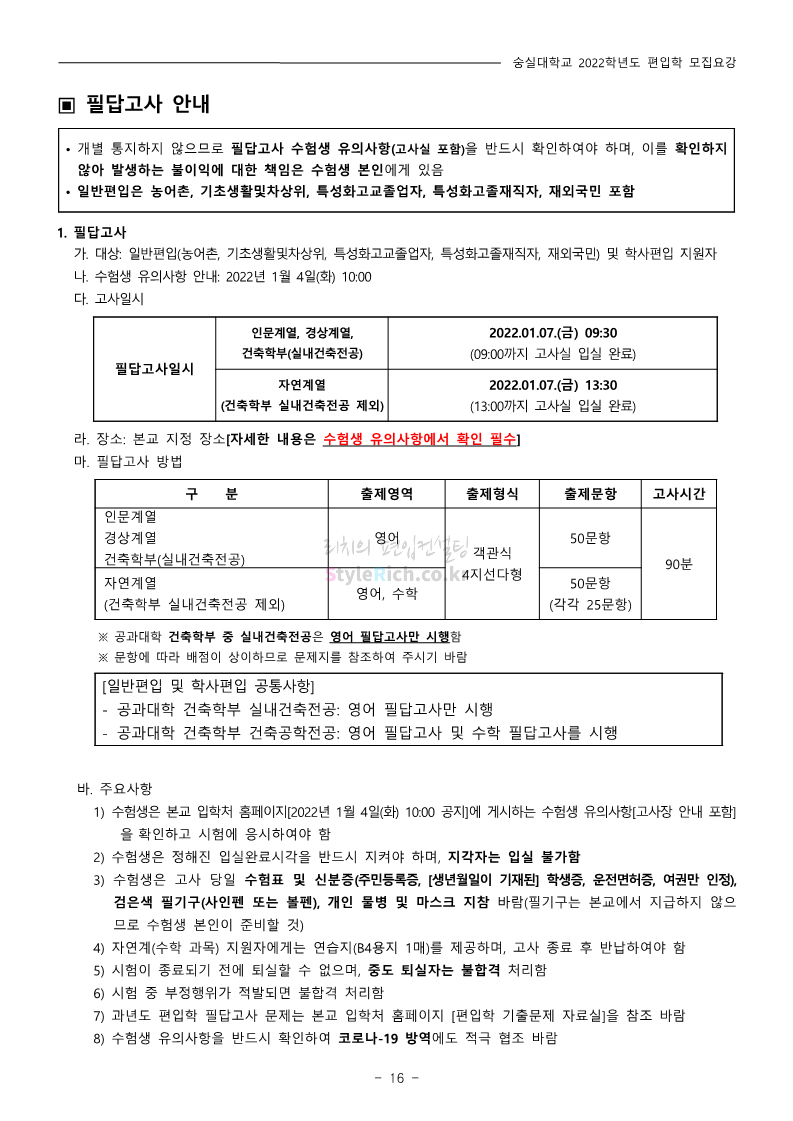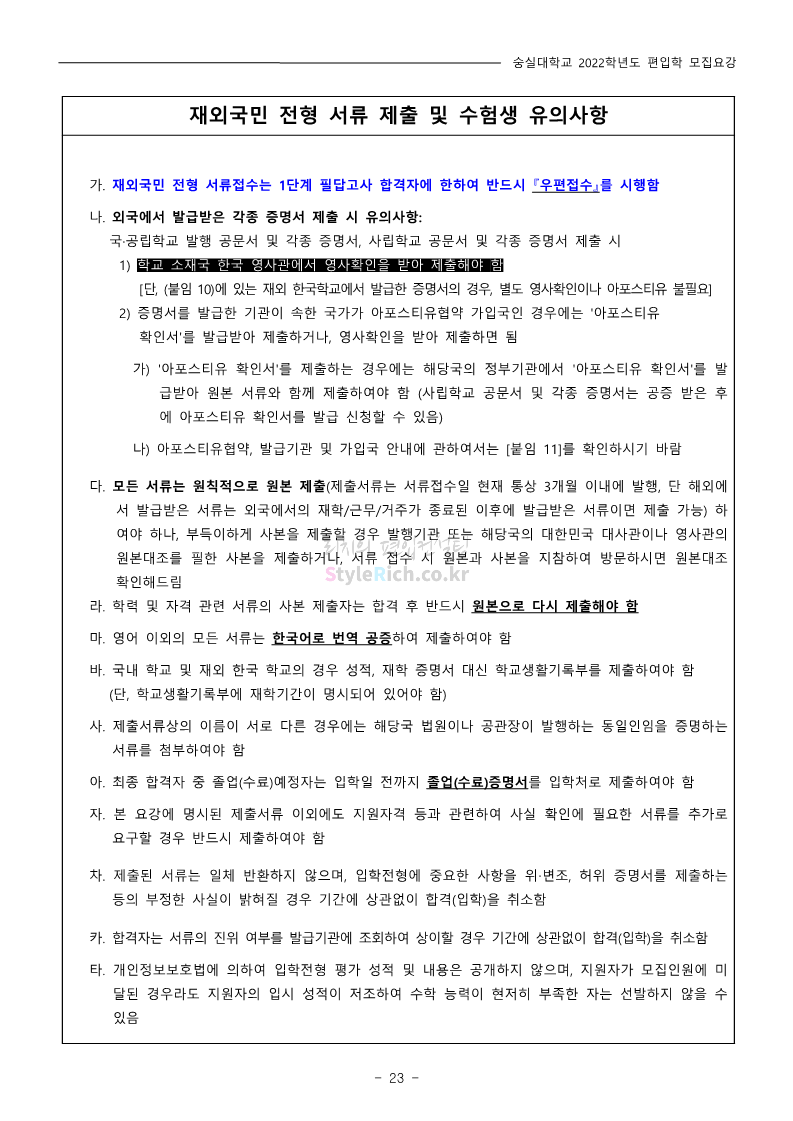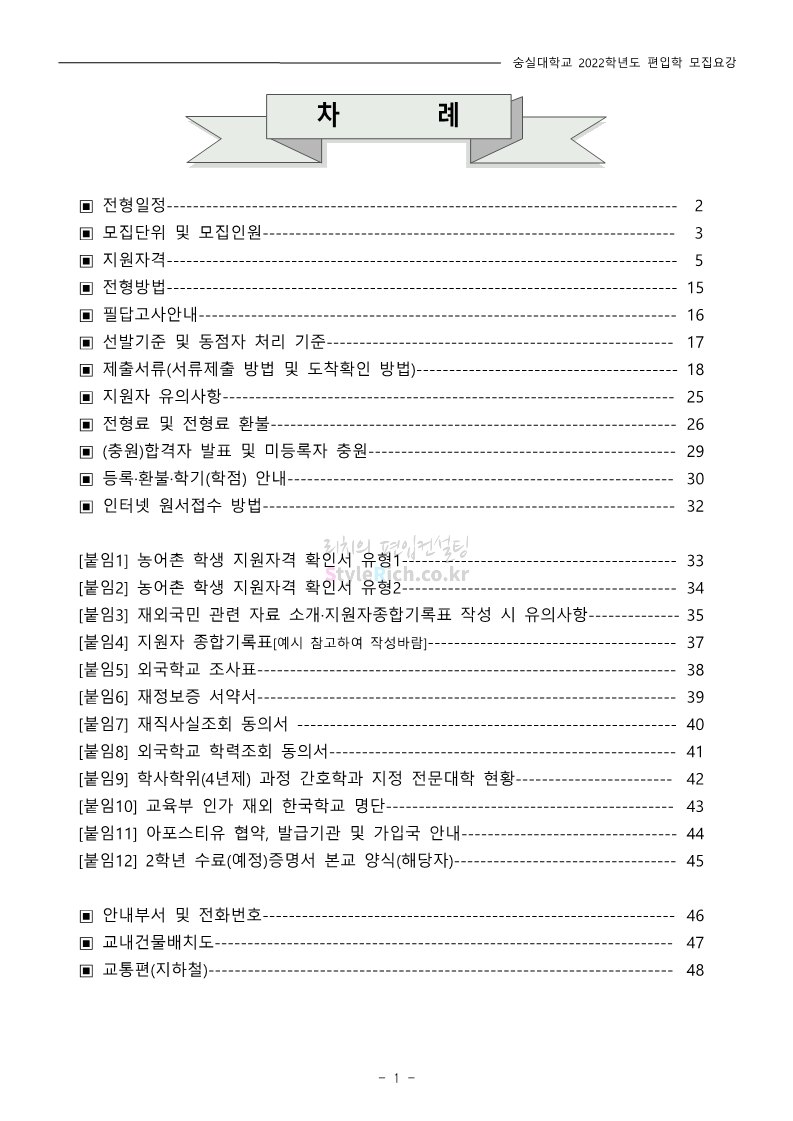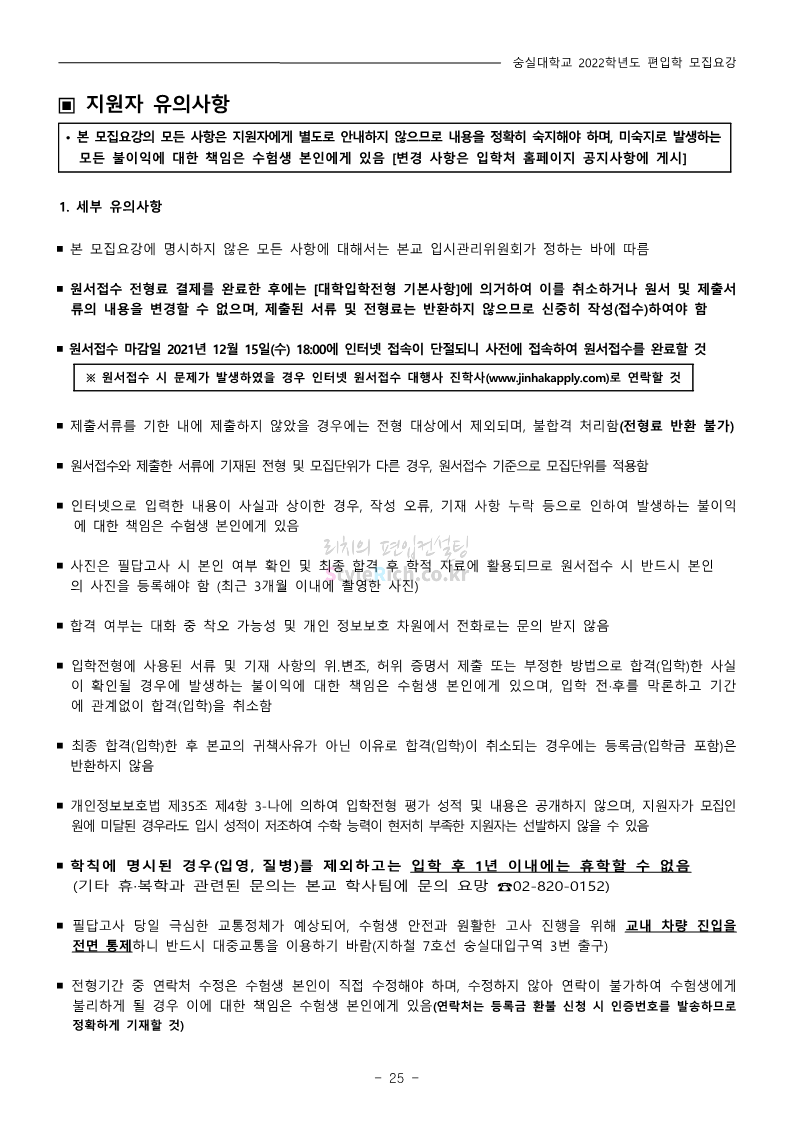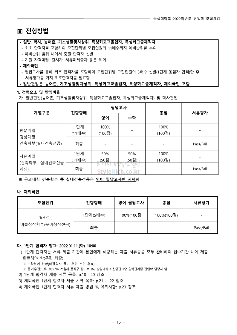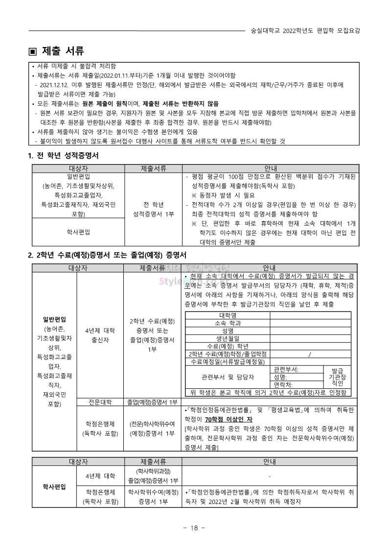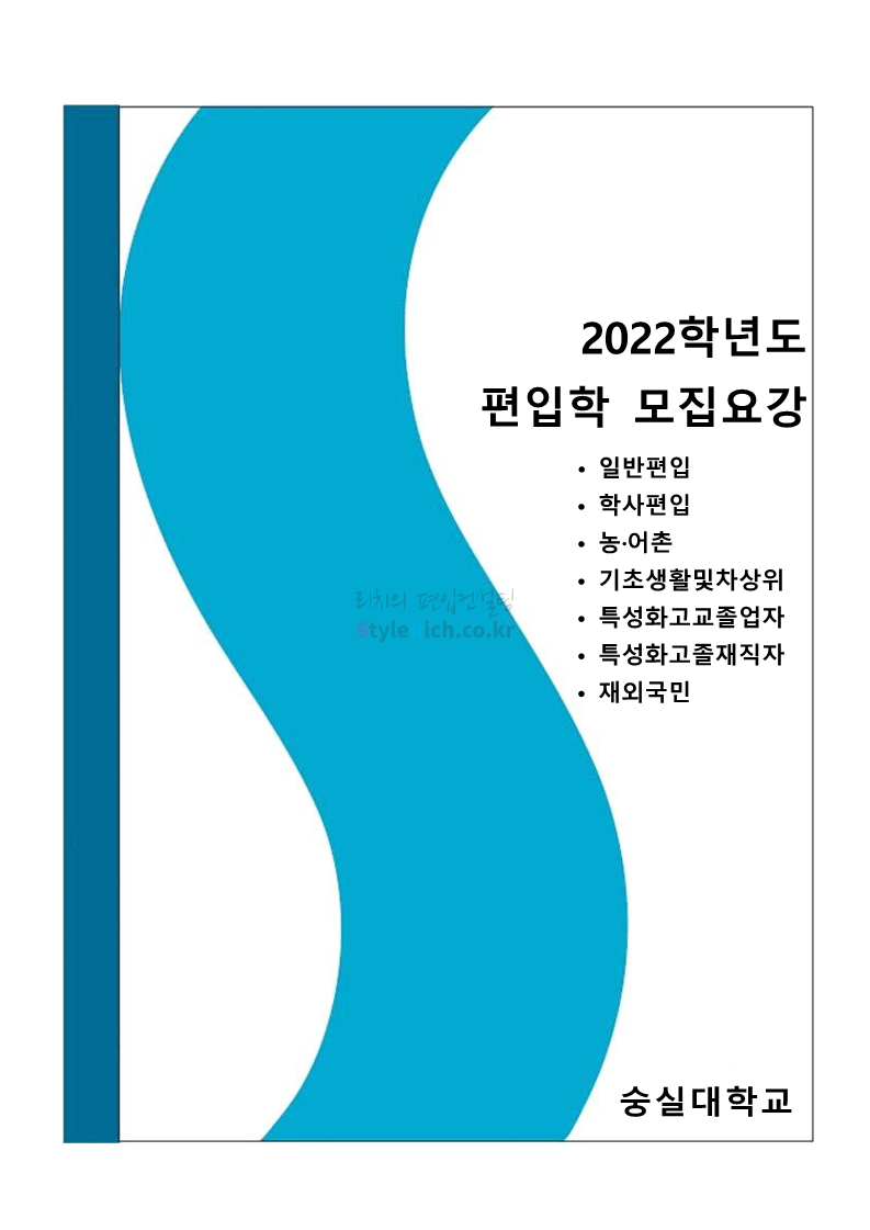 숭실대 편입 2022학년도 모집요강 간편하게 보자! 2021.12.06 23:01 편입 모집요강/2022학년도 모집요강 2022학년도 숭실대 편입 모집요강(2021.12.06 기준)을 간편하게 확인하세요. * 최종 모집요강 발표 이후에도 내용의 일부가 변경될 수 있으니 지원 전 반드시 숭실대 입학처의 모집요강을 확인 바랍니다. 2022학년도 숭실대 편입 모집요강 다운받기 <출처: 숭실대> 🍁숭실의 가을 “가을의 시(詩)기” 🍁 공유하기 게시글 관리 리치의 편입컨설팅 저작자표시 비영리 변경금지 (새창열림) '편입 모집요강 > 2022학년도 모집요강' 카테고리의 다른 글 용인대 편입 2022학년도 모집요강 간편하게 보자! (0) 2021.12.06 한국산업기술대 편입 2022학년도 모집요강 간편하게 보자! (0) 2021.12.06 경희대 편입 2022학년도 모집요강 간편하게 보자! (0) 2021.12.06 영남대 편입 2022학년도 모집요강 간편하게 보자! (0) 2021.12.04 인하대 편입 2022학년도 모집요강 간편하게 보자! (0) 2021.12.04 댓글 공유하기 다른 글 댓글 이 글 공유하기 구독하기 구독하기 카카오톡 카카오톡 라인 라인 트위터 트위터 Facebook Facebook 카카오스토리 카카오스토리 밴드 밴드 네이버 블로그 네이버 블로그 Pocket Pocket Evernote Evernote 다른 글 용인대 편입 2022학년도 모집요강 간편하게 보자! 용인대 편입 2022학년도 모집요강 간편하게 보자! 2021.12.06 한국산업기술대 편입 2022학년도 모집요강 간편하게 보자! 한국산업기술대 편입 2022학년도 모집요강 간편하게 보자! 2021.12.06 경희대 편입 2022학년도 모집요강 간편하게 보자! 경희대 편입 2022학년도 모집요강 간편하게 보자! 2021.12.06 영남대 편입 2022학년도 모집요강 간편하게 보자! 영남대 편입 2022학년도 모집요강 간편하게 보자! 2021.12.04 다른 글 더 둘러보기