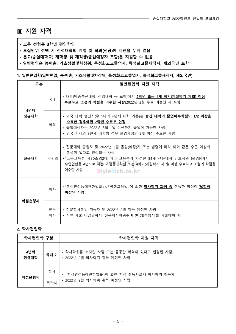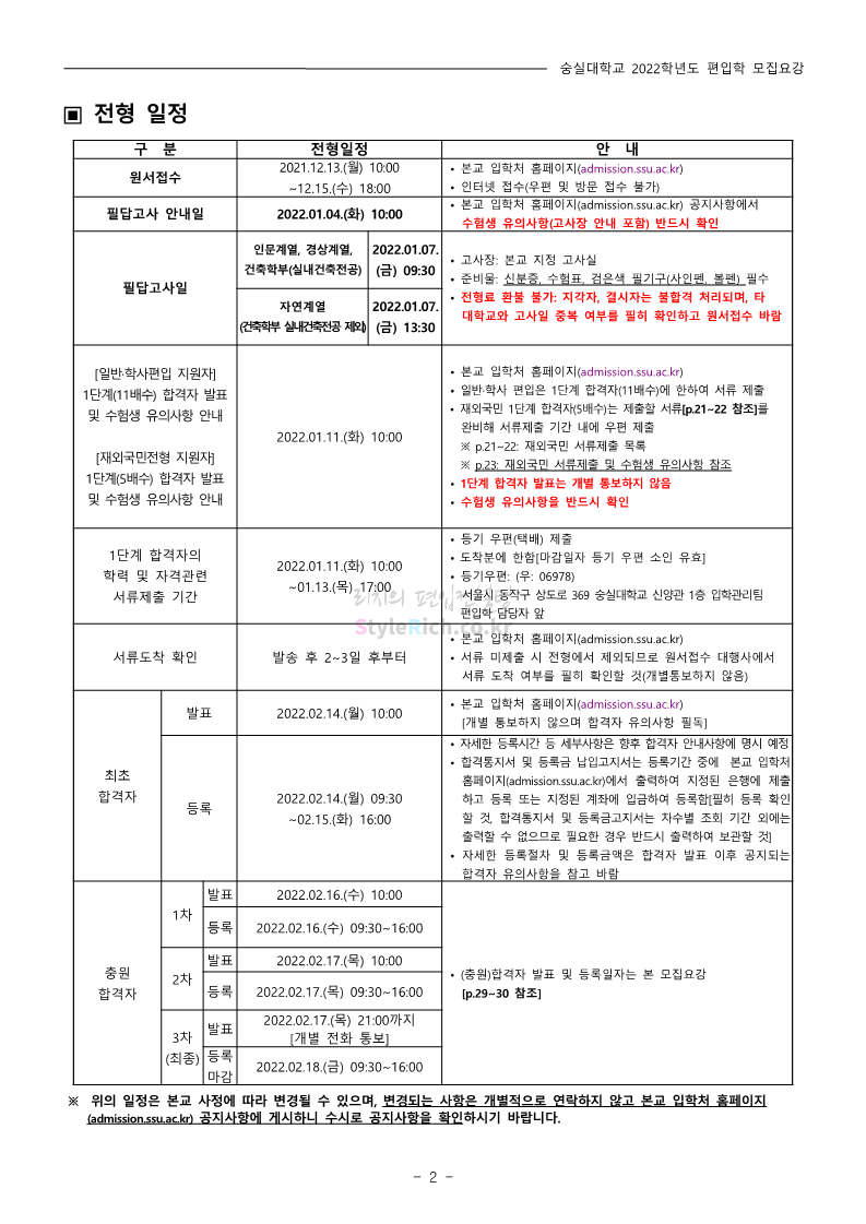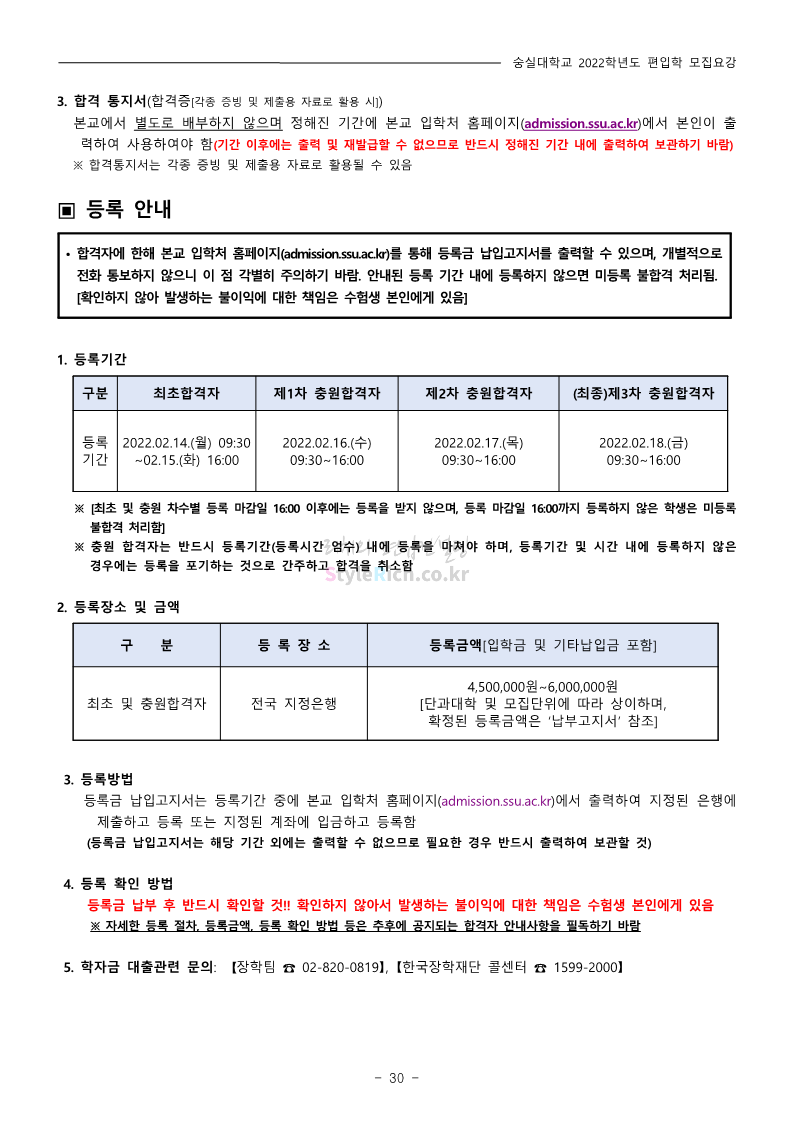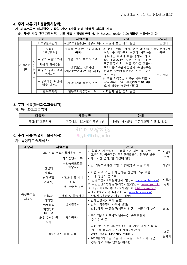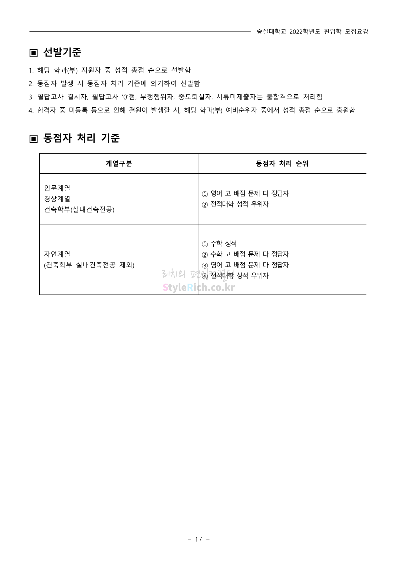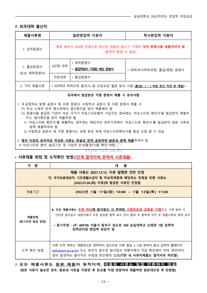 숭실대 편입 2022학년도 모집요강 간편하게 보자! 2021.12.06 23:01 편입 모집요강/2022학년도 모집요강 2022학년도 숭실대 편입 모집요강(2021.12.06 기준)을 간편하게 확인하세요. * 최종 모집요강 발표 이후에도 내용의 일부가 변경될 수 있으니 지원 전 반드시 숭실대 입학처의 모집요강을 확인 바랍니다. 2022학년도 숭실대 편입 모집요강 다운받기 <출처: 숭실대> 🍁숭실의 가을 “가을의 시(詩)기” 🍁 공유하기 게시글 관리 리치의 편입컨설팅 저작자표시 비영리 변경금지 (새창열림) '편입 모집요강 > 2022학년도 모집요강' 카테고리의 다른 글 용인대 편입 2022학년도 모집요강 간편하게 보자! (0) 2021.12.06 한국산업기술대 편입 2022학년도 모집요강 간편하게 보자! (0) 2021.12.06 경희대 편입 2022학년도 모집요강 간편하게 보자! (0) 2021.12.06 영남대 편입 2022학년도 모집요강 간편하게 보자! (0) 2021.12.04 인하대 편입 2022학년도 모집요강 간편하게 보자! (0) 2021.12.04 댓글 공유하기 다른 글 댓글 이 글 공유하기 구독하기 구독하기 카카오톡 카카오톡 라인 라인 트위터 트위터 Facebook Facebook 카카오스토리 카카오스토리 밴드 밴드 네이버 블로그 네이버 블로그 Pocket Pocket Evernote Evernote 다른 글 용인대 편입 2022학년도 모집요강 간편하게 보자! 용인대 편입 2022학년도 모집요강 간편하게 보자! 2021.12.06 한국산업기술대 편입 2022학년도 모집요강 간편하게 보자! 한국산업기술대 편입 2022학년도 모집요강 간편하게 보자! 2021.12.06 경희대 편입 2022학년도 모집요강 간편하게 보자! 경희대 편입 2022학년도 모집요강 간편하게 보자! 2021.12.06 영남대 편입 2022학년도 모집요강 간편하게 보자! 영남대 편입 2022학년도 모집요강 간편하게 보자! 2021.12.04 다른 글 더 둘러보기