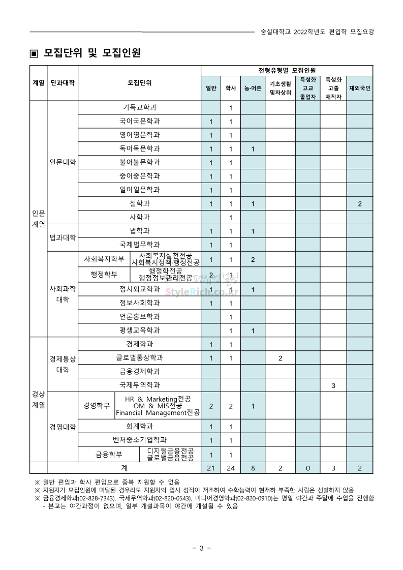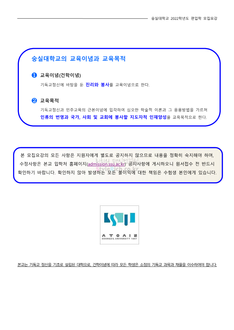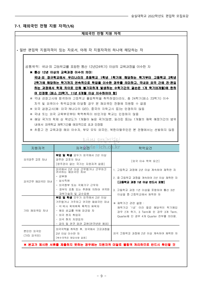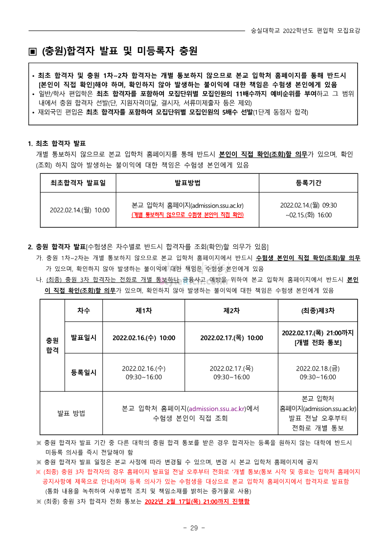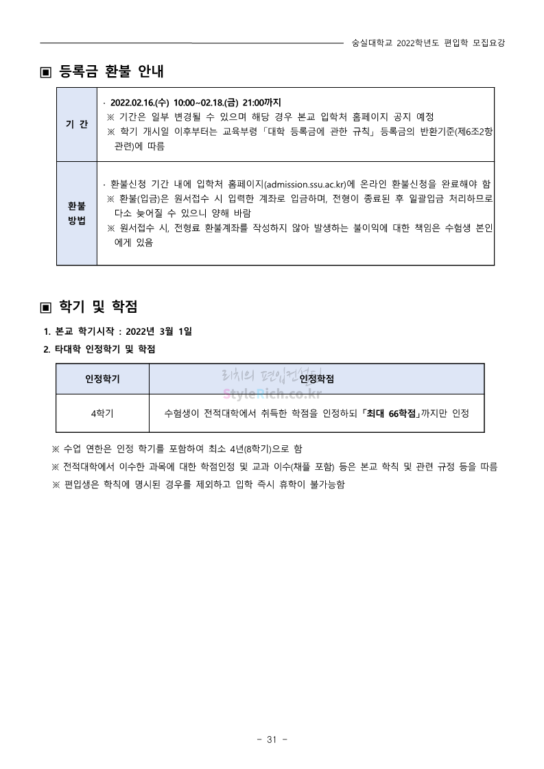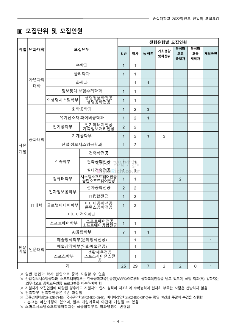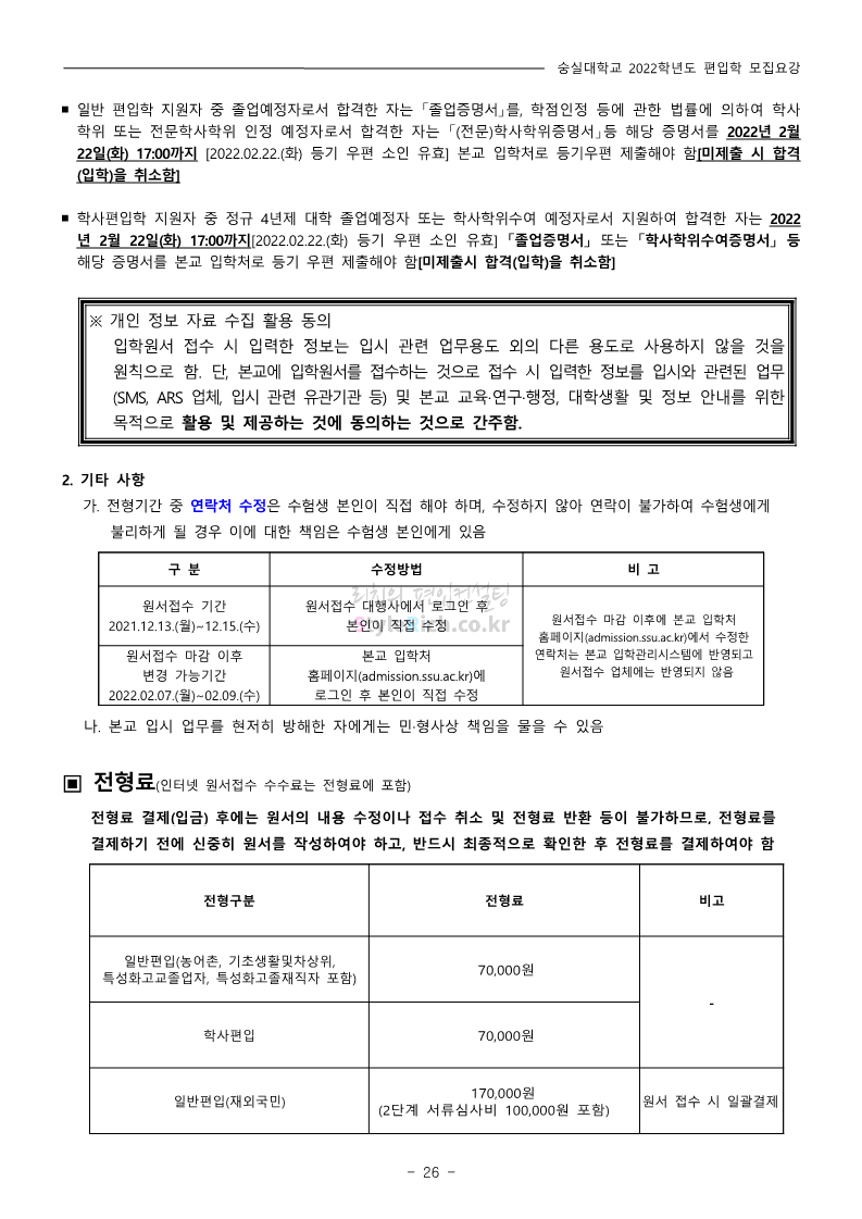 숭실대 편입 2022학년도 모집요강 간편하게 보자! 2021.12.06 23:01 편입 모집요강/2022학년도 모집요강 2022학년도 숭실대 편입 모집요강(2021.12.06 기준)을 간편하게 확인하세요. * 최종 모집요강 발표 이후에도 내용의 일부가 변경될 수 있으니 지원 전 반드시 숭실대 입학처의 모집요강을 확인 바랍니다. 2022학년도 숭실대 편입 모집요강 다운받기 <출처: 숭실대> 🍁숭실의 가을 “가을의 시(詩)기” 🍁 공유하기 게시글 관리 리치의 편입컨설팅 저작자표시 비영리 변경금지 (새창열림) '편입 모집요강 > 2022학년도 모집요강' 카테고리의 다른 글 용인대 편입 2022학년도 모집요강 간편하게 보자! (0) 2021.12.06 한국산업기술대 편입 2022학년도 모집요강 간편하게 보자! (0) 2021.12.06 경희대 편입 2022학년도 모집요강 간편하게 보자! (0) 2021.12.06 영남대 편입 2022학년도 모집요강 간편하게 보자! (0) 2021.12.04 인하대 편입 2022학년도 모집요강 간편하게 보자! (0) 2021.12.04 댓글 공유하기 다른 글 댓글 이 글 공유하기 구독하기 구독하기 카카오톡 카카오톡 라인 라인 트위터 트위터 Facebook Facebook 카카오스토리 카카오스토리 밴드 밴드 네이버 블로그 네이버 블로그 Pocket Pocket Evernote Evernote 다른 글 용인대 편입 2022학년도 모집요강 간편하게 보자! 용인대 편입 2022학년도 모집요강 간편하게 보자! 2021.12.06 한국산업기술대 편입 2022학년도 모집요강 간편하게 보자! 한국산업기술대 편입 2022학년도 모집요강 간편하게 보자! 2021.12.06 경희대 편입 2022학년도 모집요강 간편하게 보자! 경희대 편입 2022학년도 모집요강 간편하게 보자! 2021.12.06 영남대 편입 2022학년도 모집요강 간편하게 보자! 영남대 편입 2022학년도 모집요강 간편하게 보자! 2021.12.04 다른 글 더 둘러보기