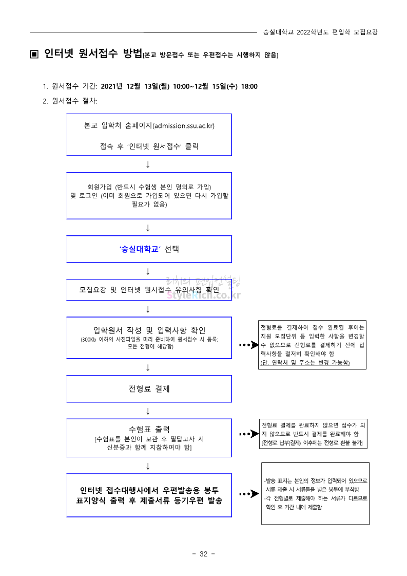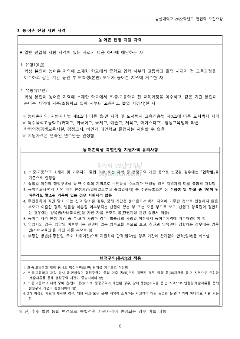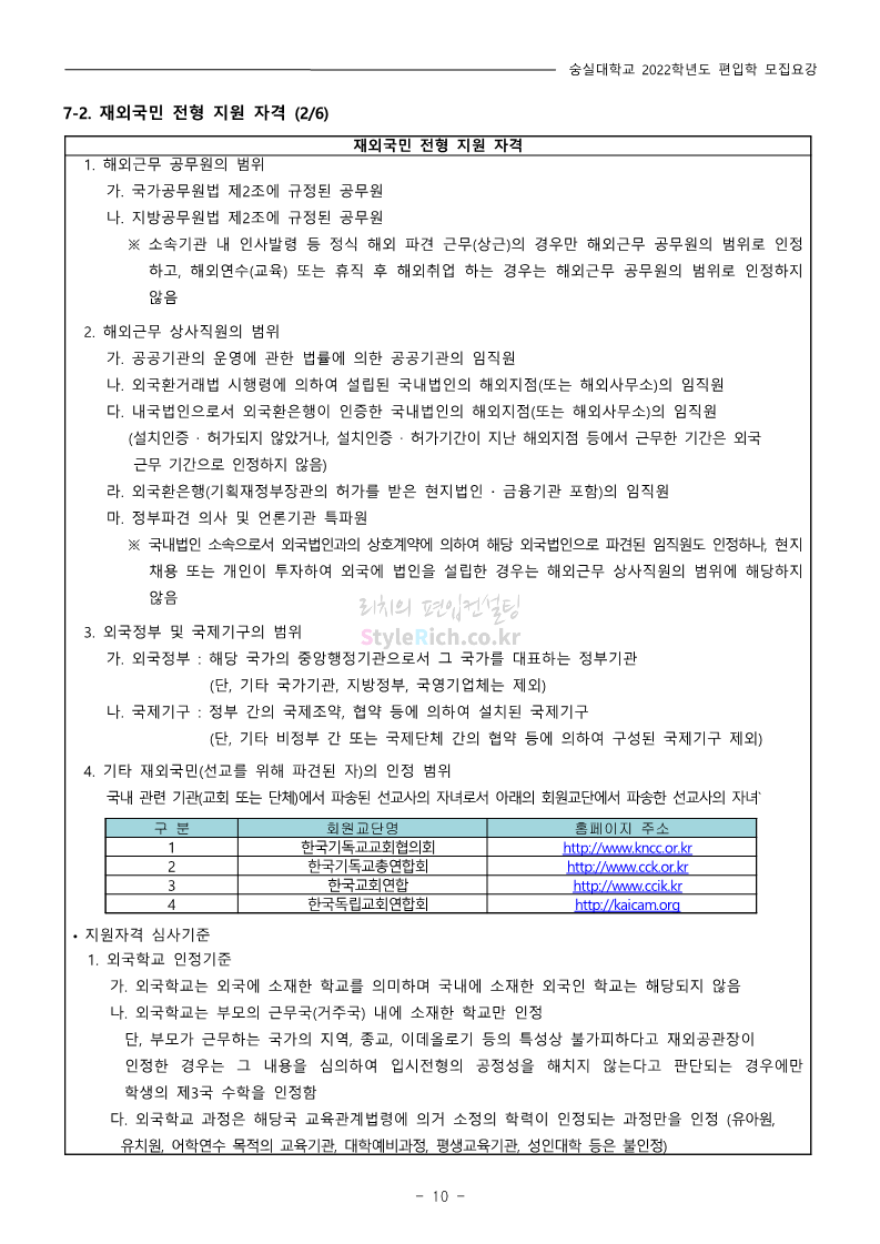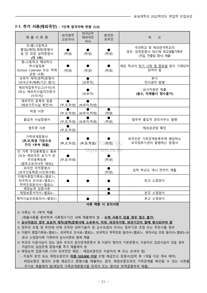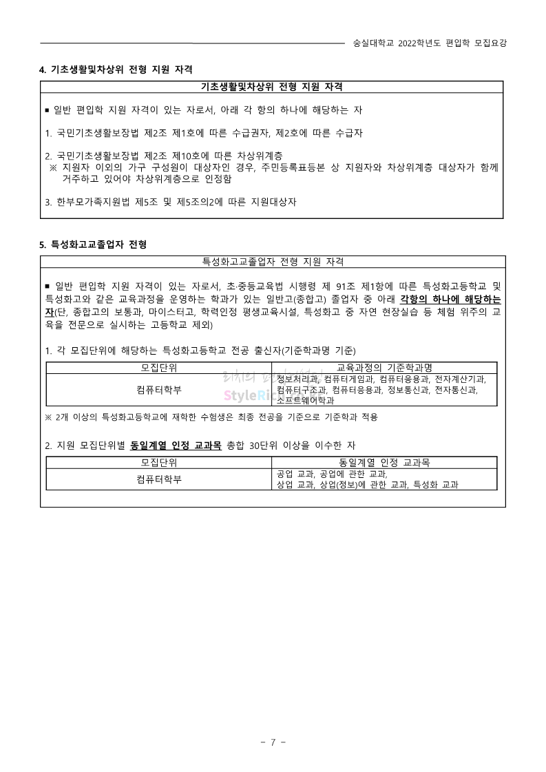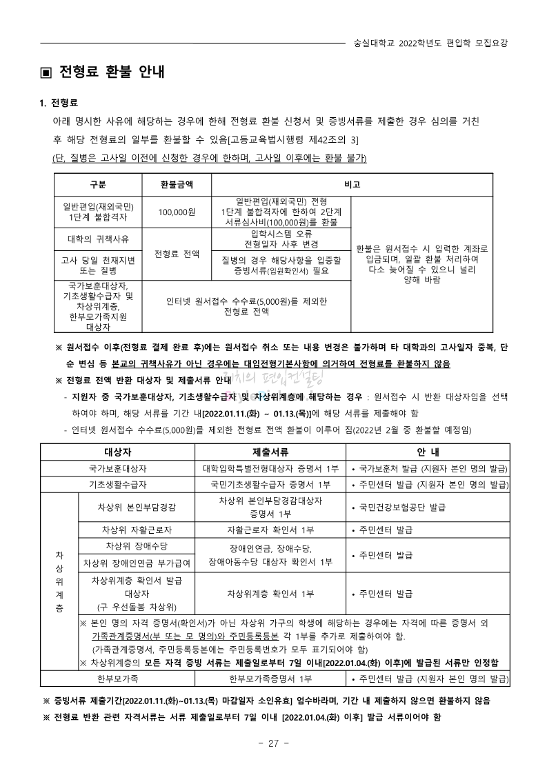 숭실대 편입 2022학년도 모집요강 간편하게 보자! 2021.12.06 23:01 편입 모집요강/2022학년도 모집요강 2022학년도 숭실대 편입 모집요강(2021.12.06 기준)을 간편하게 확인하세요. * 최종 모집요강 발표 이후에도 내용의 일부가 변경될 수 있으니 지원 전 반드시 숭실대 입학처의 모집요강을 확인 바랍니다. 2022학년도 숭실대 편입 모집요강 다운받기 <출처: 숭실대> 🍁숭실의 가을 “가을의 시(詩)기” 🍁 공유하기 게시글 관리 리치의 편입컨설팅 저작자표시 비영리 변경금지 (새창열림) '편입 모집요강 > 2022학년도 모집요강' 카테고리의 다른 글 용인대 편입 2022학년도 모집요강 간편하게 보자! (0) 2021.12.06 한국산업기술대 편입 2022학년도 모집요강 간편하게 보자! (0) 2021.12.06 경희대 편입 2022학년도 모집요강 간편하게 보자! (0) 2021.12.06 영남대 편입 2022학년도 모집요강 간편하게 보자! (0) 2021.12.04 인하대 편입 2022학년도 모집요강 간편하게 보자! (0) 2021.12.04 댓글 공유하기 다른 글 댓글 이 글 공유하기 구독하기 구독하기 카카오톡 카카오톡 라인 라인 트위터 트위터 Facebook Facebook 카카오스토리 카카오스토리 밴드 밴드 네이버 블로그 네이버 블로그 Pocket Pocket Evernote Evernote 다른 글 용인대 편입 2022학년도 모집요강 간편하게 보자! 용인대 편입 2022학년도 모집요강 간편하게 보자! 2021.12.06 한국산업기술대 편입 2022학년도 모집요강 간편하게 보자! 한국산업기술대 편입 2022학년도 모집요강 간편하게 보자! 2021.12.06 경희대 편입 2022학년도 모집요강 간편하게 보자! 경희대 편입 2022학년도 모집요강 간편하게 보자! 2021.12.06 영남대 편입 2022학년도 모집요강 간편하게 보자! 영남대 편입 2022학년도 모집요강 간편하게 보자! 2021.12.04 다른 글 더 둘러보기