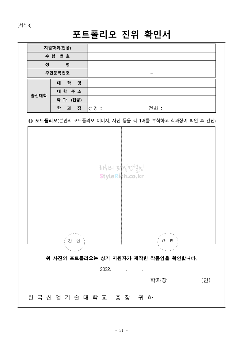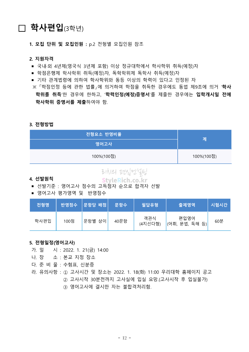 한국산업기술대 편입 2022학년도 모집요강 간편하게 보자! 2021.12.06 23:16 편입 모집요강/2022학년도 모집요강 2022학년도 한국산업기술대 편입 모집요강(2021.12.06 기준)을 간편하게 확인하세요. * 최종 모집요강 발표 이후에도 내용의 일부가 변경될 수 있으니 지원 전 반드시 한국산업기술대 입학처의 모집요강을 확인 바랍니다. 2022학년도 한국산업기술대 편입 모집요강 다운받기 <출처: 한국산업기술대> 산기생활 유형 모아봤다!! | KPU 공감 VS 공유하기 게시글 관리 리치의 편입컨설팅 저작자표시 비영리 변경금지 (새창열림) '편입 모집요강 > 2022학년도 모집요강' 카테고리의 다른 글 부산대 편입 2022학년도 모집요강 간편하게 보자! (0) 2021.12.07 용인대 편입 2022학년도 모집요강 간편하게 보자! (0) 2021.12.06 숭실대 편입 2022학년도 모집요강 간편하게 보자! (0) 2021.12.06 경희대 편입 2022학년도 모집요강 간편하게 보자! (0) 2021.12.06 영남대 편입 2022학년도 모집요강 간편하게 보자! (0) 2021.12.04 댓글 공유하기 다른 글 댓글 이 글 공유하기 구독하기 구독하기 카카오톡 카카오톡 라인 라인 트위터 트위터 Facebook Facebook 카카오스토리 카카오스토리 밴드 밴드 네이버 블로그 네이버 블로그 Pocket Pocket Evernote Evernote 다른 글 부산대 편입 2022학년도 모집요강 간편하게 보자! 부산대 편입 2022학년도 모집요강 간편하게 보자! 2021.12.07 용인대 편입 2022학년도 모집요강 간편하게 보자! 용인대 편입 2022학년도 모집요강 간편하게 보자! 2021.12.06 숭실대 편입 2022학년도 모집요강 간편하게 보자! 숭실대 편입 2022학년도 모집요강 간편하게 보자! 2021.12.06 경희대 편입 2022학년도 모집요강 간편하게 보자! 경희대 편입 2022학년도 모집요강 간편하게 보자! 2021.12.06 다른 글 더 둘러보기