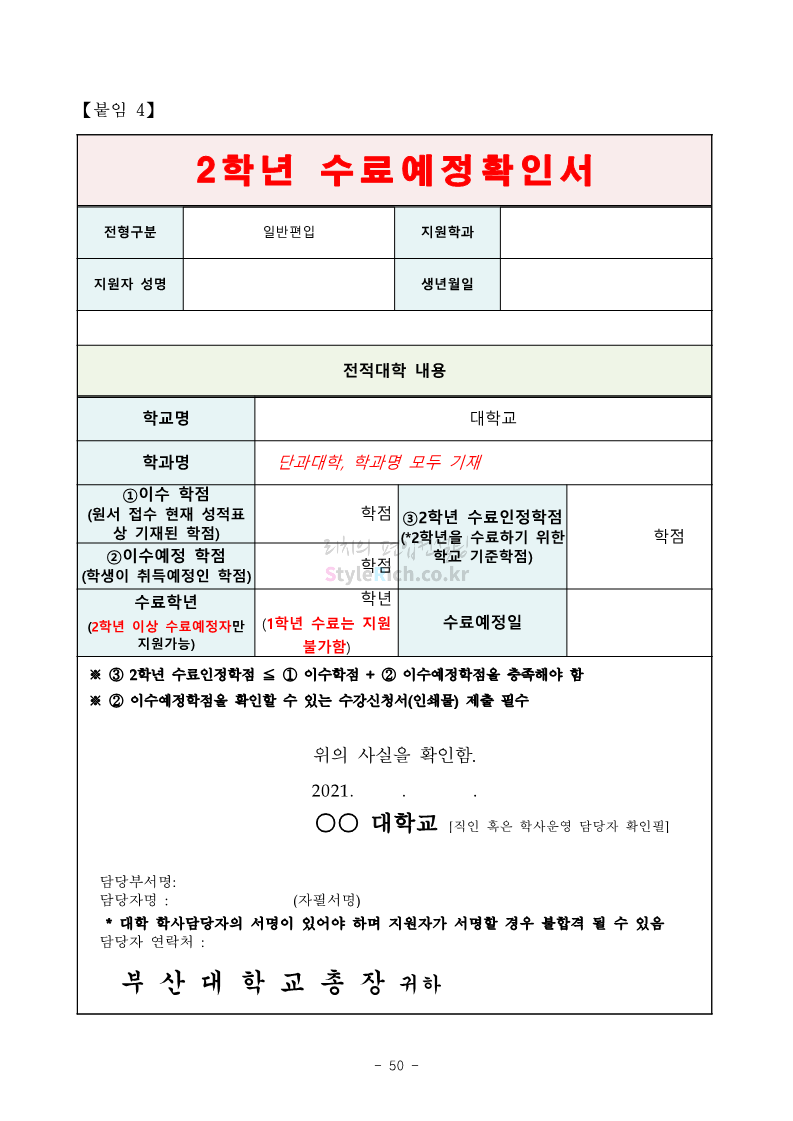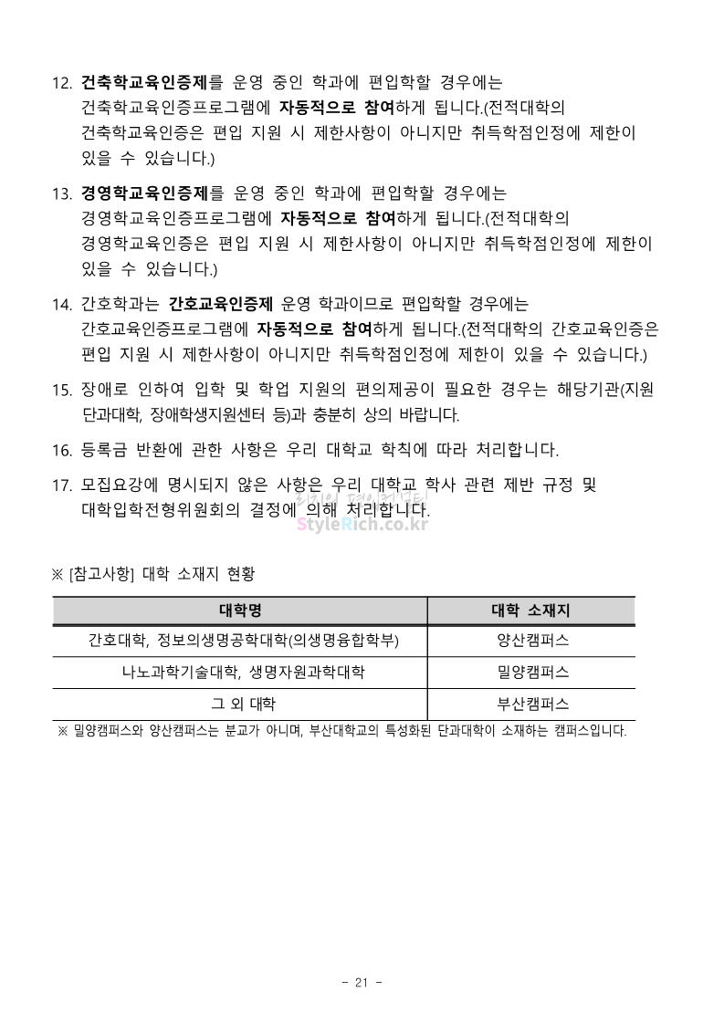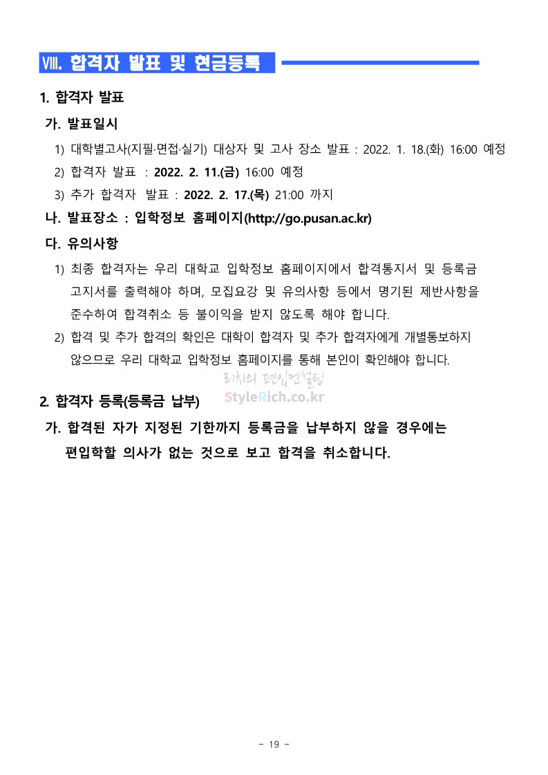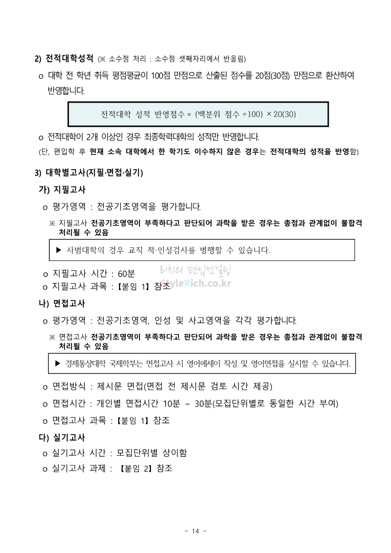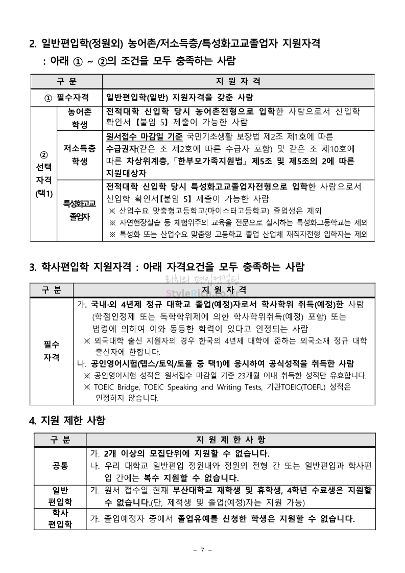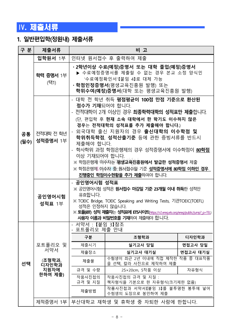 부산대 편입 2022학년도 모집요강 간편하게 보자! 2021.12.07 00:07 편입 모집요강/2022학년도 모집요강 2022학년도 부산대 편입 모집요강(2021.12.06 기준)을 간편하게 확인하세요. * 최종 모집요강 발표 이후에도 내용의 일부가 변경될 수 있으니 지원 전 반드시 부산대 입학처의 모집요강을 확인 바랍니다. 2022학년도 부산대 편입 모집요강 다운받기 <출처: 부산대> 2021 독서 한마당 보이는 라디오 (겨울서점) 부산대학교 유튜브 라이브 공유하기 게시글 관리 리치의 편입컨설팅 저작자표시 비영리 변경금지 (새창열림) '편입 모집요강 > 2022학년도 모집요강' 카테고리의 다른 글 세종대 편입 2022학년도 모집요강 간편하게 보자! (0) 2021.12.07 충남대 편입 2022학년도 모집요강 간편하게 보자! (0) 2021.12.07 용인대 편입 2022학년도 모집요강 간편하게 보자! (0) 2021.12.06 한국산업기술대 편입 2022학년도 모집요강 간편하게 보자! (0) 2021.12.06 숭실대 편입 2022학년도 모집요강 간편하게 보자! (0) 2021.12.06 댓글 공유하기 다른 글 댓글 이 글 공유하기 구독하기 구독하기 카카오톡 카카오톡 라인 라인 트위터 트위터 Facebook Facebook 카카오스토리 카카오스토리 밴드 밴드 네이버 블로그 네이버 블로그 Pocket Pocket Evernote Evernote 다른 글 세종대 편입 2022학년도 모집요강 간편하게 보자! 세종대 편입 2022학년도 모집요강 간편하게 보자! 2021.12.07 충남대 편입 2022학년도 모집요강 간편하게 보자! 충남대 편입 2022학년도 모집요강 간편하게 보자! 2021.12.07 용인대 편입 2022학년도 모집요강 간편하게 보자! 용인대 편입 2022학년도 모집요강 간편하게 보자! 2021.12.06 한국산업기술대 편입 2022학년도 모집요강 간편하게 보자! 한국산업기술대 편입 2022학년도 모집요강 간편하게 보자! 2021.12.06 다른 글 더 둘러보기