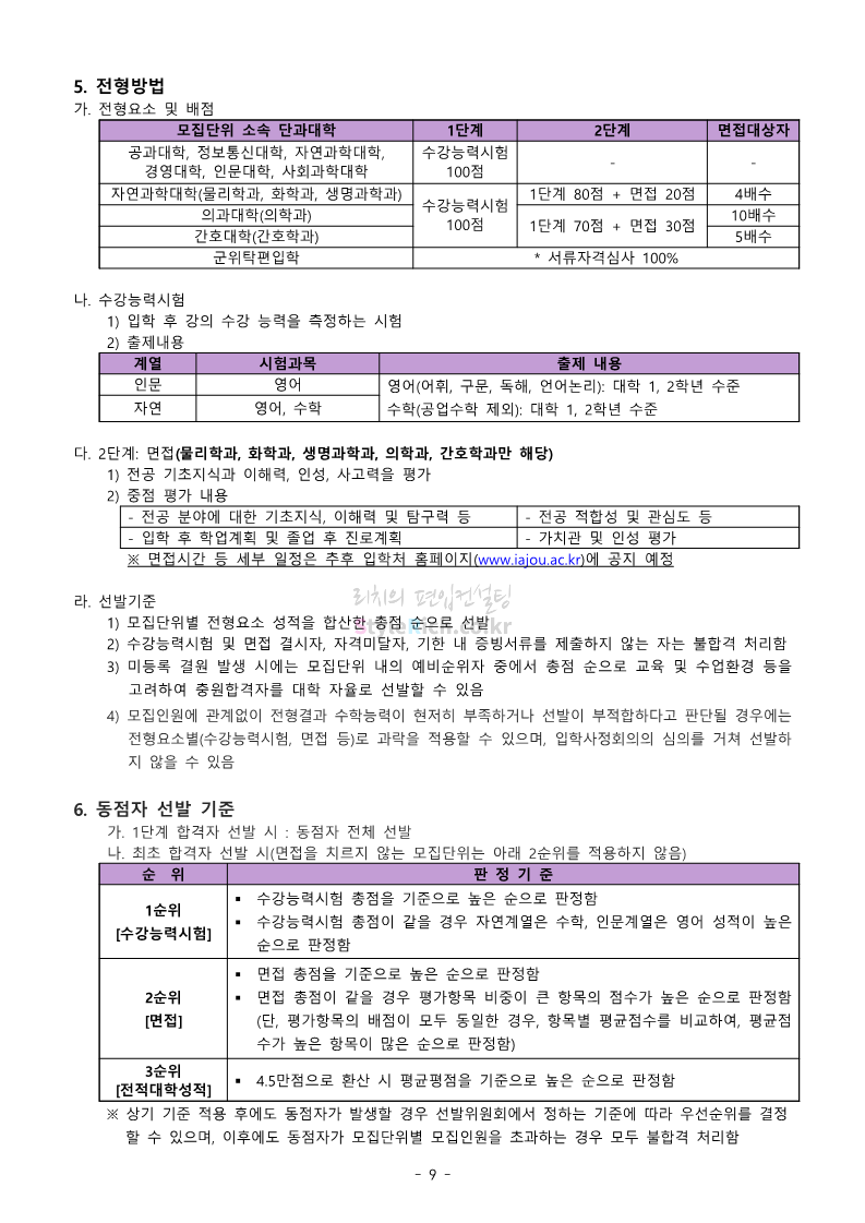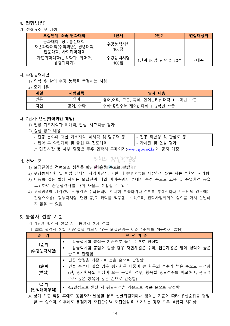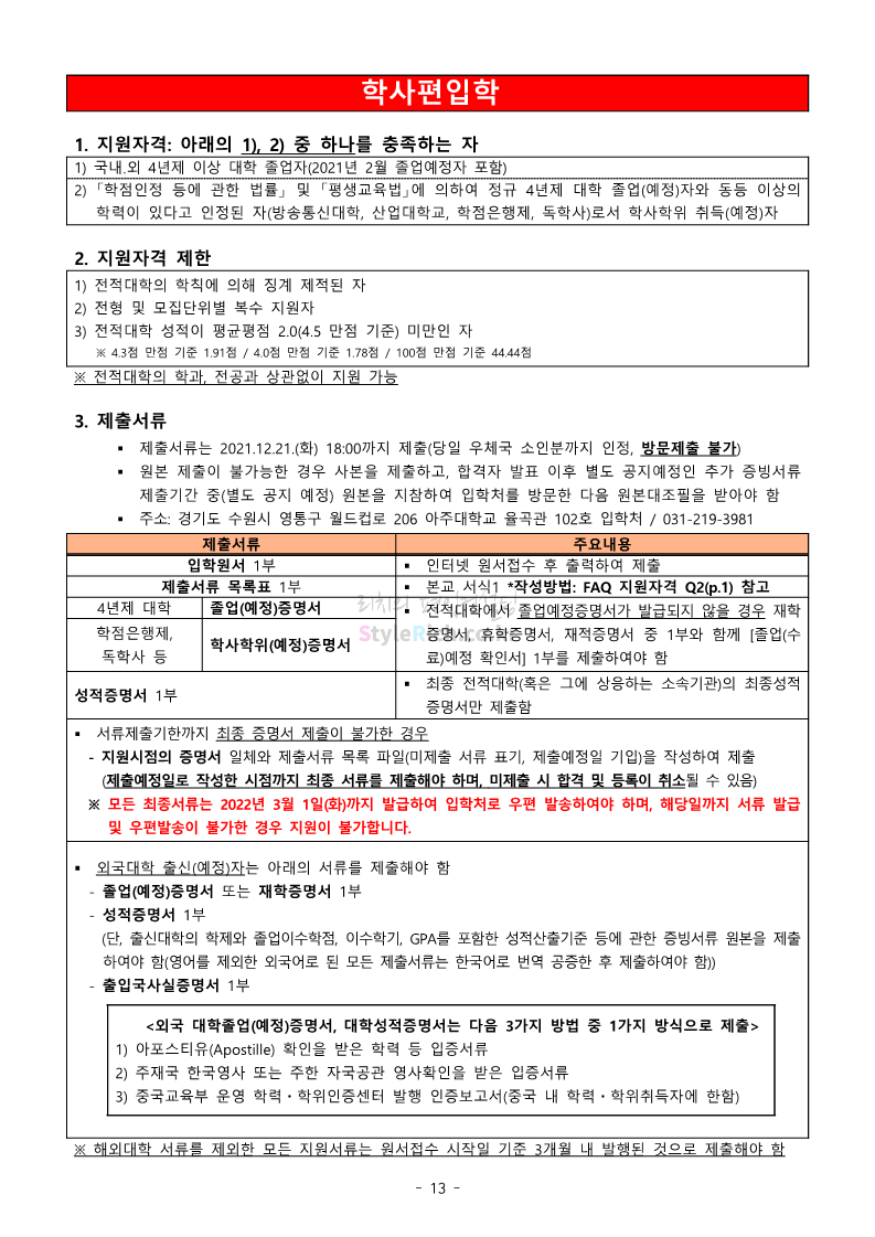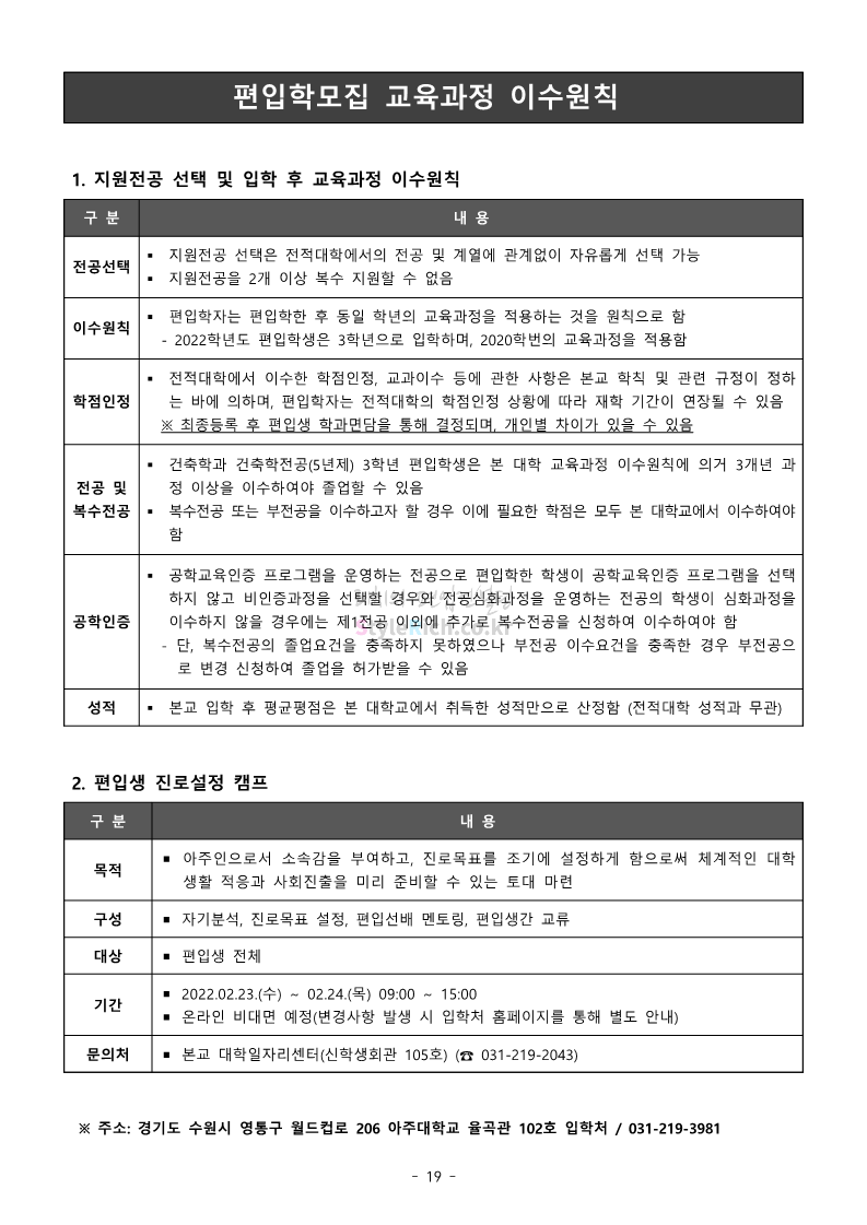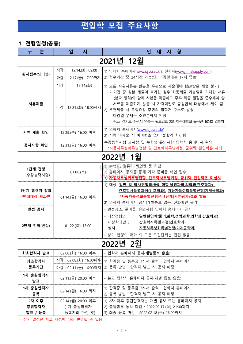 아주대 편입 2022학년도 모집요강 간편하게 보자! 2021.12.07 22:07 편입 모집요강/2022학년도 모집요강 2022학년도 아주대 편입 모집요강(2021.12.07 기준)을 간편하게 확인하세요. * 최종 모집요강 발표 이후에도 내용의 일부가 변경될 수 있으니 지원 전 반드시 아주대 입학처의 모집요강을 확인 바랍니다. 2022학년도 아주대 편입 모집요강 다운받기 <출처: 아주대> [📌면접안내영상] 2022학년도 면접전형 유의사항 안내(오징어게임ver.) 공유하기 게시글 관리 리치의 편입컨설팅 저작자표시 비영리 변경금지 (새창열림) '편입 모집요강 > 2022학년도 모집요강' 카테고리의 다른 글 안양대 편입 2022학년도 모집요강 간편하게 보자! (0) 2021.12.07 중앙대 편입 2022학년도 모집요강 간편하게 보자! (0) 2021.12.07 세종대 편입 2022학년도 모집요강 간편하게 보자! (0) 2021.12.07 충남대 편입 2022학년도 모집요강 간편하게 보자! (0) 2021.12.07 부산대 편입 2022학년도 모집요강 간편하게 보자! (0) 2021.12.07 댓글 공유하기 다른 글 댓글 이 글 공유하기 구독하기 구독하기 카카오톡 카카오톡 라인 라인 트위터 트위터 Facebook Facebook 카카오스토리 카카오스토리 밴드 밴드 네이버 블로그 네이버 블로그 Pocket Pocket Evernote Evernote 다른 글 안양대 편입 2022학년도 모집요강 간편하게 보자! 안양대 편입 2022학년도 모집요강 간편하게 보자! 2021.12.07 중앙대 편입 2022학년도 모집요강 간편하게 보자! 중앙대 편입 2022학년도 모집요강 간편하게 보자! 2021.12.07 세종대 편입 2022학년도 모집요강 간편하게 보자! 세종대 편입 2022학년도 모집요강 간편하게 보자! 2021.12.07 충남대 편입 2022학년도 모집요강 간편하게 보자! 충남대 편입 2022학년도 모집요강 간편하게 보자! 2021.12.07 다른 글 더 둘러보기
