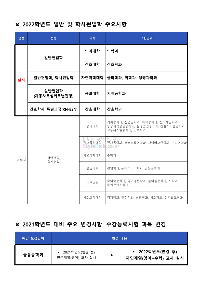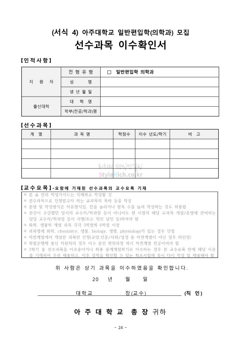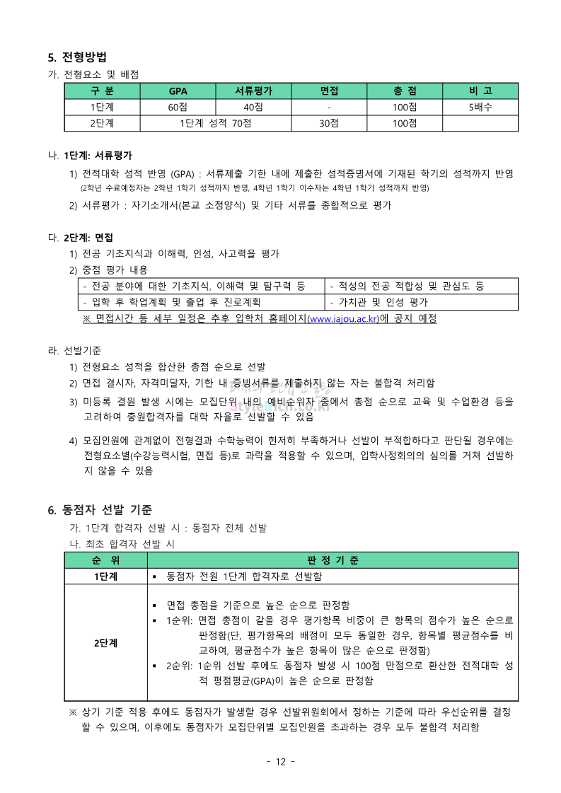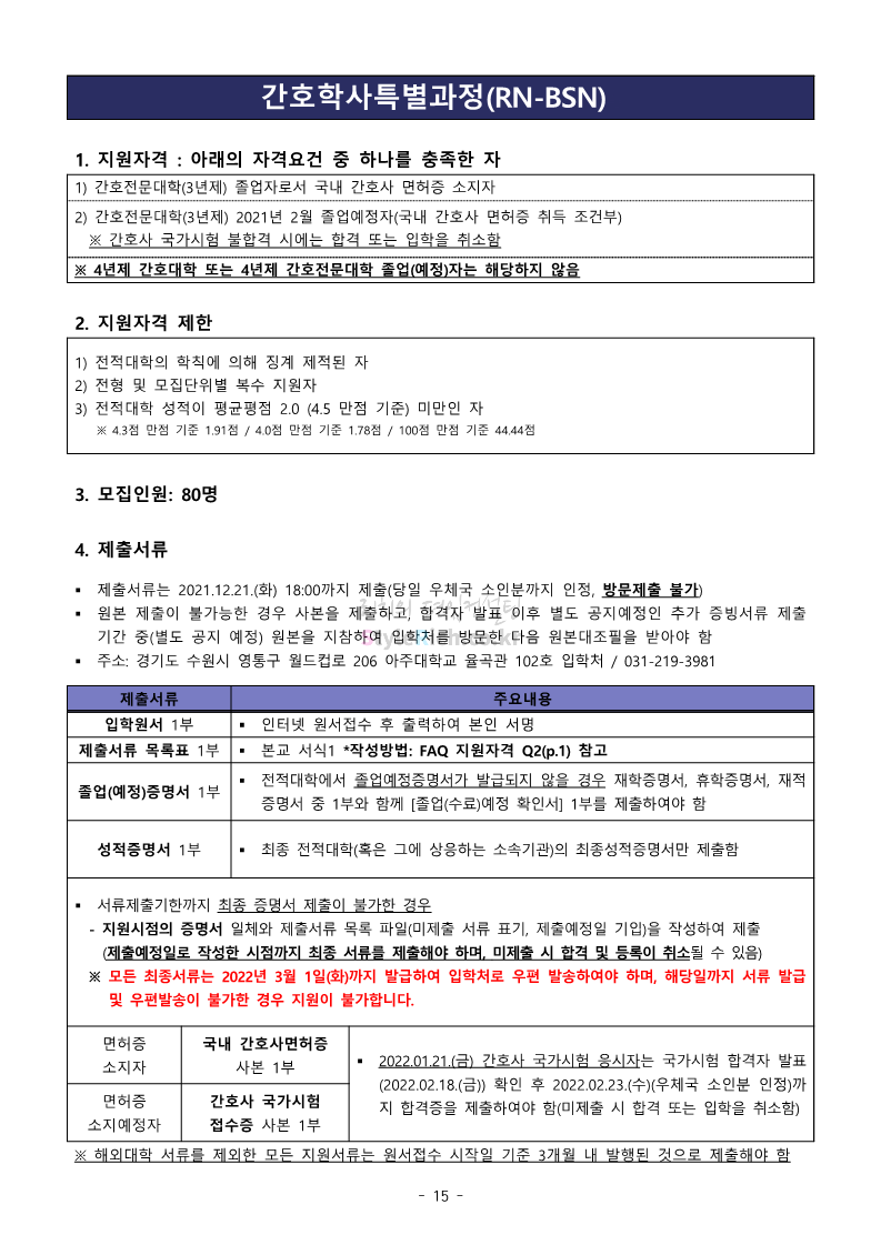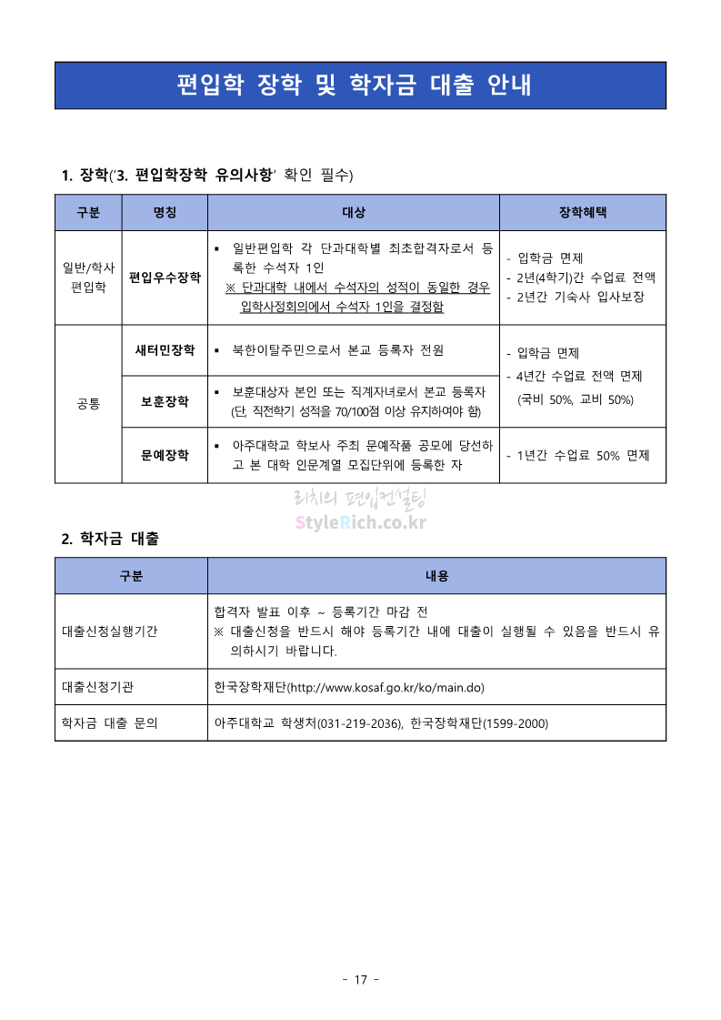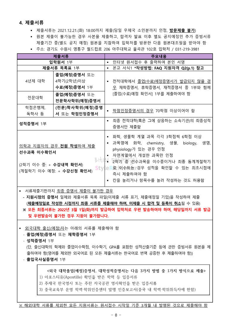 아주대 편입 2022학년도 모집요강 간편하게 보자! 2021.12.07 22:07 편입 모집요강/2022학년도 모집요강 2022학년도 아주대 편입 모집요강(2021.12.07 기준)을 간편하게 확인하세요. * 최종 모집요강 발표 이후에도 내용의 일부가 변경될 수 있으니 지원 전 반드시 아주대 입학처의 모집요강을 확인 바랍니다. 2022학년도 아주대 편입 모집요강 다운받기 <출처: 아주대> [📌면접안내영상] 2022학년도 면접전형 유의사항 안내(오징어게임ver.) 공유하기 게시글 관리 리치의 편입컨설팅 저작자표시 비영리 변경금지 (새창열림) '편입 모집요강 > 2022학년도 모집요강' 카테고리의 다른 글 안양대 편입 2022학년도 모집요강 간편하게 보자! (0) 2021.12.07 중앙대 편입 2022학년도 모집요강 간편하게 보자! (0) 2021.12.07 세종대 편입 2022학년도 모집요강 간편하게 보자! (0) 2021.12.07 충남대 편입 2022학년도 모집요강 간편하게 보자! (0) 2021.12.07 부산대 편입 2022학년도 모집요강 간편하게 보자! (0) 2021.12.07 댓글 공유하기 다른 글 댓글 이 글 공유하기 구독하기 구독하기 카카오톡 카카오톡 라인 라인 트위터 트위터 Facebook Facebook 카카오스토리 카카오스토리 밴드 밴드 네이버 블로그 네이버 블로그 Pocket Pocket Evernote Evernote 다른 글 안양대 편입 2022학년도 모집요강 간편하게 보자! 안양대 편입 2022학년도 모집요강 간편하게 보자! 2021.12.07 중앙대 편입 2022학년도 모집요강 간편하게 보자! 중앙대 편입 2022학년도 모집요강 간편하게 보자! 2021.12.07 세종대 편입 2022학년도 모집요강 간편하게 보자! 세종대 편입 2022학년도 모집요강 간편하게 보자! 2021.12.07 충남대 편입 2022학년도 모집요강 간편하게 보자! 충남대 편입 2022학년도 모집요강 간편하게 보자! 2021.12.07 다른 글 더 둘러보기