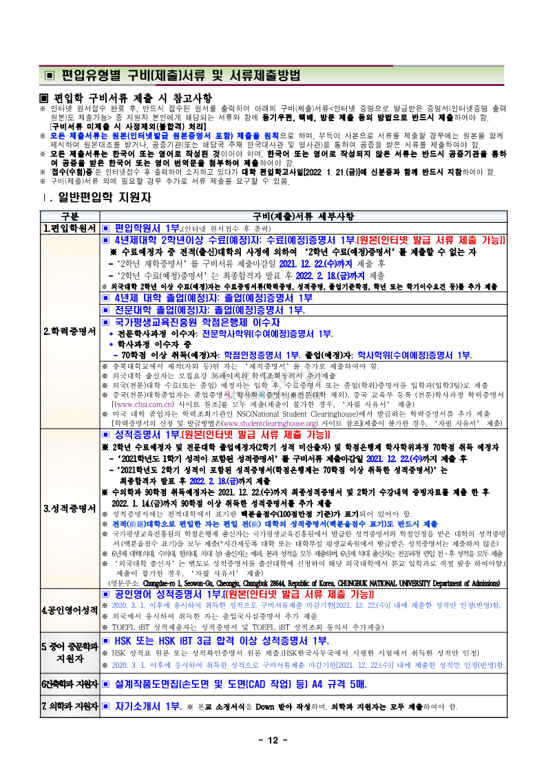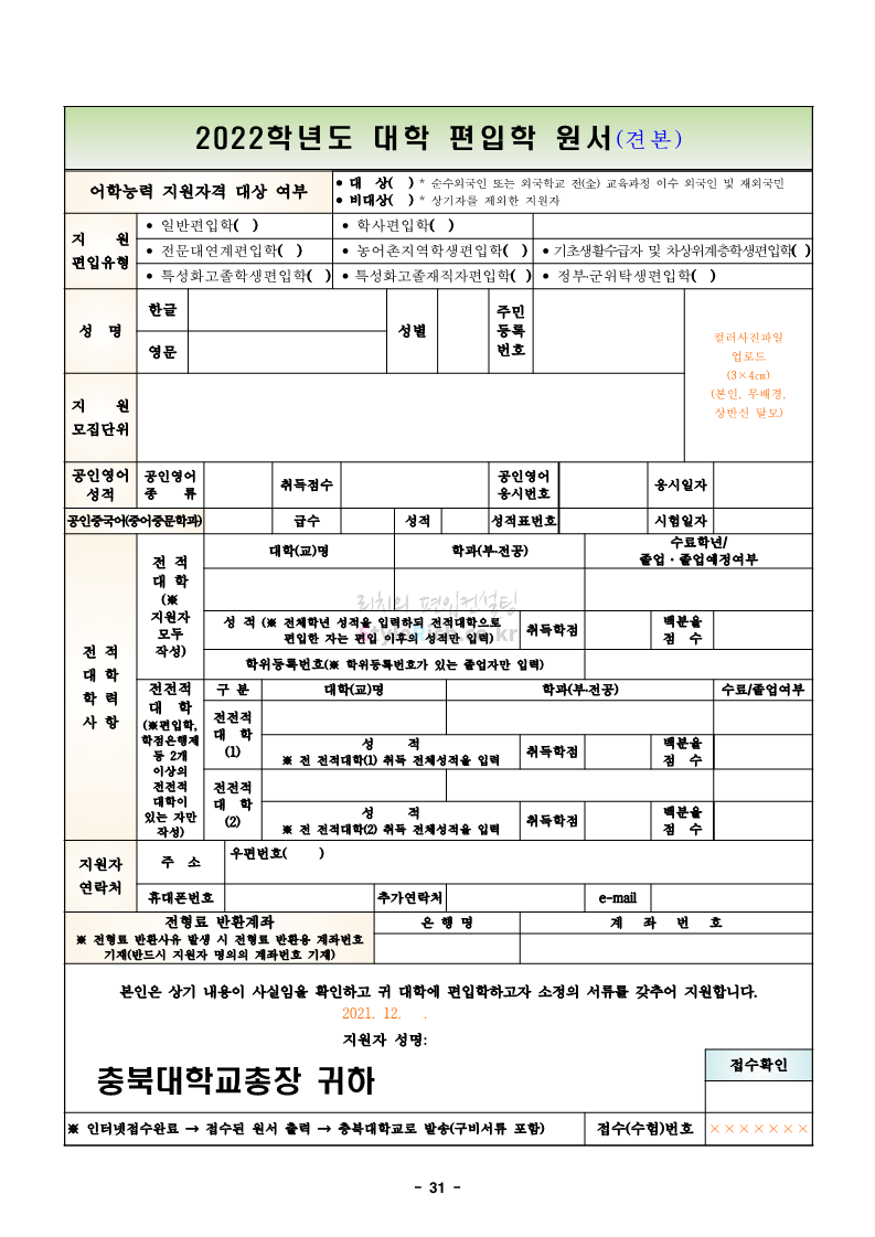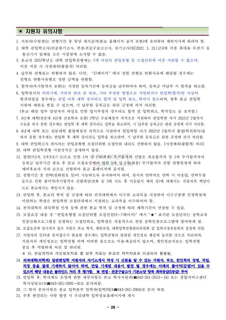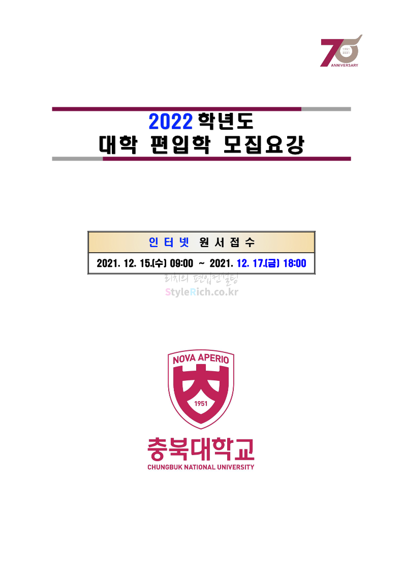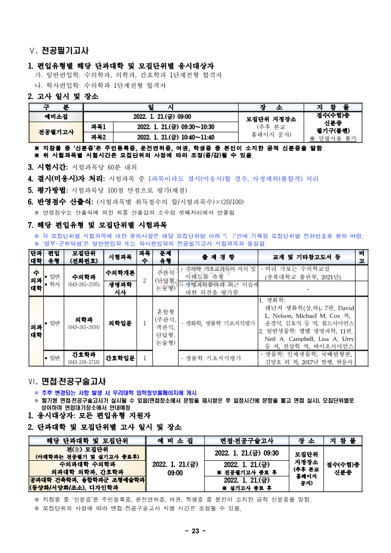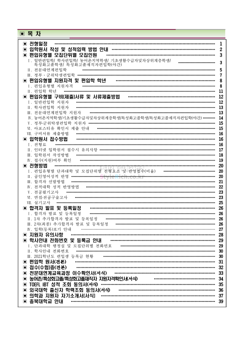 충북대 편입 2022학년도 모집요강 간편하게 보자! 2021.12.08 00:23 편입 모집요강/2022학년도 모집요강 2022학년도 충북대 편입 모집요강(2021.12.07 기준)을 간편하게 확인하세요. * 최종 모집요강 발표 이후에도 내용의 일부가 변경될 수 있으니 지원 전 반드시 충북대 입학처의 모집요강을 확인 바랍니다. 2022학년도 충북대 편입 모집요강 다운받기 <출처: 충북대> [충북대학교] 학교 안에 수영장, 스쿼시장, 헬스장까지 있다고? : CBNU 스포츠센터 체험기🏋🏻 공유하기 게시글 관리 리치의 편입컨설팅 저작자표시 비영리 변경금지 (새창열림) '편입 모집요강 > 2022학년도 모집요강' 카테고리의 다른 글 경북대 편입 2022학년도 모집요강 간편하게 보자! (0) 2021.12.08 서울시립대 편입 2022학년도 모집요강 간편하게 보자! (0) 2021.12.08 전남대 편입 2022학년도 모집요강 간편하게 보자! (0) 2021.12.07 안양대 편입 2022학년도 모집요강 간편하게 보자! (0) 2021.12.07 중앙대 편입 2022학년도 모집요강 간편하게 보자! (0) 2021.12.07 댓글 공유하기 다른 글 댓글 이 글 공유하기 구독하기 구독하기 카카오톡 카카오톡 라인 라인 트위터 트위터 Facebook Facebook 카카오스토리 카카오스토리 밴드 밴드 네이버 블로그 네이버 블로그 Pocket Pocket Evernote Evernote 다른 글 경북대 편입 2022학년도 모집요강 간편하게 보자! 경북대 편입 2022학년도 모집요강 간편하게 보자! 2021.12.08 서울시립대 편입 2022학년도 모집요강 간편하게 보자! 서울시립대 편입 2022학년도 모집요강 간편하게 보자! 2021.12.08 전남대 편입 2022학년도 모집요강 간편하게 보자! 전남대 편입 2022학년도 모집요강 간편하게 보자! 2021.12.07 안양대 편입 2022학년도 모집요강 간편하게 보자! 안양대 편입 2022학년도 모집요강 간편하게 보자! 2021.12.07 다른 글 더 둘러보기