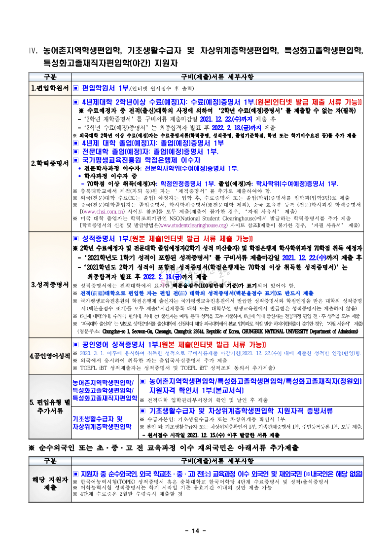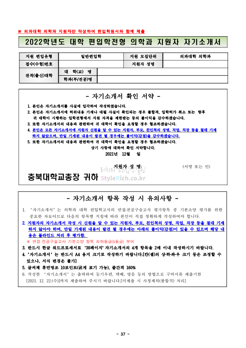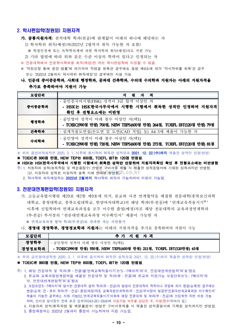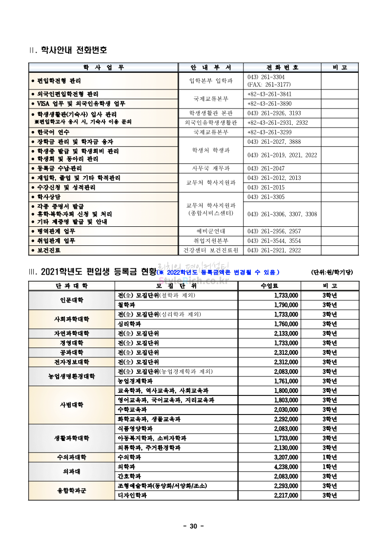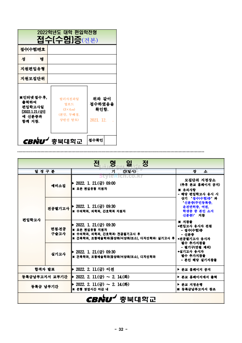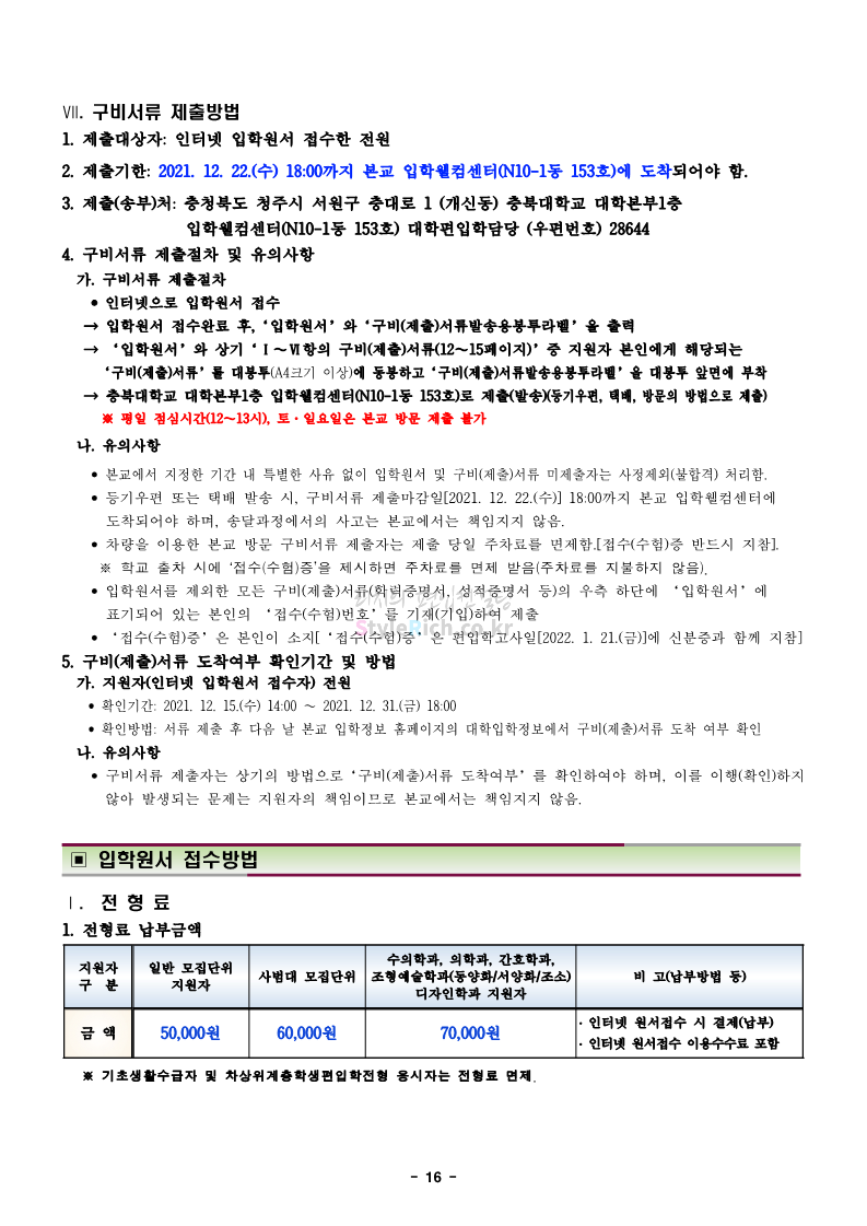 충북대 편입 2022학년도 모집요강 간편하게 보자! 2021.12.08 00:23 편입 모집요강/2022학년도 모집요강 2022학년도 충북대 편입 모집요강(2021.12.07 기준)을 간편하게 확인하세요. * 최종 모집요강 발표 이후에도 내용의 일부가 변경될 수 있으니 지원 전 반드시 충북대 입학처의 모집요강을 확인 바랍니다. 2022학년도 충북대 편입 모집요강 다운받기 <출처: 충북대> [충북대학교] 학교 안에 수영장, 스쿼시장, 헬스장까지 있다고? : CBNU 스포츠센터 체험기🏋🏻 공유하기 게시글 관리 리치의 편입컨설팅 저작자표시 비영리 변경금지 (새창열림) '편입 모집요강 > 2022학년도 모집요강' 카테고리의 다른 글 경북대 편입 2022학년도 모집요강 간편하게 보자! (0) 2021.12.08 서울시립대 편입 2022학년도 모집요강 간편하게 보자! (0) 2021.12.08 전남대 편입 2022학년도 모집요강 간편하게 보자! (0) 2021.12.07 안양대 편입 2022학년도 모집요강 간편하게 보자! (0) 2021.12.07 중앙대 편입 2022학년도 모집요강 간편하게 보자! (0) 2021.12.07 댓글 공유하기 다른 글 댓글 이 글 공유하기 구독하기 구독하기 카카오톡 카카오톡 라인 라인 트위터 트위터 Facebook Facebook 카카오스토리 카카오스토리 밴드 밴드 네이버 블로그 네이버 블로그 Pocket Pocket Evernote Evernote 다른 글 경북대 편입 2022학년도 모집요강 간편하게 보자! 경북대 편입 2022학년도 모집요강 간편하게 보자! 2021.12.08 서울시립대 편입 2022학년도 모집요강 간편하게 보자! 서울시립대 편입 2022학년도 모집요강 간편하게 보자! 2021.12.08 전남대 편입 2022학년도 모집요강 간편하게 보자! 전남대 편입 2022학년도 모집요강 간편하게 보자! 2021.12.07 안양대 편입 2022학년도 모집요강 간편하게 보자! 안양대 편입 2022학년도 모집요강 간편하게 보자! 2021.12.07 다른 글 더 둘러보기