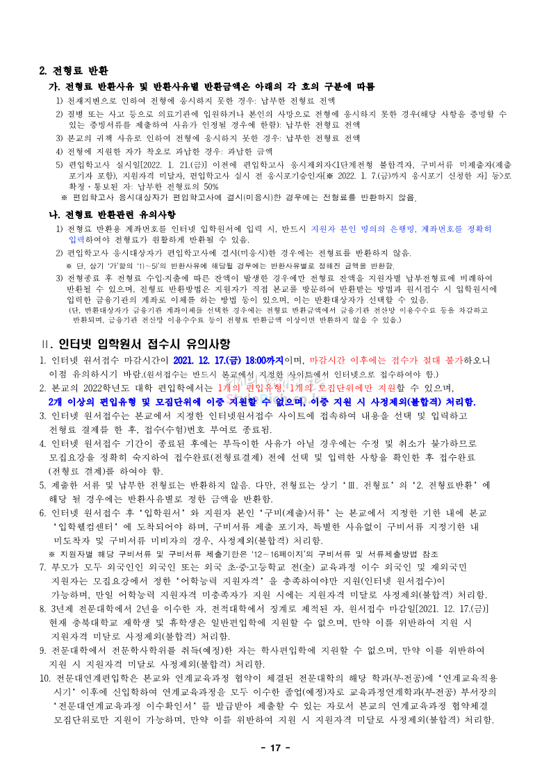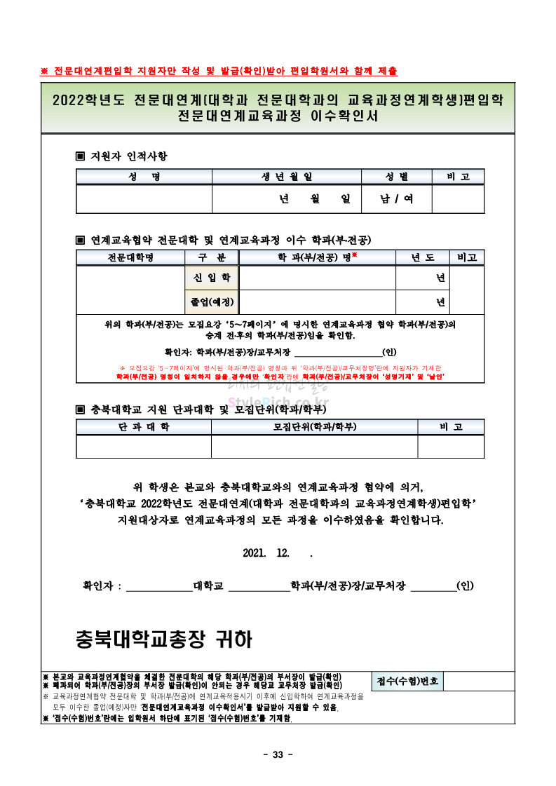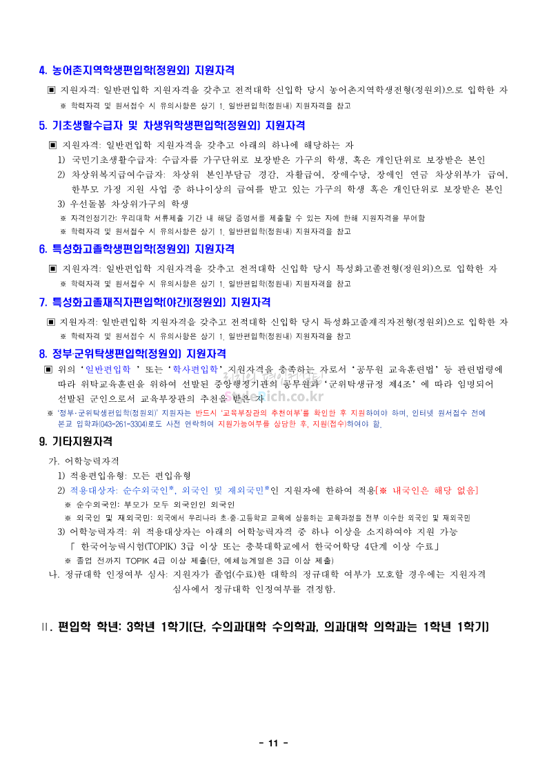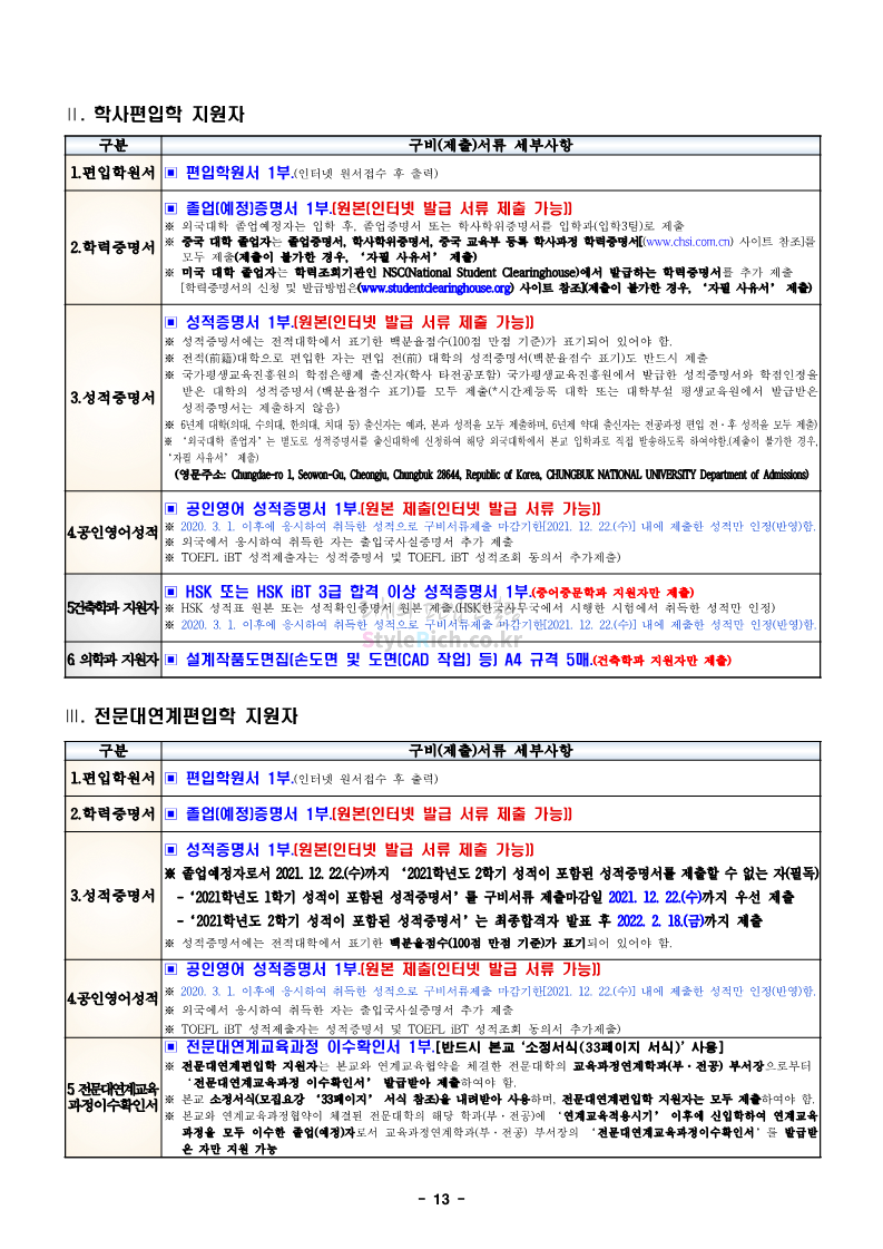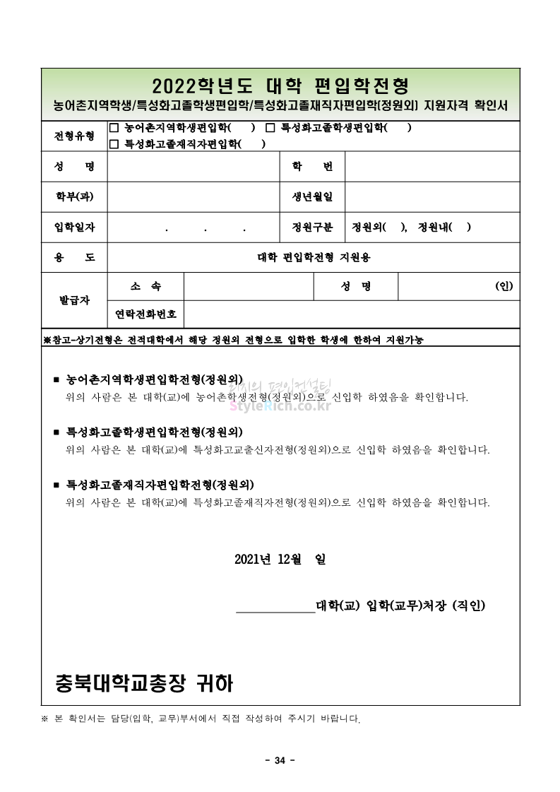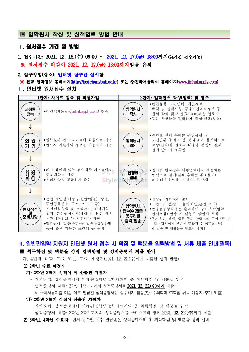 충북대 편입 2022학년도 모집요강 간편하게 보자! 2021.12.08 00:23 편입 모집요강/2022학년도 모집요강 2022학년도 충북대 편입 모집요강(2021.12.07 기준)을 간편하게 확인하세요. * 최종 모집요강 발표 이후에도 내용의 일부가 변경될 수 있으니 지원 전 반드시 충북대 입학처의 모집요강을 확인 바랍니다. 2022학년도 충북대 편입 모집요강 다운받기 <출처: 충북대> [충북대학교] 학교 안에 수영장, 스쿼시장, 헬스장까지 있다고? : CBNU 스포츠센터 체험기🏋🏻 공유하기 게시글 관리 리치의 편입컨설팅 저작자표시 비영리 변경금지 (새창열림) '편입 모집요강 > 2022학년도 모집요강' 카테고리의 다른 글 경북대 편입 2022학년도 모집요강 간편하게 보자! (0) 2021.12.08 서울시립대 편입 2022학년도 모집요강 간편하게 보자! (0) 2021.12.08 전남대 편입 2022학년도 모집요강 간편하게 보자! (0) 2021.12.07 안양대 편입 2022학년도 모집요강 간편하게 보자! (0) 2021.12.07 중앙대 편입 2022학년도 모집요강 간편하게 보자! (0) 2021.12.07 댓글 공유하기 다른 글 댓글 이 글 공유하기 구독하기 구독하기 카카오톡 카카오톡 라인 라인 트위터 트위터 Facebook Facebook 카카오스토리 카카오스토리 밴드 밴드 네이버 블로그 네이버 블로그 Pocket Pocket Evernote Evernote 다른 글 경북대 편입 2022학년도 모집요강 간편하게 보자! 경북대 편입 2022학년도 모집요강 간편하게 보자! 2021.12.08 서울시립대 편입 2022학년도 모집요강 간편하게 보자! 서울시립대 편입 2022학년도 모집요강 간편하게 보자! 2021.12.08 전남대 편입 2022학년도 모집요강 간편하게 보자! 전남대 편입 2022학년도 모집요강 간편하게 보자! 2021.12.07 안양대 편입 2022학년도 모집요강 간편하게 보자! 안양대 편입 2022학년도 모집요강 간편하게 보자! 2021.12.07 다른 글 더 둘러보기