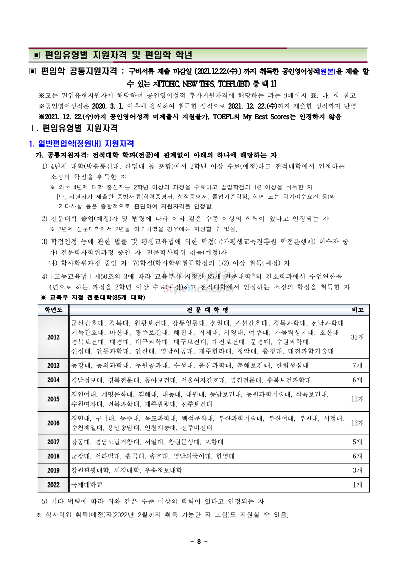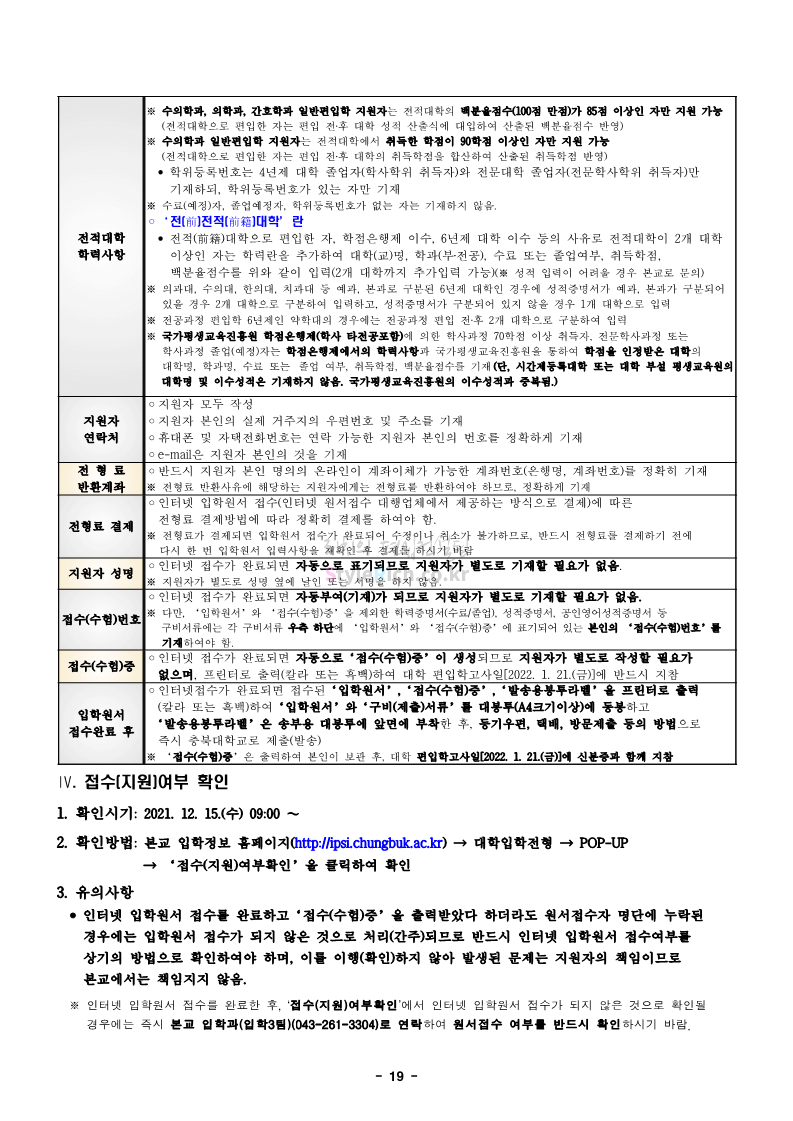 충북대 편입 2022학년도 모집요강 간편하게 보자! 2021.12.08 00:23 편입 모집요강/2022학년도 모집요강 2022학년도 충북대 편입 모집요강(2021.12.07 기준)을 간편하게 확인하세요. * 최종 모집요강 발표 이후에도 내용의 일부가 변경될 수 있으니 지원 전 반드시 충북대 입학처의 모집요강을 확인 바랍니다. 2022학년도 충북대 편입 모집요강 다운받기 <출처: 충북대> [충북대학교] 학교 안에 수영장, 스쿼시장, 헬스장까지 있다고? : CBNU 스포츠센터 체험기🏋🏻 공유하기 게시글 관리 리치의 편입컨설팅 저작자표시 비영리 변경금지 (새창열림) '편입 모집요강 > 2022학년도 모집요강' 카테고리의 다른 글 경북대 편입 2022학년도 모집요강 간편하게 보자! (0) 2021.12.08 서울시립대 편입 2022학년도 모집요강 간편하게 보자! (0) 2021.12.08 전남대 편입 2022학년도 모집요강 간편하게 보자! (0) 2021.12.07 안양대 편입 2022학년도 모집요강 간편하게 보자! (0) 2021.12.07 중앙대 편입 2022학년도 모집요강 간편하게 보자! (0) 2021.12.07 댓글 공유하기 다른 글 댓글 이 글 공유하기 구독하기 구독하기 카카오톡 카카오톡 라인 라인 트위터 트위터 Facebook Facebook 카카오스토리 카카오스토리 밴드 밴드 네이버 블로그 네이버 블로그 Pocket Pocket Evernote Evernote 다른 글 경북대 편입 2022학년도 모집요강 간편하게 보자! 경북대 편입 2022학년도 모집요강 간편하게 보자! 2021.12.08 서울시립대 편입 2022학년도 모집요강 간편하게 보자! 서울시립대 편입 2022학년도 모집요강 간편하게 보자! 2021.12.08 전남대 편입 2022학년도 모집요강 간편하게 보자! 전남대 편입 2022학년도 모집요강 간편하게 보자! 2021.12.07 안양대 편입 2022학년도 모집요강 간편하게 보자! 안양대 편입 2022학년도 모집요강 간편하게 보자! 2021.12.07 다른 글 더 둘러보기