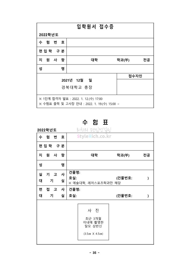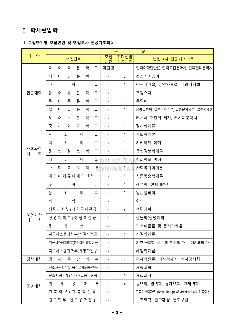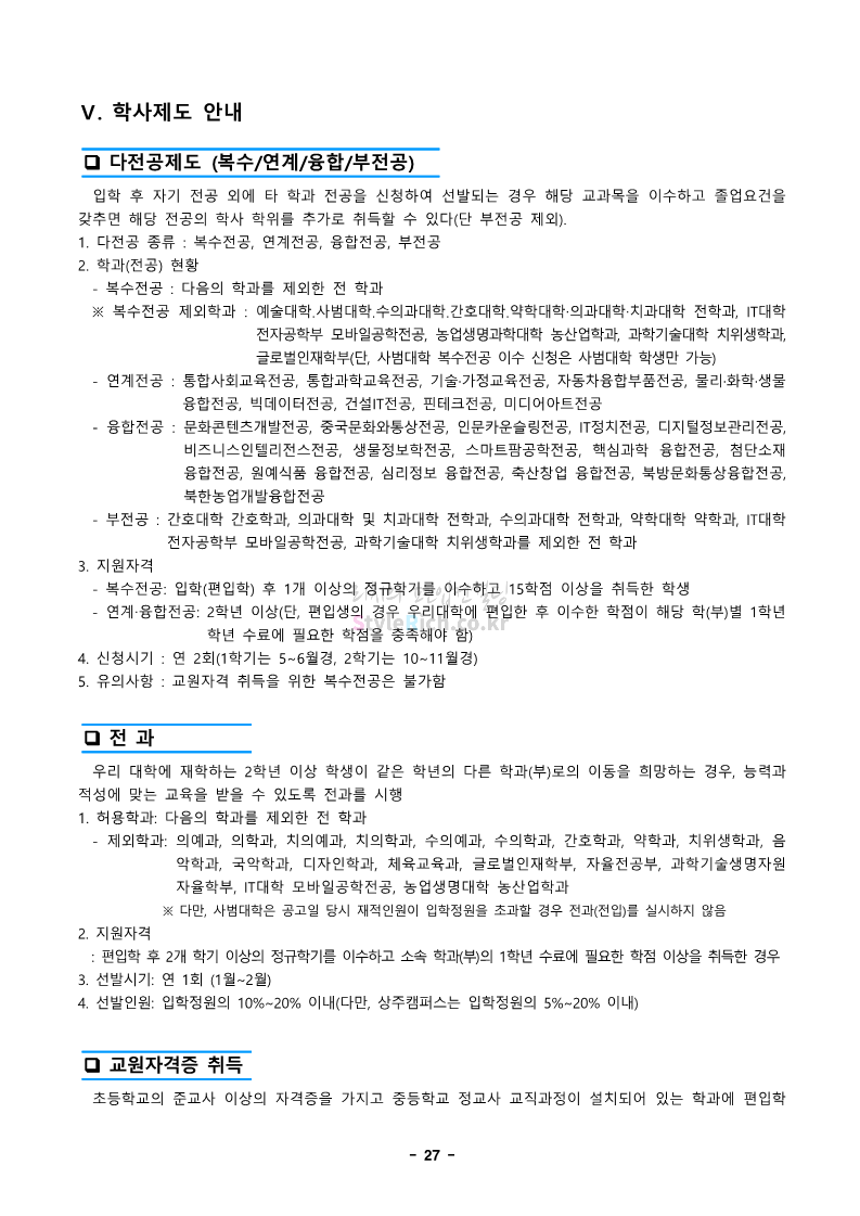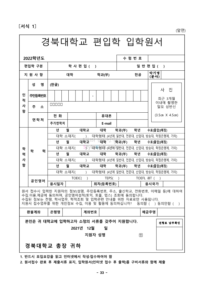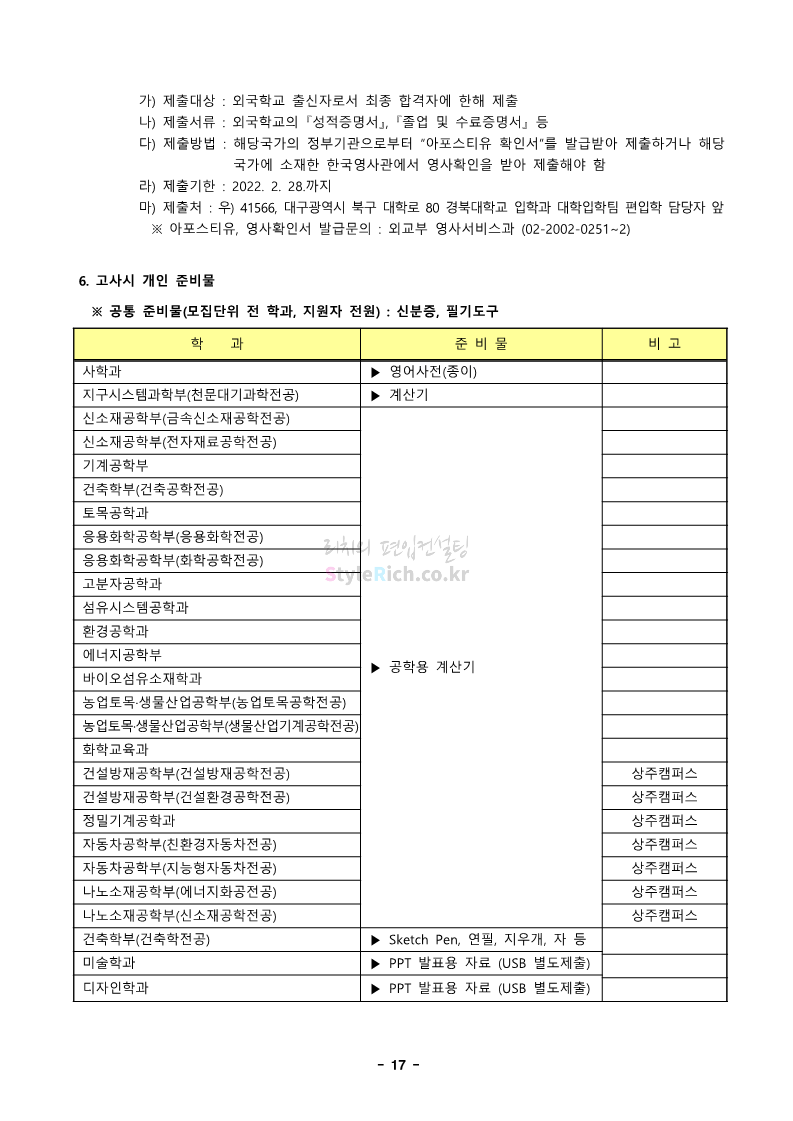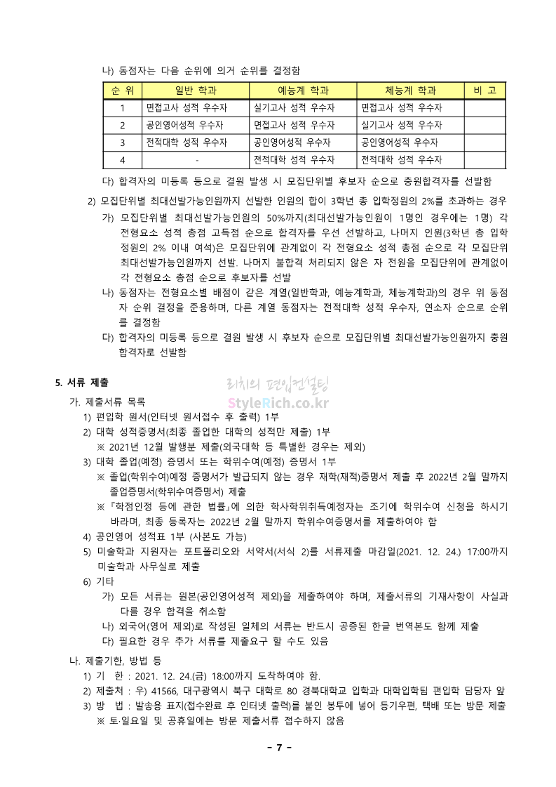 경북대 편입 2022학년도 모집요강 간편하게 보자! 2021.12.08 21:59 편입 모집요강/2022학년도 모집요강 2022학년도 경북대 편입 모집요강(2021.12.08 기준)을 간편하게 확인하세요. * 최종 모집요강 발표 이후에도 내용의 일부가 변경될 수 있으니 지원 전 반드시 경북대 입학처의 모집요강을 확인 바랍니다. 2022학년도 경북대 편입 모집요강 다운받기 <출처: 경북대> [학생리포터_쌍터뷰] ep. 외전 학생종합지원센터 | 화석이 되어가는 저... 앞으로 무엇을 해야 할까요,,🧐 공유하기 게시글 관리 리치의 편입컨설팅 저작자표시 비영리 변경금지 (새창열림) '편입 모집요강 > 2022학년도 모집요강' 카테고리의 다른 글 상명대 편입 2022학년도 모집요강 간편하게 보자! (0) 2021.12.10 성균관대 편입 2022학년도 모집요강 간편하게 보자! (0) 2021.12.09 서울시립대 편입 2022학년도 모집요강 간편하게 보자! (0) 2021.12.08 충북대 편입 2022학년도 모집요강 간편하게 보자! (0) 2021.12.08 전남대 편입 2022학년도 모집요강 간편하게 보자! (0) 2021.12.07 댓글 공유하기 다른 글 댓글 이 글 공유하기 구독하기 구독하기 카카오톡 카카오톡 라인 라인 트위터 트위터 Facebook Facebook 카카오스토리 카카오스토리 밴드 밴드 네이버 블로그 네이버 블로그 Pocket Pocket Evernote Evernote 다른 글 상명대 편입 2022학년도 모집요강 간편하게 보자! 상명대 편입 2022학년도 모집요강 간편하게 보자! 2021.12.10 성균관대 편입 2022학년도 모집요강 간편하게 보자! 성균관대 편입 2022학년도 모집요강 간편하게 보자! 2021.12.09 서울시립대 편입 2022학년도 모집요강 간편하게 보자! 서울시립대 편입 2022학년도 모집요강 간편하게 보자! 2021.12.08 충북대 편입 2022학년도 모집요강 간편하게 보자! 충북대 편입 2022학년도 모집요강 간편하게 보자! 2021.12.08 다른 글 더 둘러보기