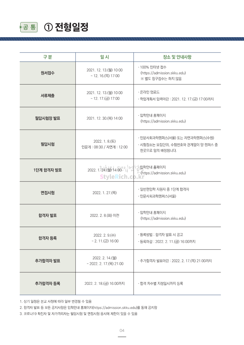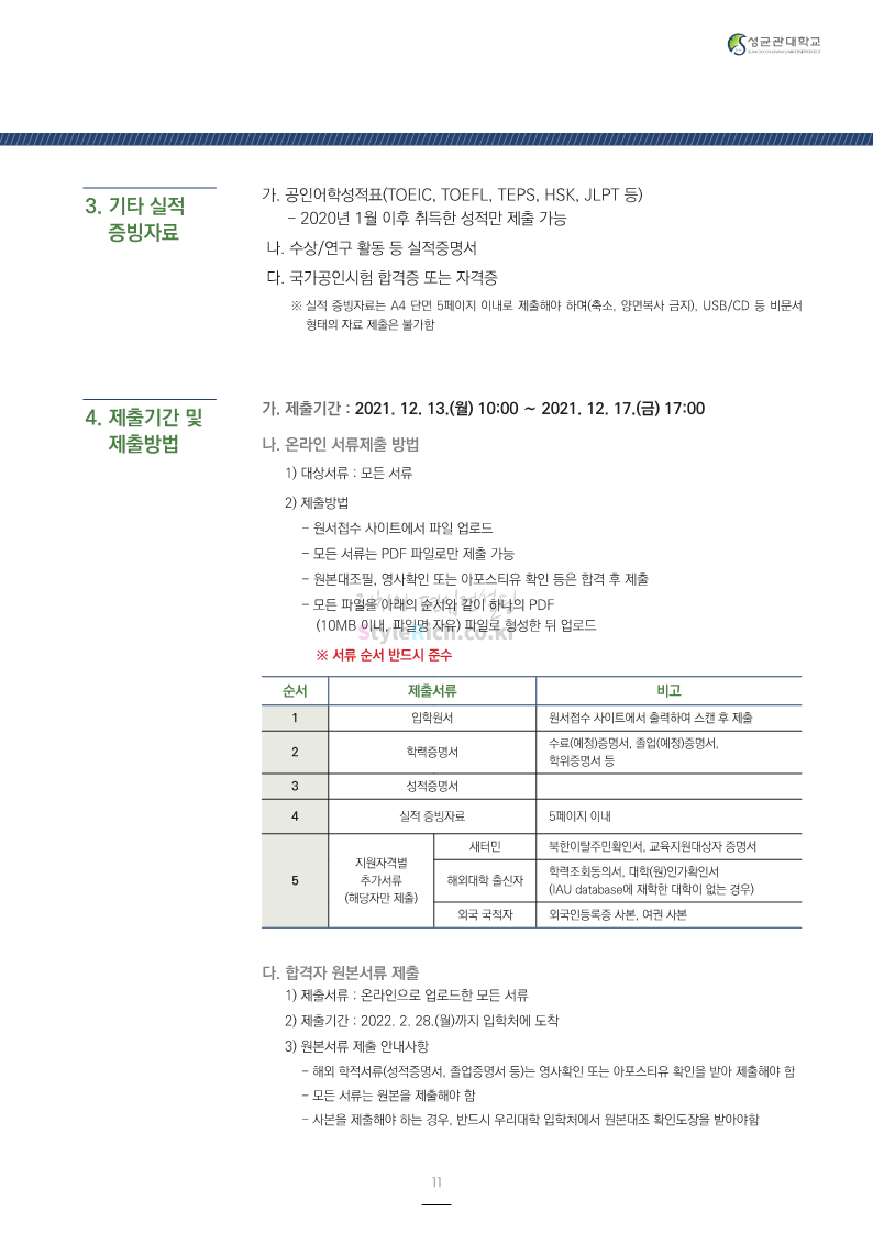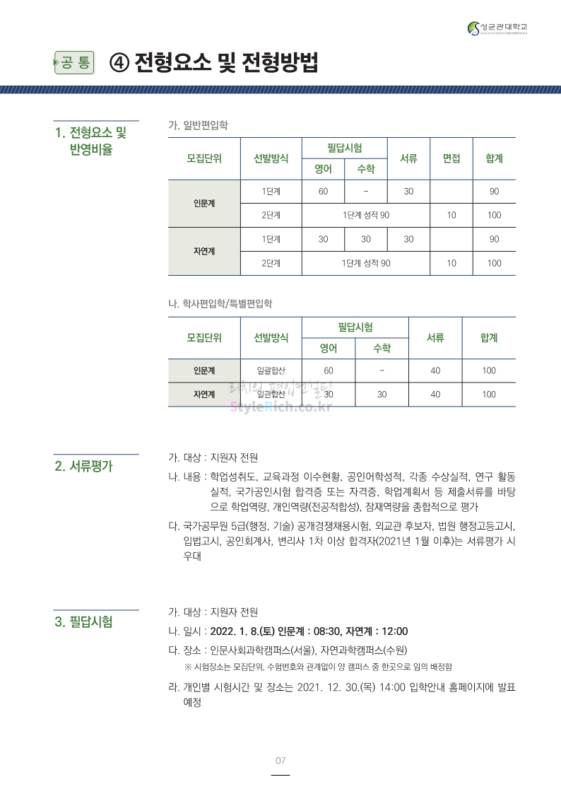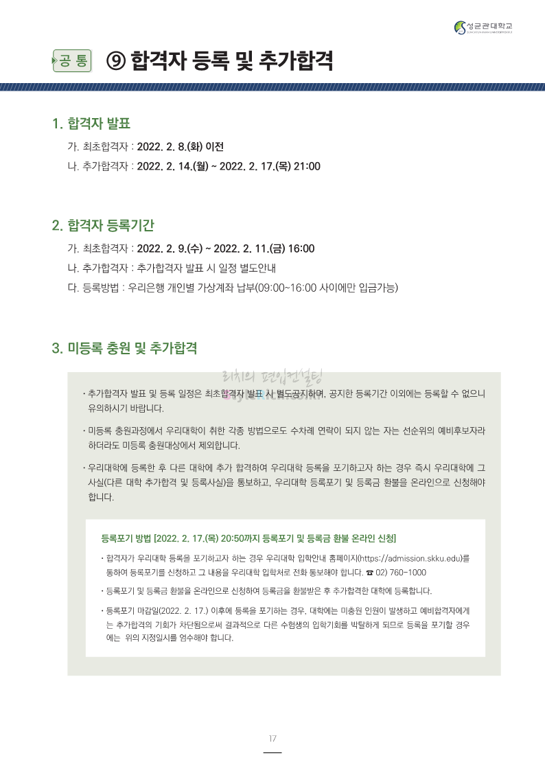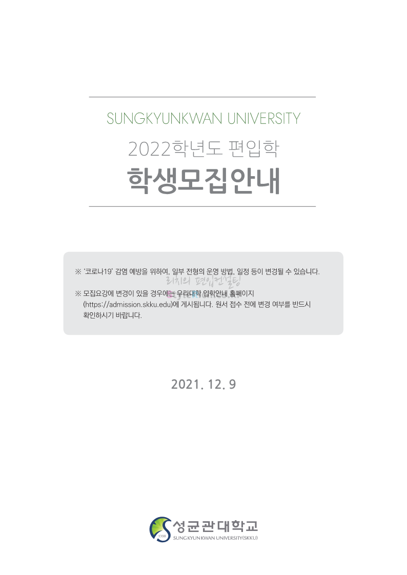 성균관대 편입 2022학년도 모집요강 간편하게 보자! 2021.12.09 22:05 편입 모집요강/2022학년도 모집요강 2022학년도 성균관대 편입 모집요강(2021.12.09 기준)을 간편하게 확인하세요. * 최종 모집요강 발표 이후에도 내용의 일부가 변경될 수 있으니 지원 전 반드시 성균관대 입학처의 모집요강을 확인 바랍니다. 2022학년도 성균관대 편입 모집요강 다운받기 <출처: 성균관대> [성균관대 랜선 캠퍼스 탐방] 알리미와 함께 떠나요~🏫🙆 💚 공유하기 게시글 관리 리치의 편입컨설팅 저작자표시 비영리 변경금지 (새창열림) '편입 모집요강 > 2022학년도 모집요강' 카테고리의 다른 글 상명대(천안) 편입 2022학년도 모집요강 간편하게 보자! (0) 2021.12.10 상명대 편입 2022학년도 모집요강 간편하게 보자! (0) 2021.12.10 경북대 편입 2022학년도 모집요강 간편하게 보자! (0) 2021.12.08 서울시립대 편입 2022학년도 모집요강 간편하게 보자! (0) 2021.12.08 충북대 편입 2022학년도 모집요강 간편하게 보자! (0) 2021.12.08 댓글 공유하기 다른 글 댓글 이 글 공유하기 구독하기 구독하기 카카오톡 카카오톡 라인 라인 트위터 트위터 Facebook Facebook 카카오스토리 카카오스토리 밴드 밴드 네이버 블로그 네이버 블로그 Pocket Pocket Evernote Evernote 다른 글 상명대(천안) 편입 2022학년도 모집요강 간편하게 보자! 상명대(천안) 편입 2022학년도 모집요강 간편하게 보자! 2021.12.10 상명대 편입 2022학년도 모집요강 간편하게 보자! 상명대 편입 2022학년도 모집요강 간편하게 보자! 2021.12.10 경북대 편입 2022학년도 모집요강 간편하게 보자! 경북대 편입 2022학년도 모집요강 간편하게 보자! 2021.12.08 서울시립대 편입 2022학년도 모집요강 간편하게 보자! 서울시립대 편입 2022학년도 모집요강 간편하게 보자! 2021.12.08 다른 글 더 둘러보기