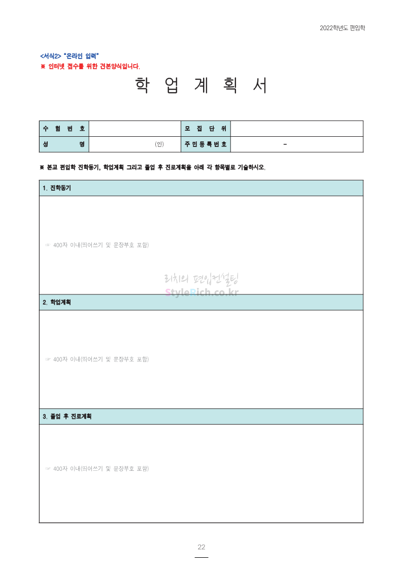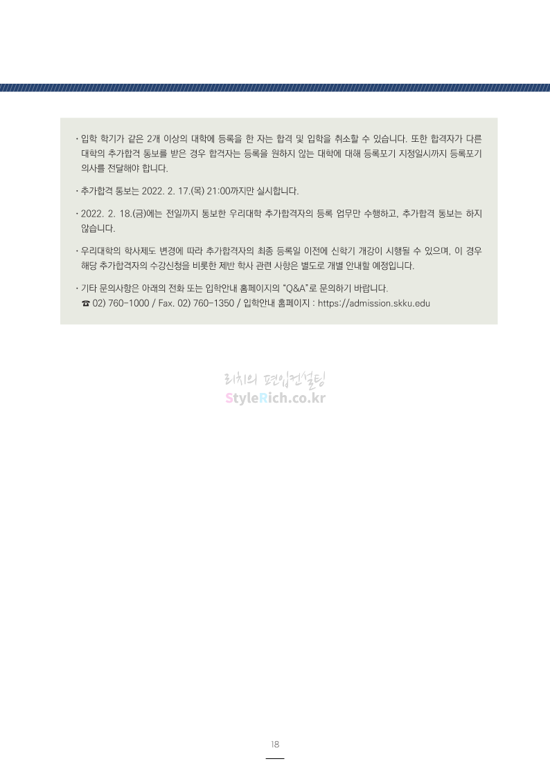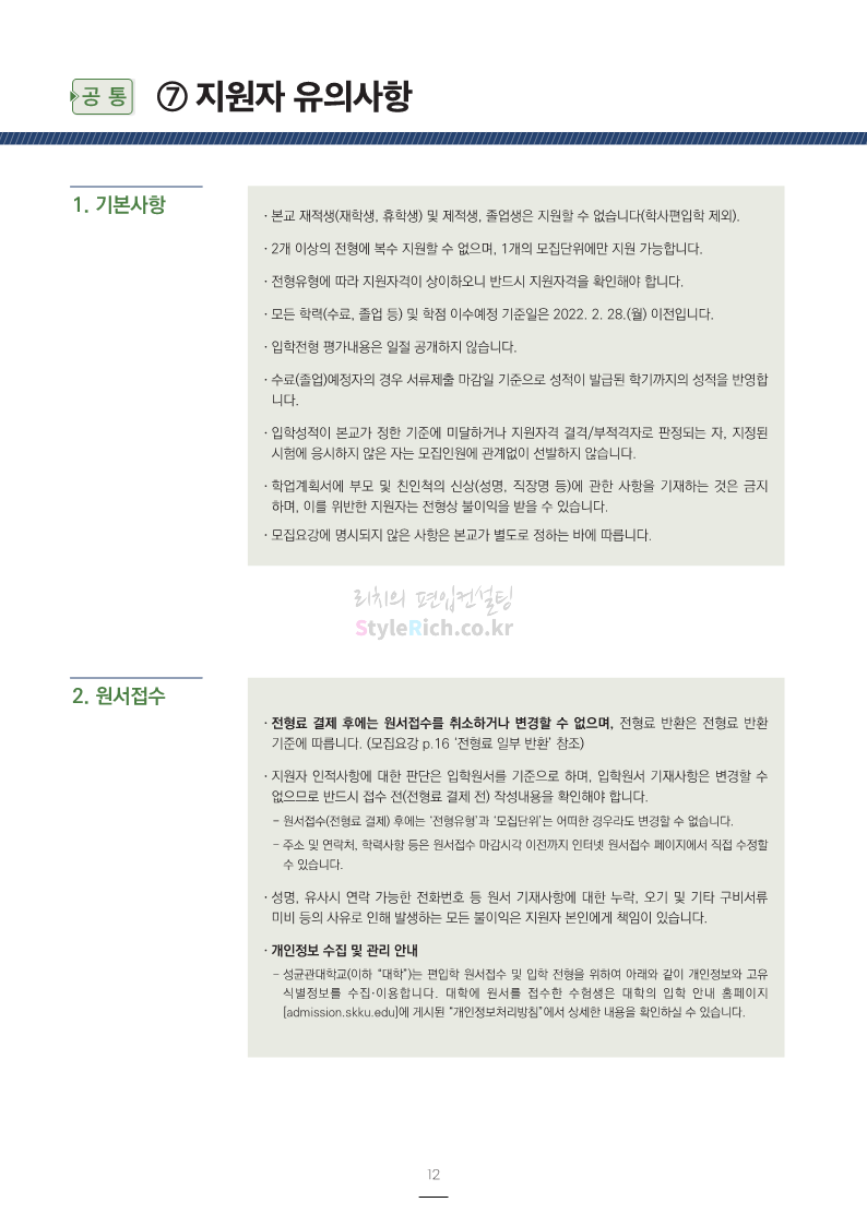성균관대 편입 2022학년도 모집요강 간편하게 보자! 2021.12.09 22:05 편입 모집요강/2022학년도 모집요강 2022학년도 성균관대 편입 모집요강(2021.12.09 기준)을 간편하게 확인하세요. * 최종 모집요강 발표 이후에도 내용의 일부가 변경될 수 있으니 지원 전 반드시 성균관대 입학처의 모집요강을 확인 바랍니다. 2022학년도 성균관대 편입 모집요강 다운받기 <출처: 성균관대> [성균관대 랜선 캠퍼스 탐방] 알리미와 함께 떠나요~🏫🙆 💚 공유하기 게시글 관리 리치의 편입컨설팅 저작자표시 비영리 변경금지 (새창열림) '편입 모집요강 > 2022학년도 모집요강' 카테고리의 다른 글 상명대(천안) 편입 2022학년도 모집요강 간편하게 보자! (0) 2021.12.10 상명대 편입 2022학년도 모집요강 간편하게 보자! (0) 2021.12.10 경북대 편입 2022학년도 모집요강 간편하게 보자! (0) 2021.12.08 서울시립대 편입 2022학년도 모집요강 간편하게 보자! (0) 2021.12.08 충북대 편입 2022학년도 모집요강 간편하게 보자! (0) 2021.12.08 댓글 공유하기 다른 글 댓글 이 글 공유하기 구독하기 구독하기 카카오톡 카카오톡 라인 라인 트위터 트위터 Facebook Facebook 카카오스토리 카카오스토리 밴드 밴드 네이버 블로그 네이버 블로그 Pocket Pocket Evernote Evernote 다른 글 상명대(천안) 편입 2022학년도 모집요강 간편하게 보자! 상명대(천안) 편입 2022학년도 모집요강 간편하게 보자! 2021.12.10 상명대 편입 2022학년도 모집요강 간편하게 보자! 상명대 편입 2022학년도 모집요강 간편하게 보자! 2021.12.10 경북대 편입 2022학년도 모집요강 간편하게 보자! 경북대 편입 2022학년도 모집요강 간편하게 보자! 2021.12.08 서울시립대 편입 2022학년도 모집요강 간편하게 보자! 서울시립대 편입 2022학년도 모집요강 간편하게 보자! 2021.12.08 다른 글 더 둘러보기