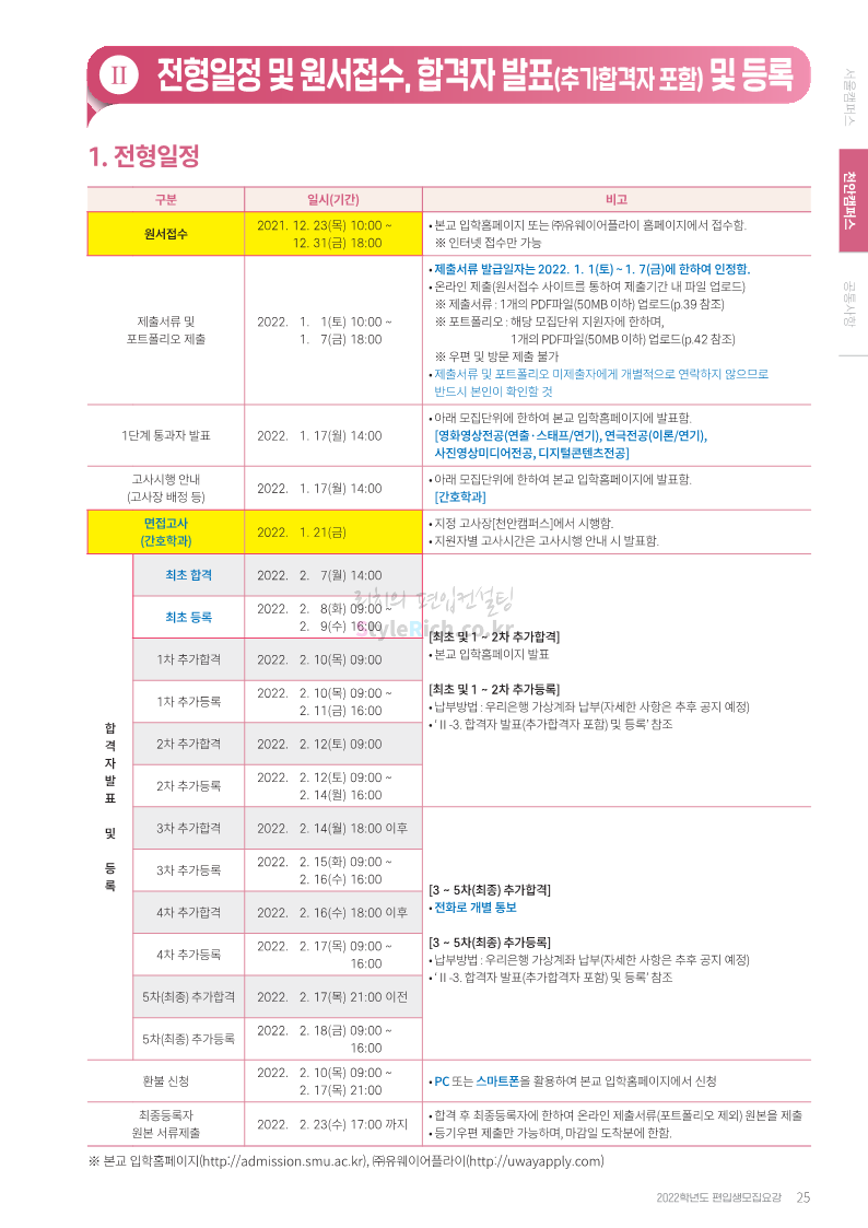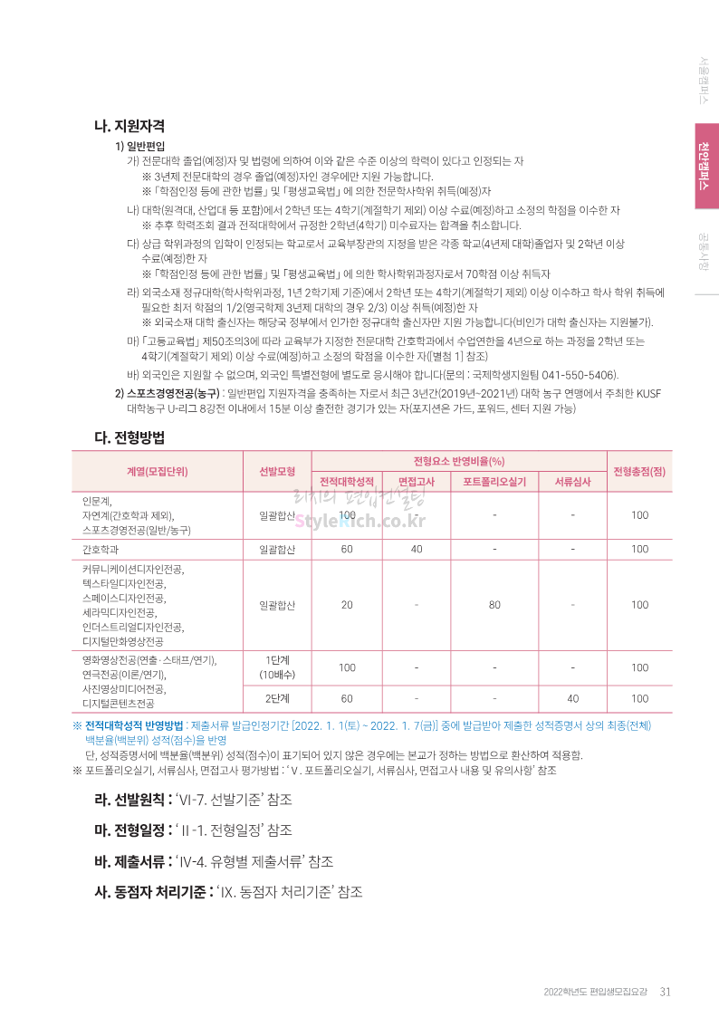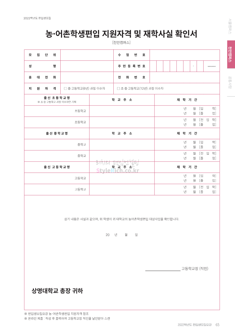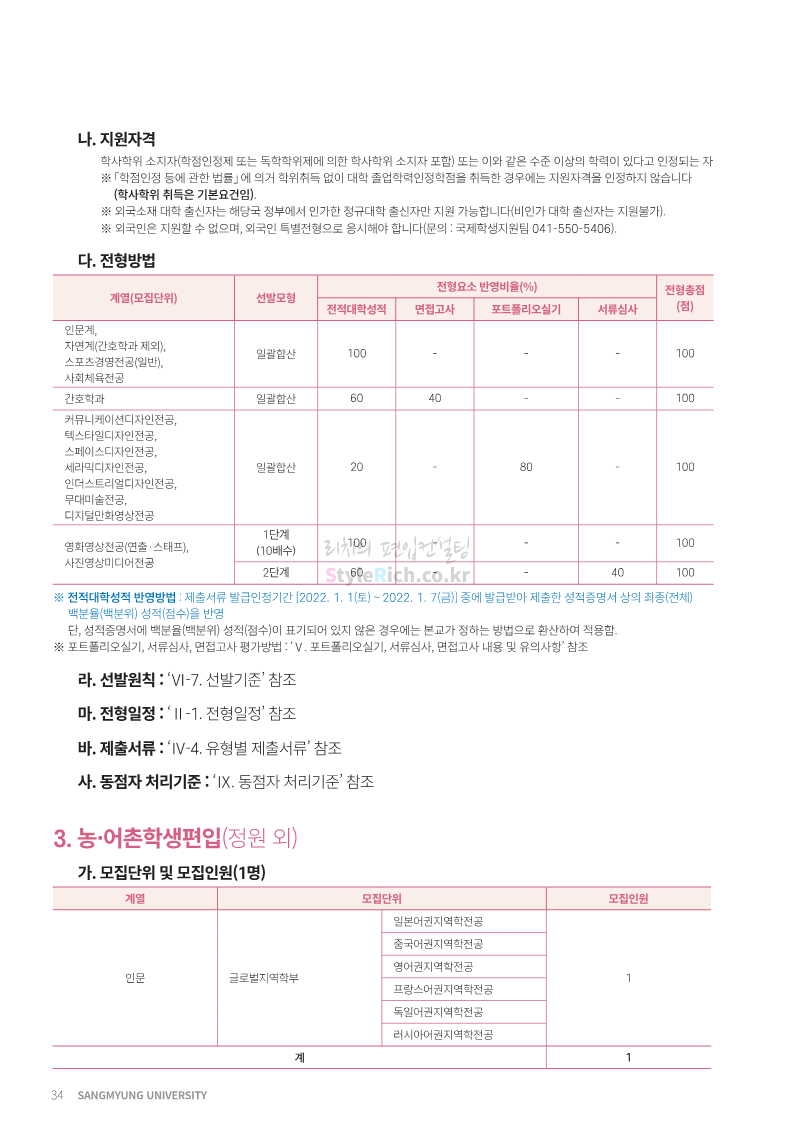 상명대(천안) 편입 2022학년도 모집요강 간편하게 보자! 2021.12.10 20:27 편입 모집요강/2022학년도 모집요강 2022학년도 상명대(천안) 편입 모집요강(2021.12.10 기준)을 간편하게 확인하세요. * 최종 모집요강 발표 이후에도 내용의 일부가 변경될 수 있으니 지원 전 반드시 상명대(천안) 입학처의 모집요강을 확인 바랍니다. 2022학년도 상명대(천안) 편입 모집요강 다운받기 <출처: 상명대> 🎶상명대학교 천안캠퍼스를 소개합니다🎶 공유하기 게시글 관리 리치의 편입컨설팅 저작자표시 비영리 변경금지 (새창열림) '편입 모집요강 > 2022학년도 모집요강' 카테고리의 다른 글 한국외대 편입 2022학년도 모집요강 간편하게 보자! (0) 2021.12.10 서울여대 편입 2022학년도 모집요강 간편하게 보자! (0) 2021.12.10 상명대 편입 2022학년도 모집요강 간편하게 보자! (0) 2021.12.10 성균관대 편입 2022학년도 모집요강 간편하게 보자! (0) 2021.12.09 경북대 편입 2022학년도 모집요강 간편하게 보자! (0) 2021.12.08 댓글 공유하기 다른 글 댓글 이 글 공유하기 구독하기 구독하기 카카오톡 카카오톡 라인 라인 트위터 트위터 Facebook Facebook 카카오스토리 카카오스토리 밴드 밴드 네이버 블로그 네이버 블로그 Pocket Pocket Evernote Evernote 다른 글 한국외대 편입 2022학년도 모집요강 간편하게 보자! 한국외대 편입 2022학년도 모집요강 간편하게 보자! 2021.12.10 서울여대 편입 2022학년도 모집요강 간편하게 보자! 서울여대 편입 2022학년도 모집요강 간편하게 보자! 2021.12.10 상명대 편입 2022학년도 모집요강 간편하게 보자! 상명대 편입 2022학년도 모집요강 간편하게 보자! 2021.12.10 성균관대 편입 2022학년도 모집요강 간편하게 보자! 성균관대 편입 2022학년도 모집요강 간편하게 보자! 2021.12.09 다른 글 더 둘러보기