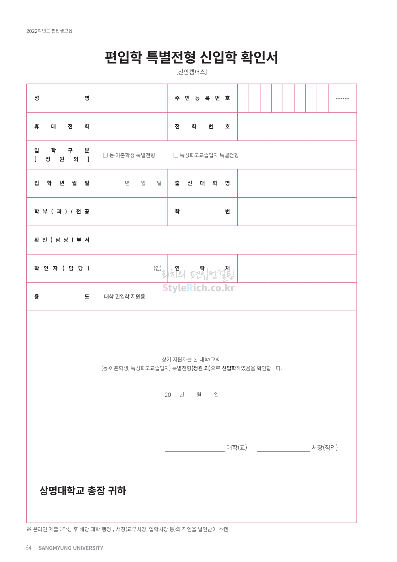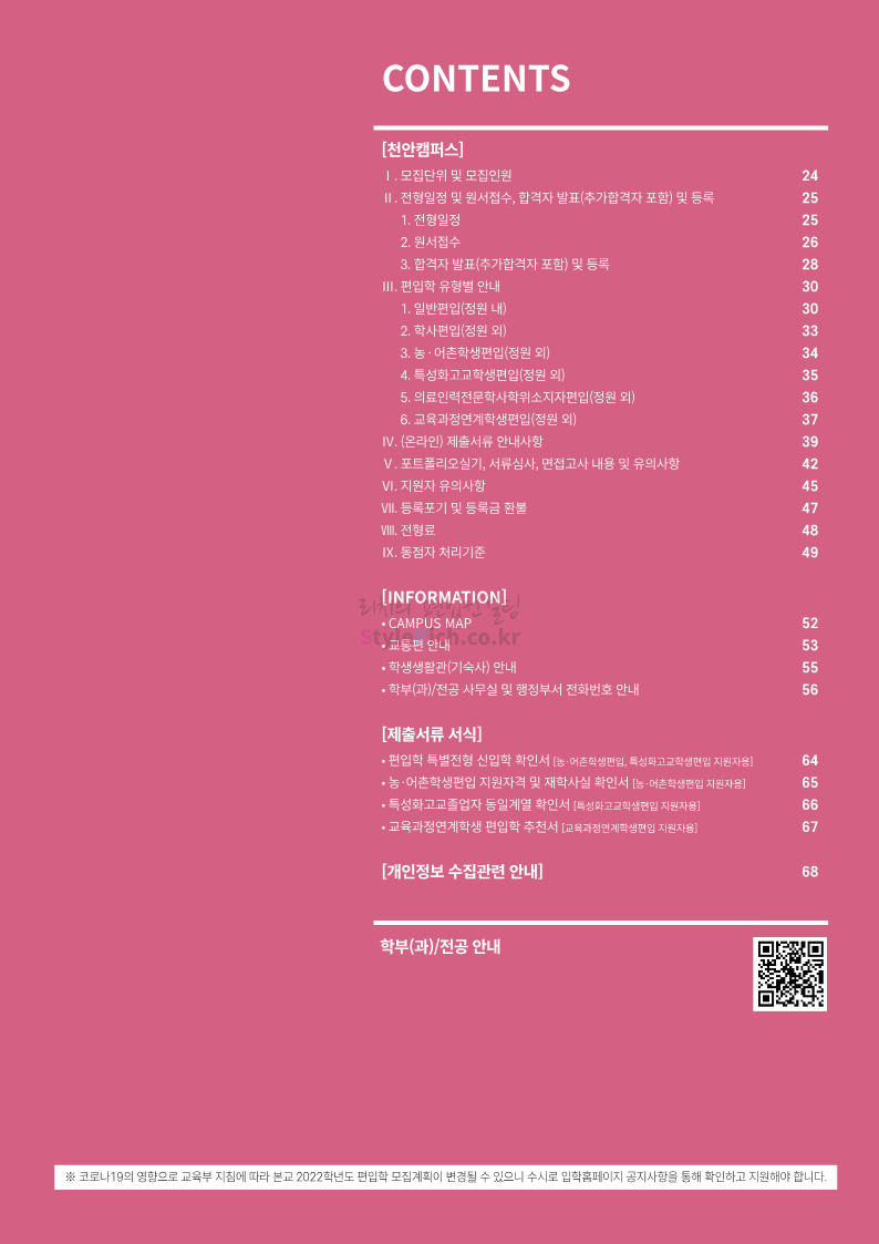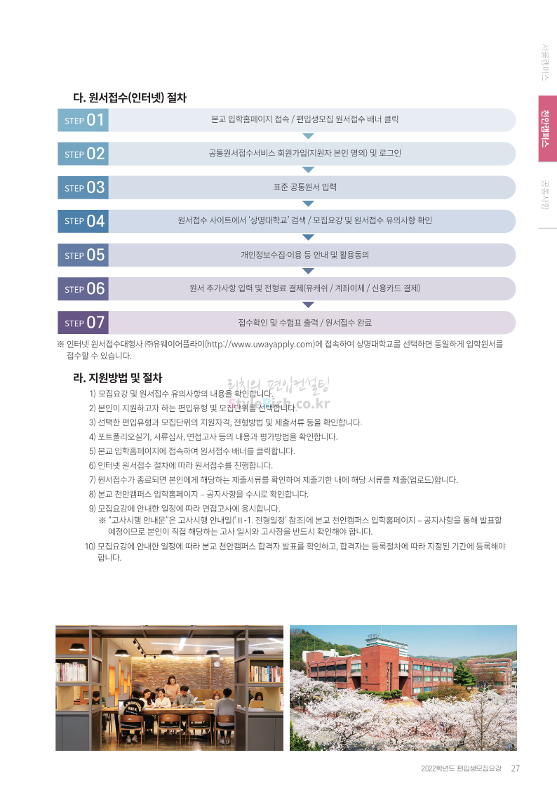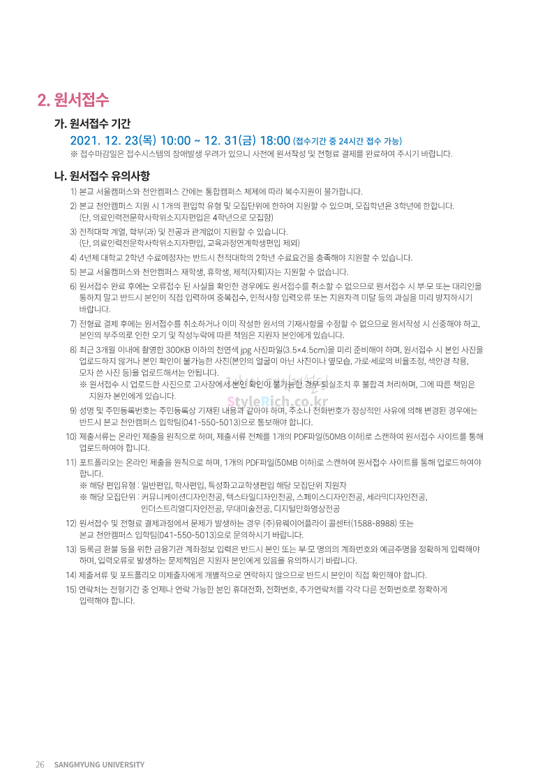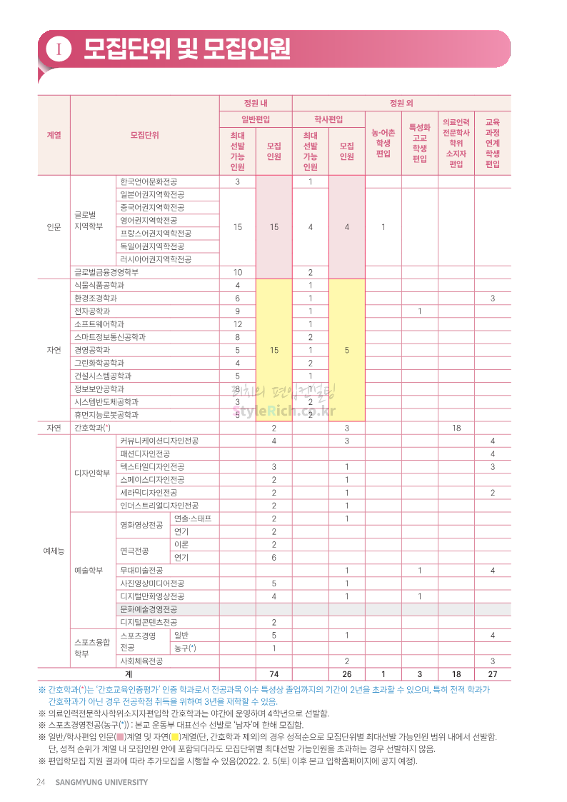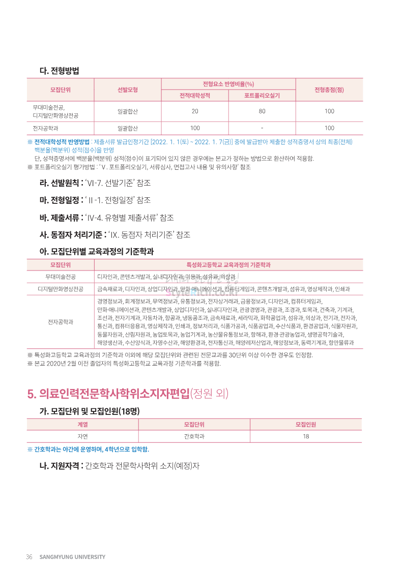 상명대(천안) 편입 2022학년도 모집요강 간편하게 보자! 2021.12.10 20:27 편입 모집요강/2022학년도 모집요강 2022학년도 상명대(천안) 편입 모집요강(2021.12.10 기준)을 간편하게 확인하세요. * 최종 모집요강 발표 이후에도 내용의 일부가 변경될 수 있으니 지원 전 반드시 상명대(천안) 입학처의 모집요강을 확인 바랍니다. 2022학년도 상명대(천안) 편입 모집요강 다운받기 <출처: 상명대> 🎶상명대학교 천안캠퍼스를 소개합니다🎶 공유하기 게시글 관리 리치의 편입컨설팅 저작자표시 비영리 변경금지 (새창열림) '편입 모집요강 > 2022학년도 모집요강' 카테고리의 다른 글 한국외대 편입 2022학년도 모집요강 간편하게 보자! (0) 2021.12.10 서울여대 편입 2022학년도 모집요강 간편하게 보자! (0) 2021.12.10 상명대 편입 2022학년도 모집요강 간편하게 보자! (0) 2021.12.10 성균관대 편입 2022학년도 모집요강 간편하게 보자! (0) 2021.12.09 경북대 편입 2022학년도 모집요강 간편하게 보자! (0) 2021.12.08 댓글 공유하기 다른 글 댓글 이 글 공유하기 구독하기 구독하기 카카오톡 카카오톡 라인 라인 트위터 트위터 Facebook Facebook 카카오스토리 카카오스토리 밴드 밴드 네이버 블로그 네이버 블로그 Pocket Pocket Evernote Evernote 다른 글 한국외대 편입 2022학년도 모집요강 간편하게 보자! 한국외대 편입 2022학년도 모집요강 간편하게 보자! 2021.12.10 서울여대 편입 2022학년도 모집요강 간편하게 보자! 서울여대 편입 2022학년도 모집요강 간편하게 보자! 2021.12.10 상명대 편입 2022학년도 모집요강 간편하게 보자! 상명대 편입 2022학년도 모집요강 간편하게 보자! 2021.12.10 성균관대 편입 2022학년도 모집요강 간편하게 보자! 성균관대 편입 2022학년도 모집요강 간편하게 보자! 2021.12.09 다른 글 더 둘러보기