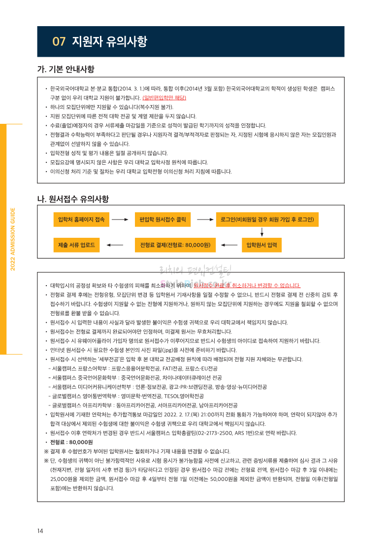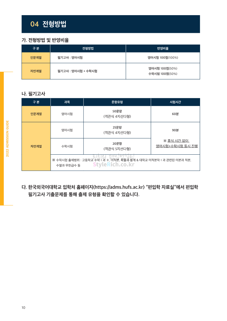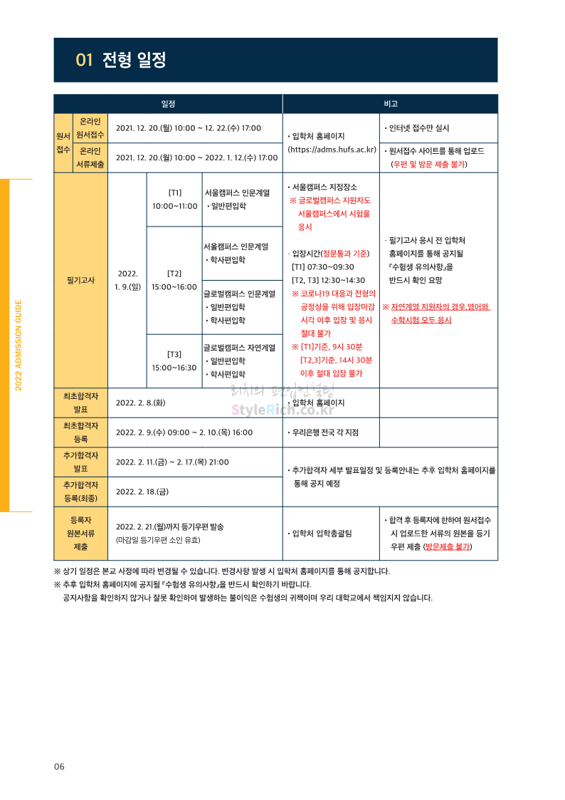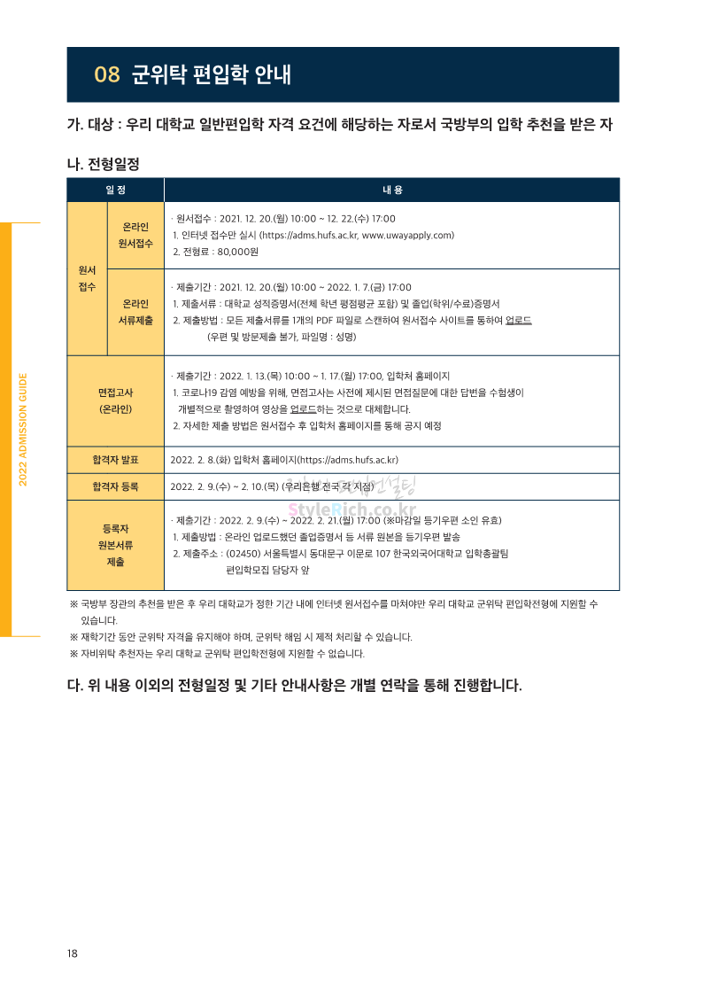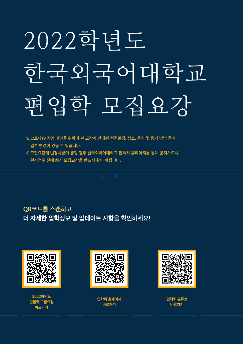 한국외대 편입 2022학년도 모집요강 간편하게 보자! 2021.12.10 21:48 편입 모집요강/2022학년도 모집요강 2022학년도 한국외대 편입 모집요강(2021.12.10 기준)을 간편하게 확인하세요. * 최종 모집요강 발표 이후에도 내용의 일부가 변경될 수 잇으니 지원 전 반드시 한국외대 입학처의 모집요강을 확인 바랍니다. 2022학년도 한국외대 편입 모집요강 다운받기 <출처: 한국외대> [VLOG] 한국외대 대면수업 브이로그🏛 공유하기 게시글 관리 리치의 편입컨설팅 저작자표시 비영리 변경금지 (새창열림) '편입 모집요강 > 2022학년도 모집요강' 카테고리의 다른 글 강원대 편입 2022학년도 모집요강 간편하게 보자! (0) 2021.12.11 한양대 편입 2022학년도 모집요강 간편하게 보자! (0) 2021.12.10 서울여대 편입 2022학년도 모집요강 간편하게 보자! (0) 2021.12.10 상명대(천안) 편입 2022학년도 모집요강 간편하게 보자! (0) 2021.12.10 상명대 편입 2022학년도 모집요강 간편하게 보자! (0) 2021.12.10 댓글 공유하기 다른 글 댓글 이 글 공유하기 구독하기 구독하기 카카오톡 카카오톡 라인 라인 트위터 트위터 Facebook Facebook 카카오스토리 카카오스토리 밴드 밴드 네이버 블로그 네이버 블로그 Pocket Pocket Evernote Evernote 다른 글 강원대 편입 2022학년도 모집요강 간편하게 보자! 강원대 편입 2022학년도 모집요강 간편하게 보자! 2021.12.11 한양대 편입 2022학년도 모집요강 간편하게 보자! 한양대 편입 2022학년도 모집요강 간편하게 보자! 2021.12.10 서울여대 편입 2022학년도 모집요강 간편하게 보자! 서울여대 편입 2022학년도 모집요강 간편하게 보자! 2021.12.10 상명대(천안) 편입 2022학년도 모집요강 간편하게 보자! 상명대(천안) 편입 2022학년도 모집요강 간편하게 보자! 2021.12.10 다른 글 더 둘러보기