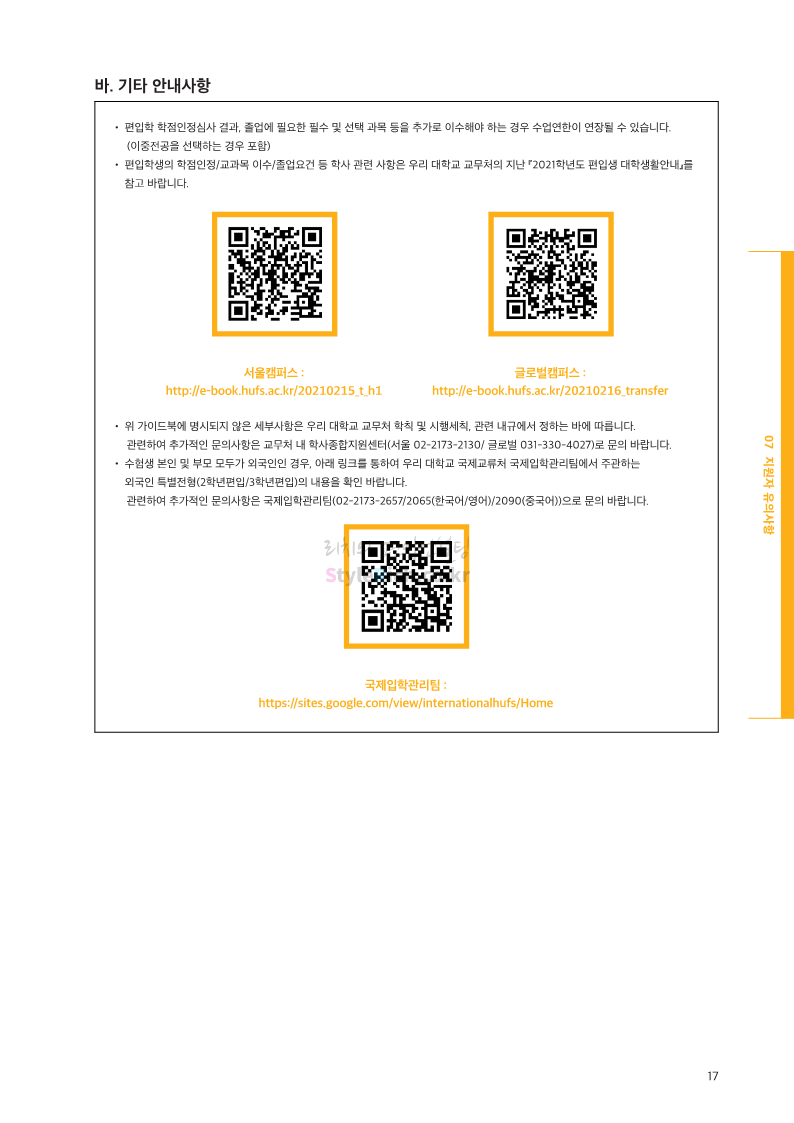 한국외대 편입 2022학년도 모집요강 간편하게 보자! 2021.12.10 21:48 편입 모집요강/2022학년도 모집요강 2022학년도 한국외대 편입 모집요강(2021.12.10 기준)을 간편하게 확인하세요. * 최종 모집요강 발표 이후에도 내용의 일부가 변경될 수 잇으니 지원 전 반드시 한국외대 입학처의 모집요강을 확인 바랍니다. 2022학년도 한국외대 편입 모집요강 다운받기 <출처: 한국외대> [VLOG] 한국외대 대면수업 브이로그🏛 공유하기 게시글 관리 리치의 편입컨설팅 저작자표시 비영리 변경금지 (새창열림) '편입 모집요강 > 2022학년도 모집요강' 카테고리의 다른 글 강원대 편입 2022학년도 모집요강 간편하게 보자! (0) 2021.12.11 한양대 편입 2022학년도 모집요강 간편하게 보자! (0) 2021.12.10 서울여대 편입 2022학년도 모집요강 간편하게 보자! (0) 2021.12.10 상명대(천안) 편입 2022학년도 모집요강 간편하게 보자! (0) 2021.12.10 상명대 편입 2022학년도 모집요강 간편하게 보자! (0) 2021.12.10 댓글 공유하기 다른 글 댓글 이 글 공유하기 구독하기 구독하기 카카오톡 카카오톡 라인 라인 트위터 트위터 Facebook Facebook 카카오스토리 카카오스토리 밴드 밴드 네이버 블로그 네이버 블로그 Pocket Pocket Evernote Evernote 다른 글 강원대 편입 2022학년도 모집요강 간편하게 보자! 강원대 편입 2022학년도 모집요강 간편하게 보자! 2021.12.11 한양대 편입 2022학년도 모집요강 간편하게 보자! 한양대 편입 2022학년도 모집요강 간편하게 보자! 2021.12.10 서울여대 편입 2022학년도 모집요강 간편하게 보자! 서울여대 편입 2022학년도 모집요강 간편하게 보자! 2021.12.10 상명대(천안) 편입 2022학년도 모집요강 간편하게 보자! 상명대(천안) 편입 2022학년도 모집요강 간편하게 보자! 2021.12.10 다른 글 더 둘러보기