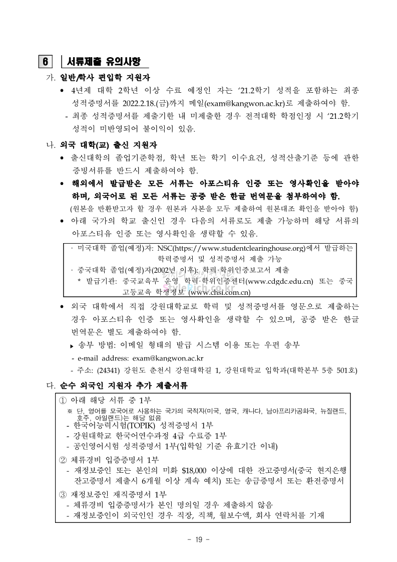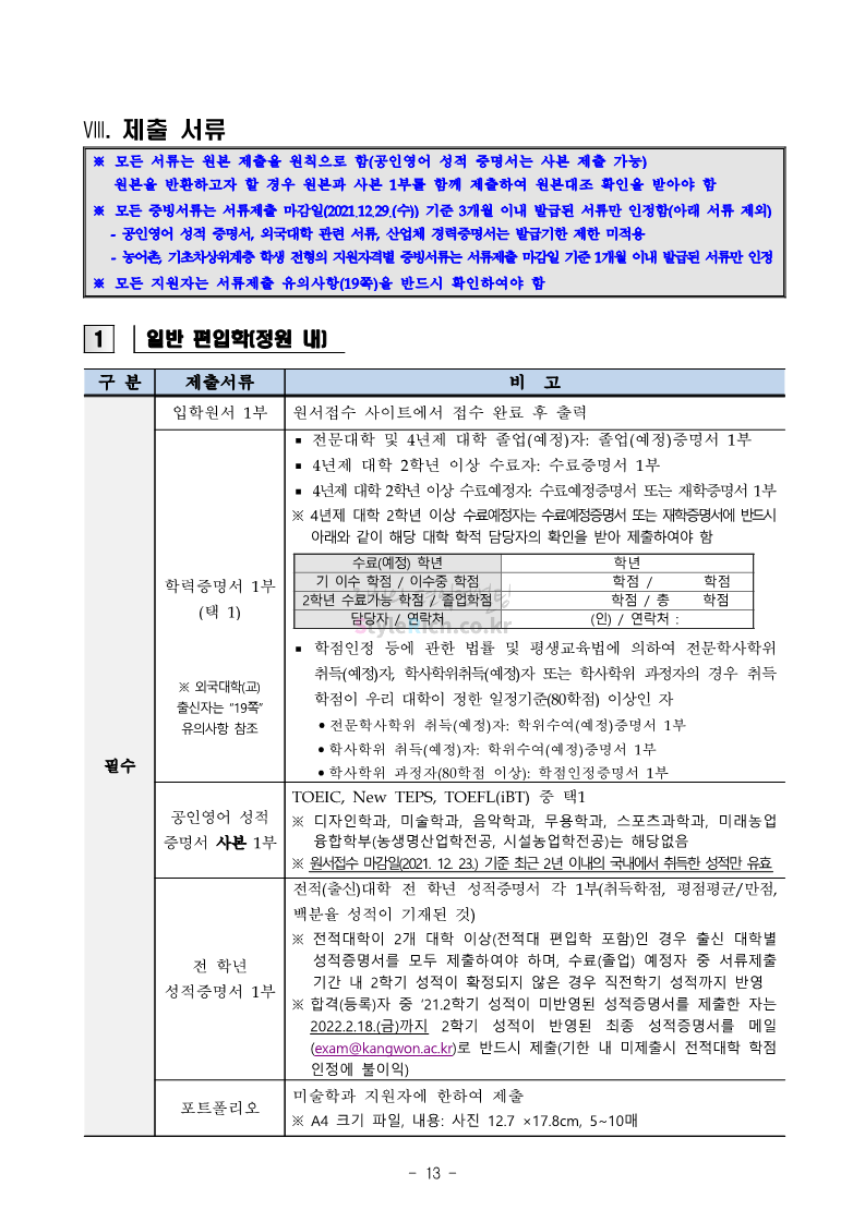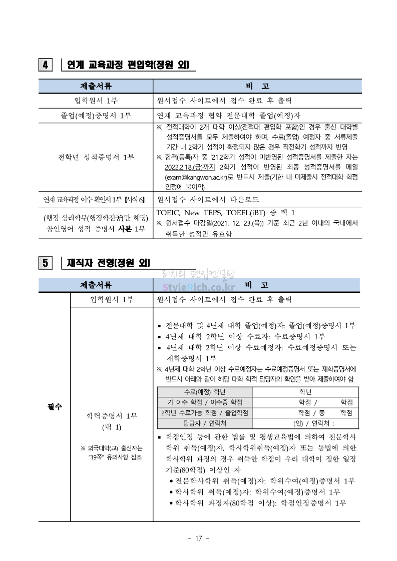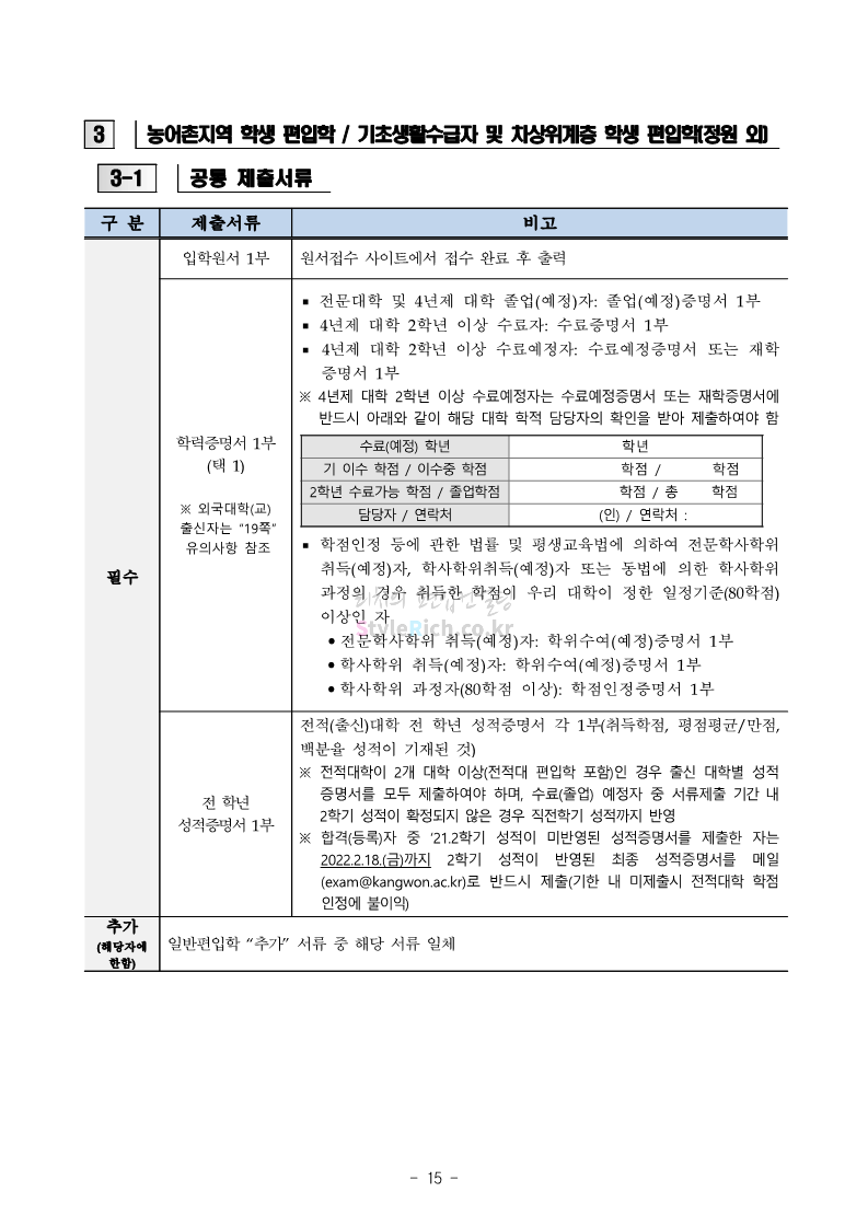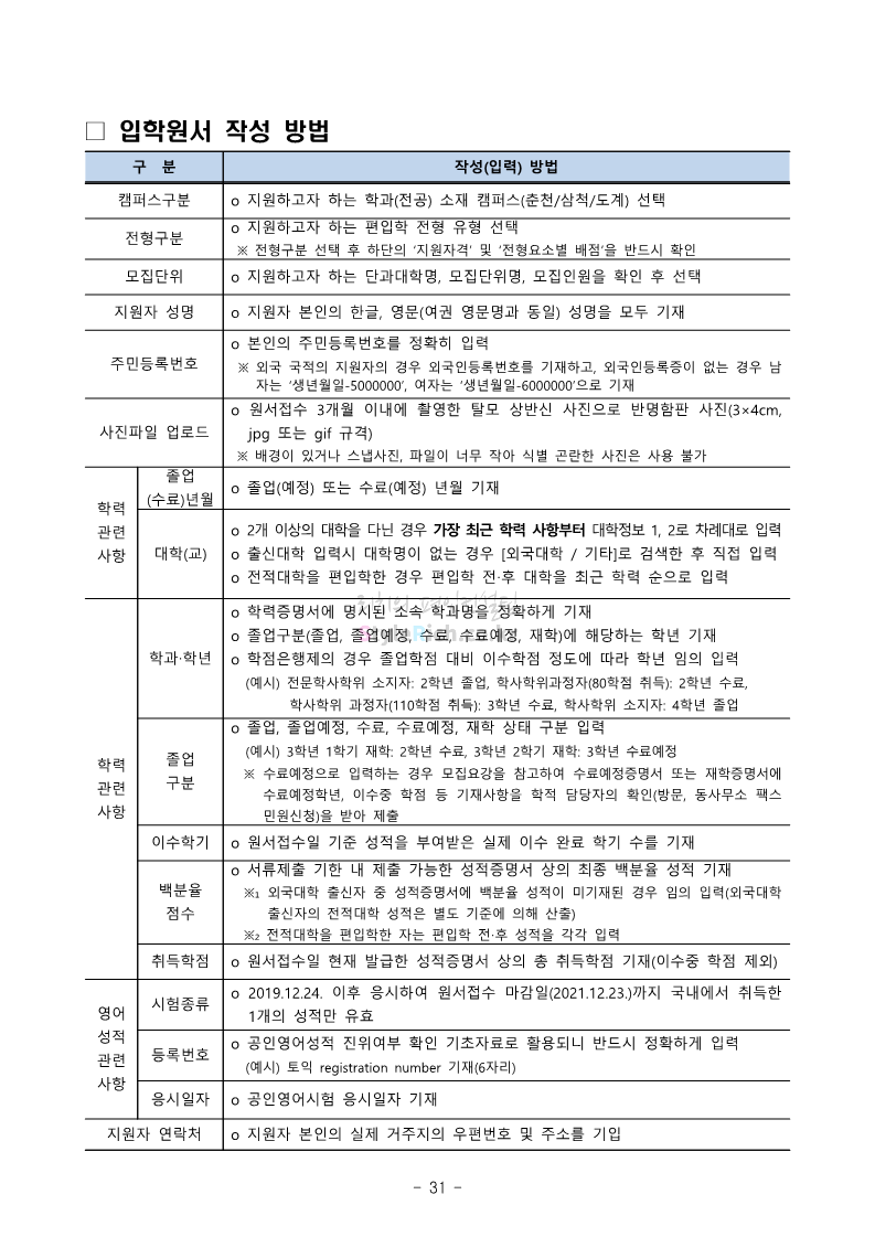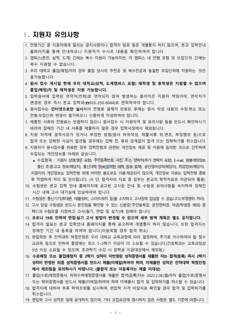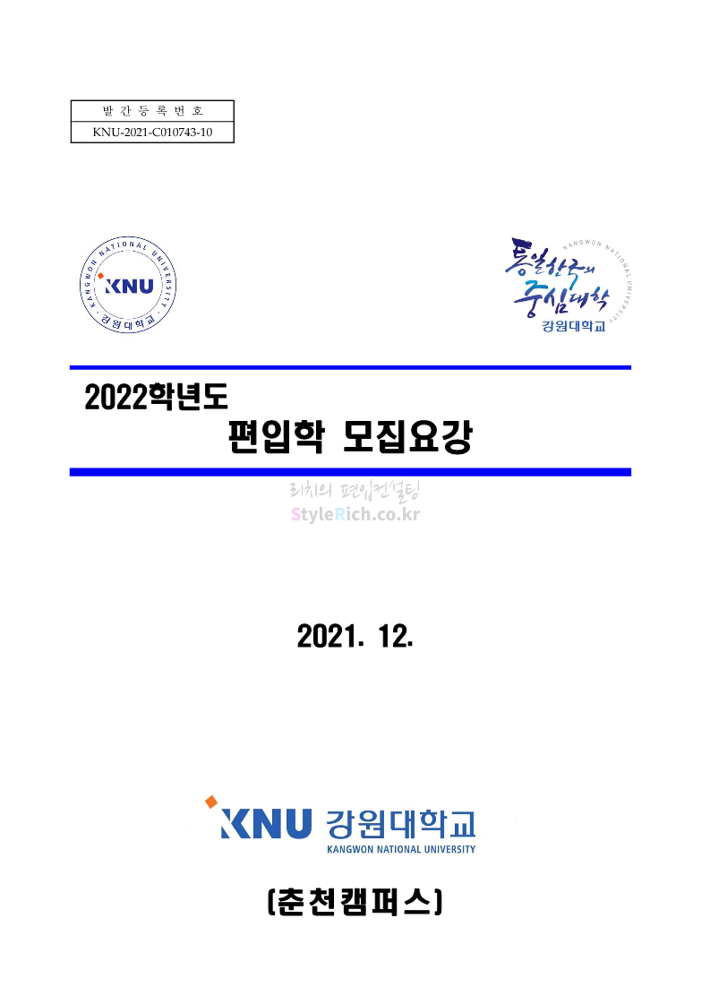 강원대 편입 2022학년도 모집요강 간편하게 보자! 2021.12.11 00:41 편입 모집요강/2022학년도 모집요강 2022학년도 강원대 편입 모집요강(2021.12.10 기준)을 간편하게 확인하세요. * 최종 모집요강 발표 이후에도 내용의 일부가 변경될 수 있으니 지원 전 반드시 강원대 입학처의 모집요강을 확인 바랍니다. 2022학년도 강원대 편입 모집요강 다운받기 <출처: 강원대> 강원대학교의 내일을 ON : 가온| • 🔶가온이 리뷰해두리 곰두리 굿즈 편🔶 공유하기 게시글 관리 리치의 편입컨설팅 저작자표시 비영리 변경금지 (새창열림) '편입 모집요강 > 2022학년도 모집요강' 카테고리의 다른 글 서강대 편입 2022학년도 모집요강 간편하게 보자! (0) 2021.12.11 강원대(삼척) 편입 2022학년도 모집요강 간편하게 보자! (0) 2021.12.11 한양대 편입 2022학년도 모집요강 간편하게 보자! (0) 2021.12.10 한국외대 편입 2022학년도 모집요강 간편하게 보자! (0) 2021.12.10 서울여대 편입 2022학년도 모집요강 간편하게 보자! (0) 2021.12.10 댓글 공유하기 다른 글 댓글 이 글 공유하기 구독하기 구독하기 카카오톡 카카오톡 라인 라인 트위터 트위터 Facebook Facebook 카카오스토리 카카오스토리 밴드 밴드 네이버 블로그 네이버 블로그 Pocket Pocket Evernote Evernote 다른 글 서강대 편입 2022학년도 모집요강 간편하게 보자! 서강대 편입 2022학년도 모집요강 간편하게 보자! 2021.12.11 강원대(삼척) 편입 2022학년도 모집요강 간편하게 보자! 강원대(삼척) 편입 2022학년도 모집요강 간편하게 보자! 2021.12.11 한양대 편입 2022학년도 모집요강 간편하게 보자! 한양대 편입 2022학년도 모집요강 간편하게 보자! 2021.12.10 한국외대 편입 2022학년도 모집요강 간편하게 보자! 한국외대 편입 2022학년도 모집요강 간편하게 보자! 2021.12.10 다른 글 더 둘러보기