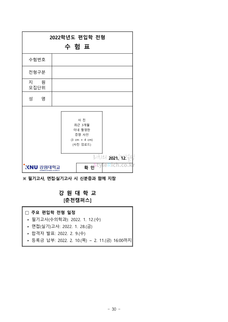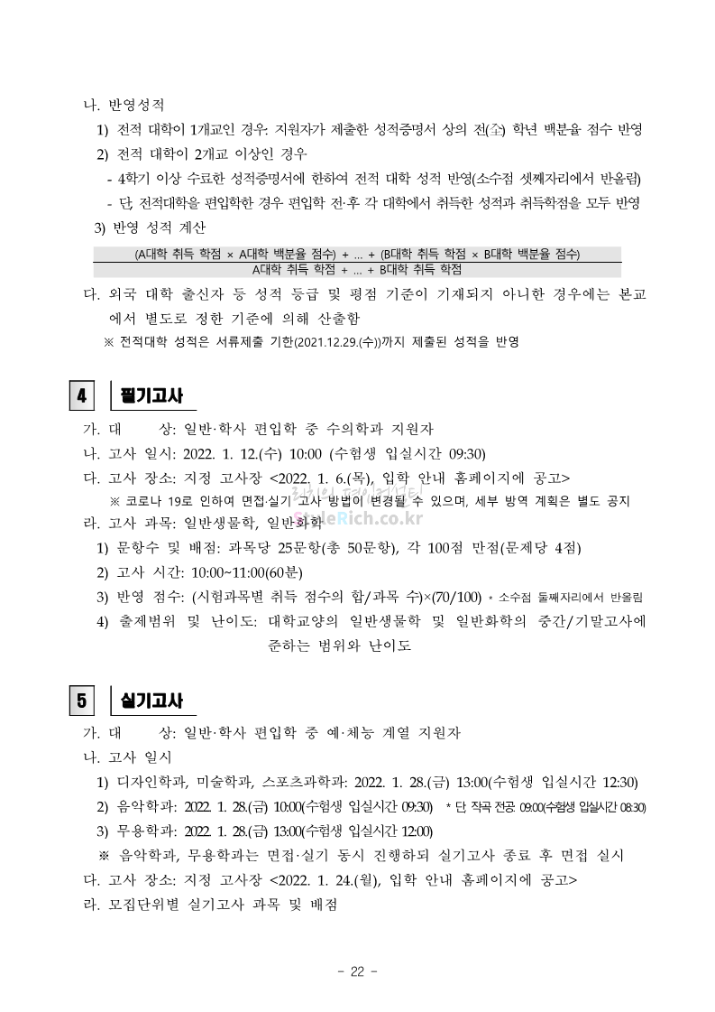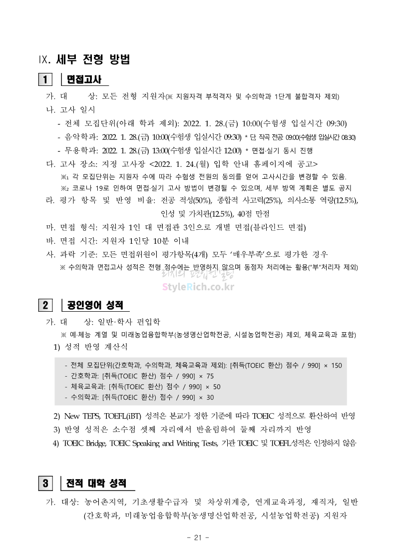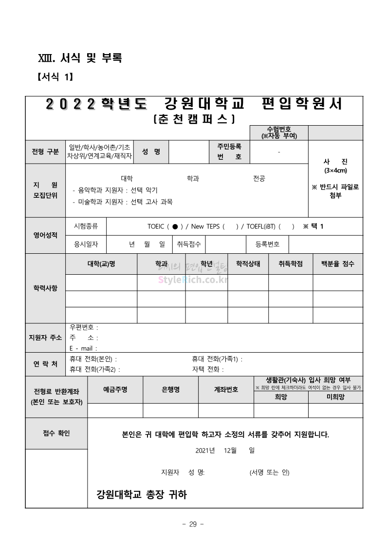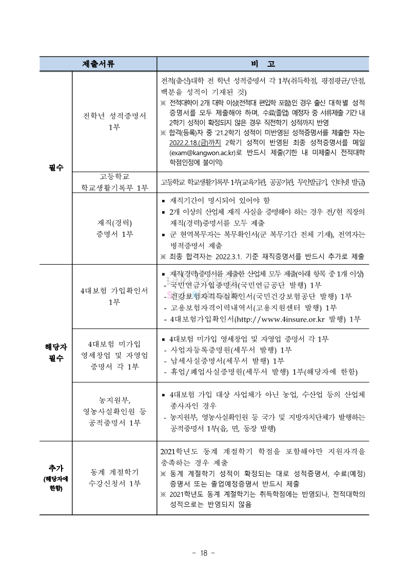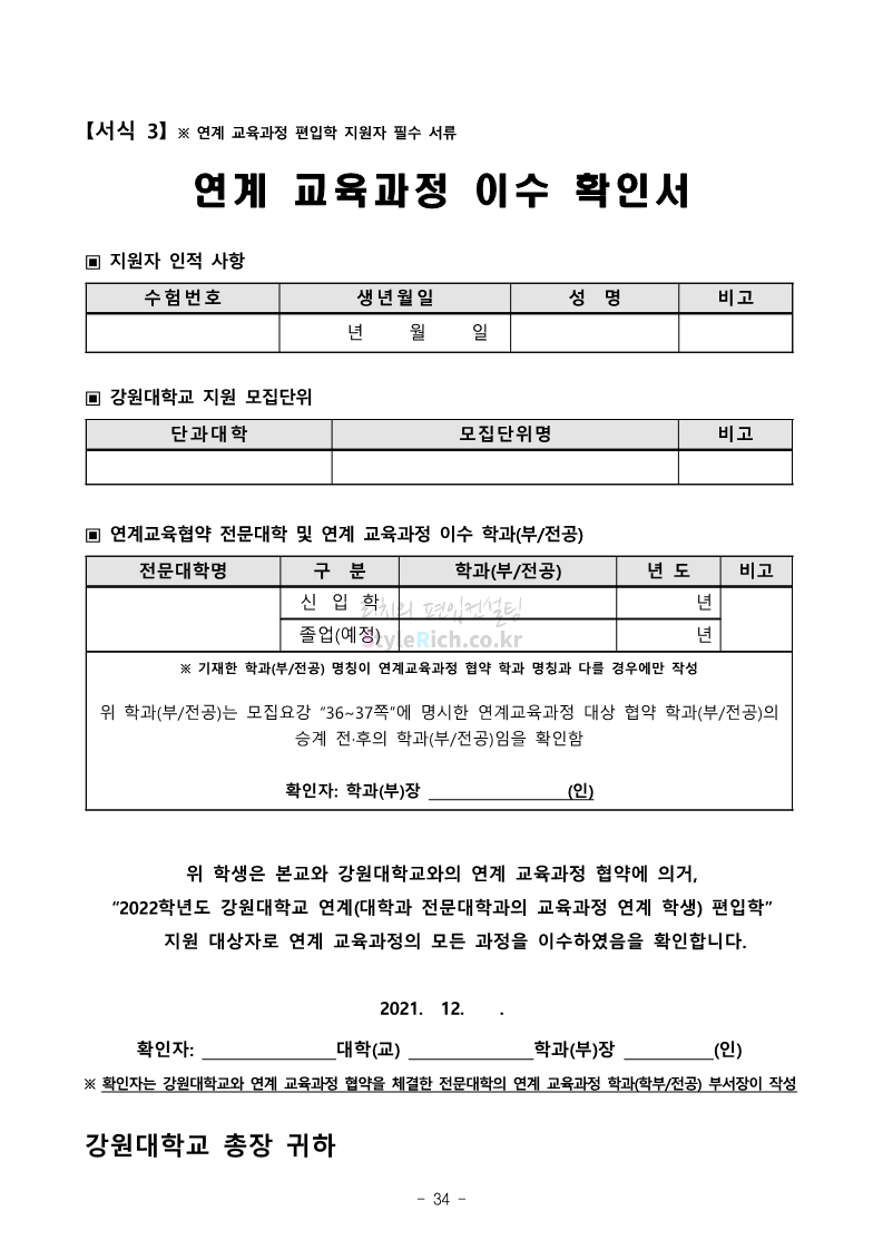 강원대 편입 2022학년도 모집요강 간편하게 보자! 2021.12.11 00:41 편입 모집요강/2022학년도 모집요강 2022학년도 강원대 편입 모집요강(2021.12.10 기준)을 간편하게 확인하세요. * 최종 모집요강 발표 이후에도 내용의 일부가 변경될 수 있으니 지원 전 반드시 강원대 입학처의 모집요강을 확인 바랍니다. 2022학년도 강원대 편입 모집요강 다운받기 <출처: 강원대> 강원대학교의 내일을 ON : 가온| • 🔶가온이 리뷰해두리 곰두리 굿즈 편🔶 공유하기 게시글 관리 리치의 편입컨설팅 저작자표시 비영리 변경금지 (새창열림) '편입 모집요강 > 2022학년도 모집요강' 카테고리의 다른 글 서강대 편입 2022학년도 모집요강 간편하게 보자! (0) 2021.12.11 강원대(삼척) 편입 2022학년도 모집요강 간편하게 보자! (0) 2021.12.11 한양대 편입 2022학년도 모집요강 간편하게 보자! (0) 2021.12.10 한국외대 편입 2022학년도 모집요강 간편하게 보자! (0) 2021.12.10 서울여대 편입 2022학년도 모집요강 간편하게 보자! (0) 2021.12.10 댓글 공유하기 다른 글 댓글 이 글 공유하기 구독하기 구독하기 카카오톡 카카오톡 라인 라인 트위터 트위터 Facebook Facebook 카카오스토리 카카오스토리 밴드 밴드 네이버 블로그 네이버 블로그 Pocket Pocket Evernote Evernote 다른 글 서강대 편입 2022학년도 모집요강 간편하게 보자! 서강대 편입 2022학년도 모집요강 간편하게 보자! 2021.12.11 강원대(삼척) 편입 2022학년도 모집요강 간편하게 보자! 강원대(삼척) 편입 2022학년도 모집요강 간편하게 보자! 2021.12.11 한양대 편입 2022학년도 모집요강 간편하게 보자! 한양대 편입 2022학년도 모집요강 간편하게 보자! 2021.12.10 한국외대 편입 2022학년도 모집요강 간편하게 보자! 한국외대 편입 2022학년도 모집요강 간편하게 보자! 2021.12.10 다른 글 더 둘러보기