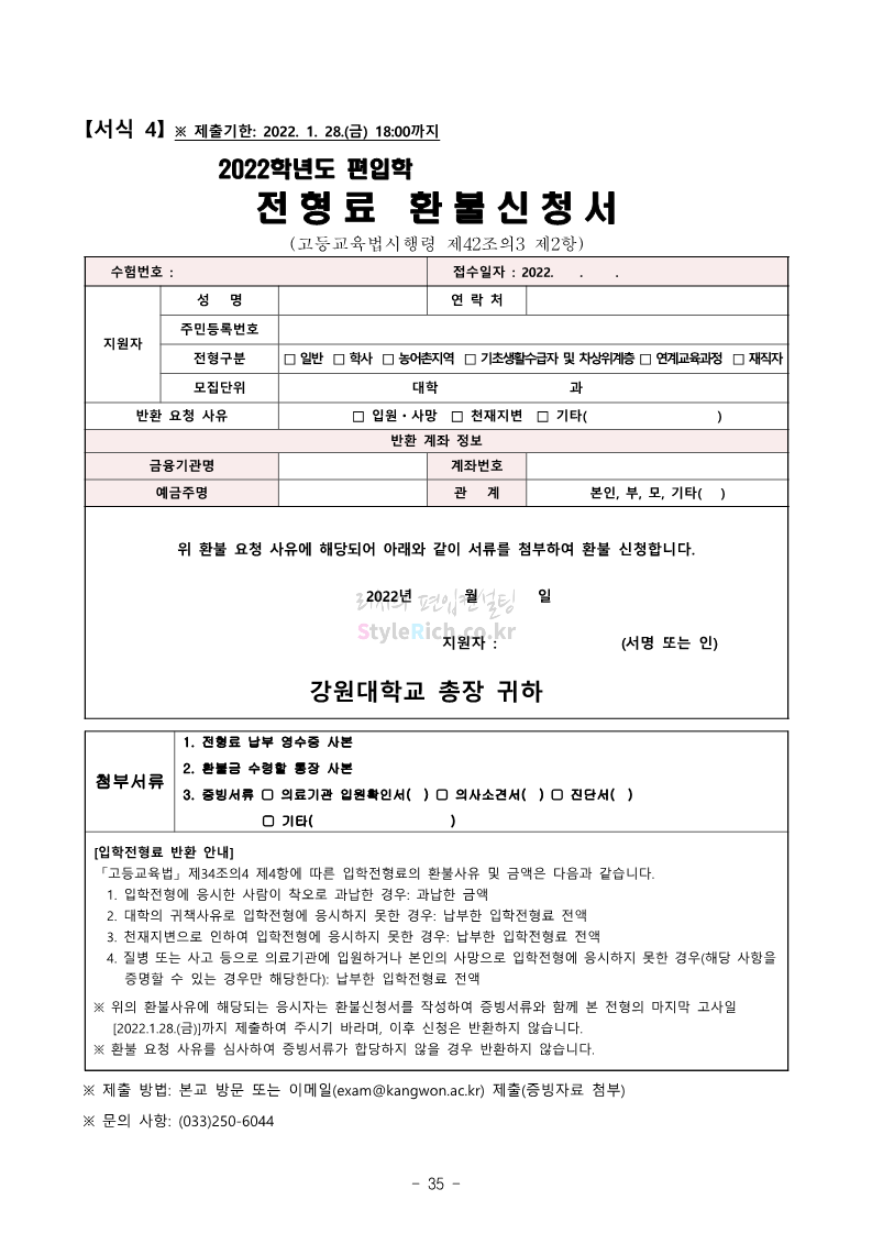 강원대 편입 2022학년도 모집요강 간편하게 보자! 2021.12.11 00:41 편입 모집요강/2022학년도 모집요강 2022학년도 강원대 편입 모집요강(2021.12.10 기준)을 간편하게 확인하세요. * 최종 모집요강 발표 이후에도 내용의 일부가 변경될 수 있으니 지원 전 반드시 강원대 입학처의 모집요강을 확인 바랍니다. 2022학년도 강원대 편입 모집요강 다운받기 <출처: 강원대> 강원대학교의 내일을 ON : 가온| • 🔶가온이 리뷰해두리 곰두리 굿즈 편🔶 공유하기 게시글 관리 리치의 편입컨설팅 저작자표시 비영리 변경금지 (새창열림) '편입 모집요강 > 2022학년도 모집요강' 카테고리의 다른 글 서강대 편입 2022학년도 모집요강 간편하게 보자! (0) 2021.12.11 강원대(삼척) 편입 2022학년도 모집요강 간편하게 보자! (0) 2021.12.11 한양대 편입 2022학년도 모집요강 간편하게 보자! (0) 2021.12.10 한국외대 편입 2022학년도 모집요강 간편하게 보자! (0) 2021.12.10 서울여대 편입 2022학년도 모집요강 간편하게 보자! (0) 2021.12.10 댓글 공유하기 다른 글 댓글 이 글 공유하기 구독하기 구독하기 카카오톡 카카오톡 라인 라인 트위터 트위터 Facebook Facebook 카카오스토리 카카오스토리 밴드 밴드 네이버 블로그 네이버 블로그 Pocket Pocket Evernote Evernote 다른 글 서강대 편입 2022학년도 모집요강 간편하게 보자! 서강대 편입 2022학년도 모집요강 간편하게 보자! 2021.12.11 강원대(삼척) 편입 2022학년도 모집요강 간편하게 보자! 강원대(삼척) 편입 2022학년도 모집요강 간편하게 보자! 2021.12.11 한양대 편입 2022학년도 모집요강 간편하게 보자! 한양대 편입 2022학년도 모집요강 간편하게 보자! 2021.12.10 한국외대 편입 2022학년도 모집요강 간편하게 보자! 한국외대 편입 2022학년도 모집요강 간편하게 보자! 2021.12.10 다른 글 더 둘러보기