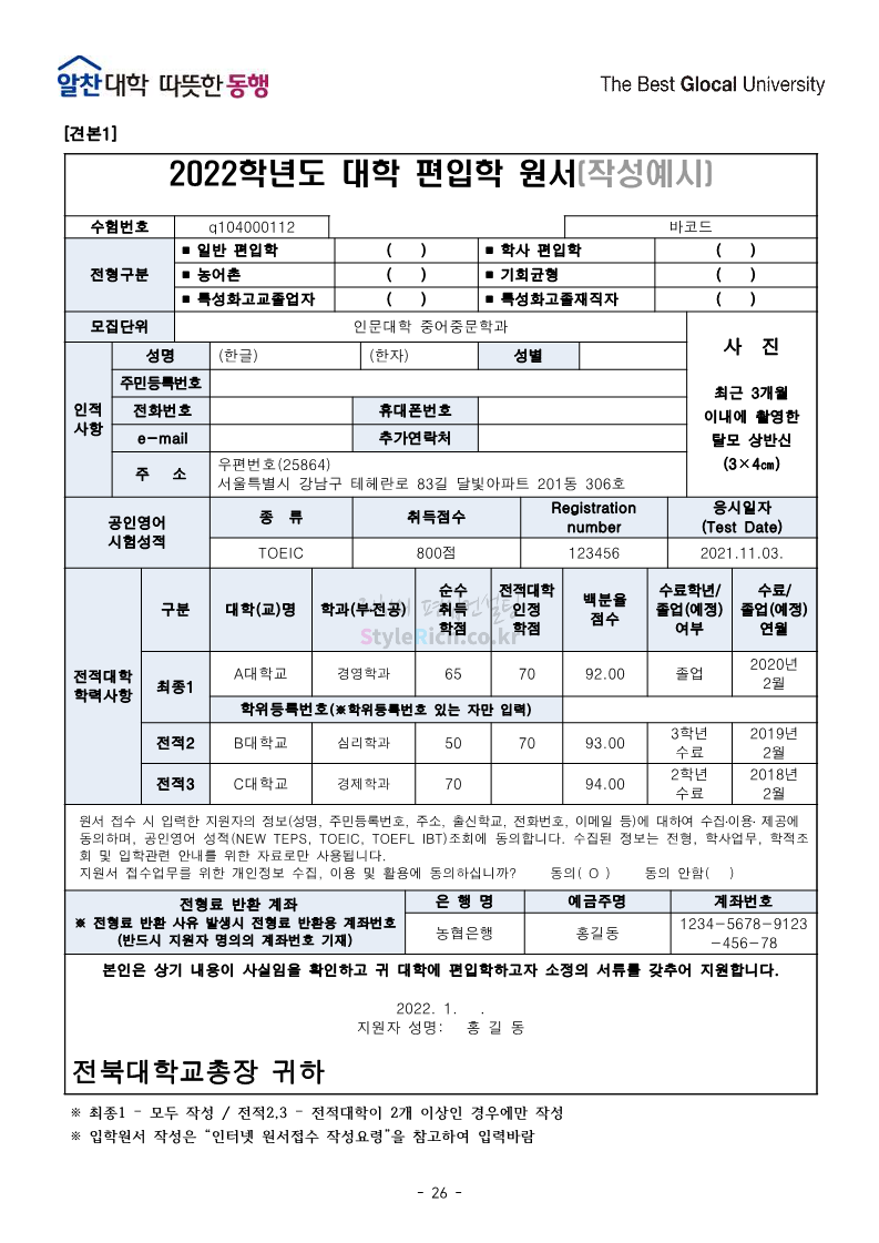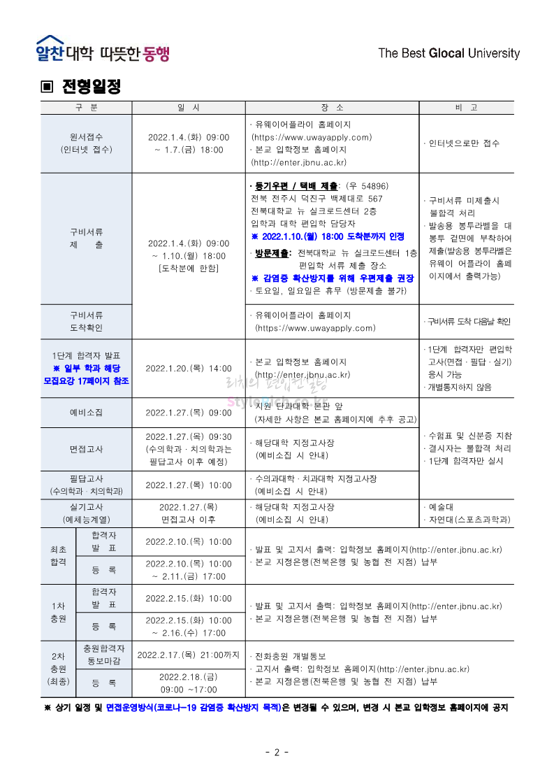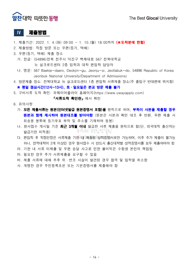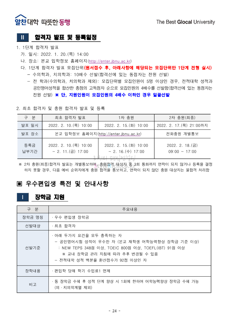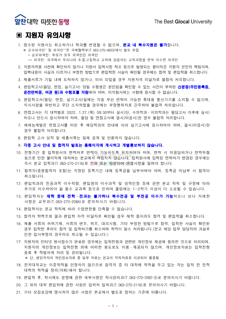 전북대 편입 2022학년도 모집요강 간편하게 보자! 2021.12.15 23:41 편입 모집요강/2022학년도 모집요강 2022학년도 전북대 편입 모집요강(2021.12.15 기준)을 간편하게 확인하세요. * 최종 모집요강 발표 이후에도 내용의 일부가 변경될 수 있으니 지원 전 반드시 전북대 입학처의 모집요강을 확인 바랍니다. 2022학년도 전북대 편입 모집요강 다운받기 <출처: 전북대> 전북대학교 홍보영상(캠퍼스) 공유하기 게시글 관리 리치의 편입컨설팅 저작자표시 비영리 변경금지 (새창열림) '편입 모집요강 > 2022학년도 모집요강' 카테고리의 다른 글 인천대 편입 2022학년도 모집요강 간편하게 보자! (0) 2021.12.17 성신여대 편입 2022학년도 모집요강 간편하게 보자! (0) 2021.12.16 한양대(에리카)편입 2022학년도 모집요강 간편하게 보자! (0) 2021.12.15 삼육대 편입 2022학년도 모집요강 간편하게 보자! (0) 2021.12.15 고려대(세종) 편입 2022학년도 모집요강 간편하게 보자! (0) 2021.12.15 댓글 공유하기 다른 글 댓글 이 글 공유하기 구독하기 구독하기 카카오톡 카카오톡 라인 라인 트위터 트위터 Facebook Facebook 카카오스토리 카카오스토리 밴드 밴드 네이버 블로그 네이버 블로그 Pocket Pocket Evernote Evernote 다른 글 인천대 편입 2022학년도 모집요강 간편하게 보자! 인천대 편입 2022학년도 모집요강 간편하게 보자! 2021.12.17 성신여대 편입 2022학년도 모집요강 간편하게 보자! 성신여대 편입 2022학년도 모집요강 간편하게 보자! 2021.12.16 한양대(에리카)편입 2022학년도 모집요강 간편하게 보자! 한양대(에리카)편입 2022학년도 모집요강 간편하게 보자! 2021.12.15 삼육대 편입 2022학년도 모집요강 간편하게 보자! 삼육대 편입 2022학년도 모집요강 간편하게 보자! 2021.12.15 다른 글 더 둘러보기