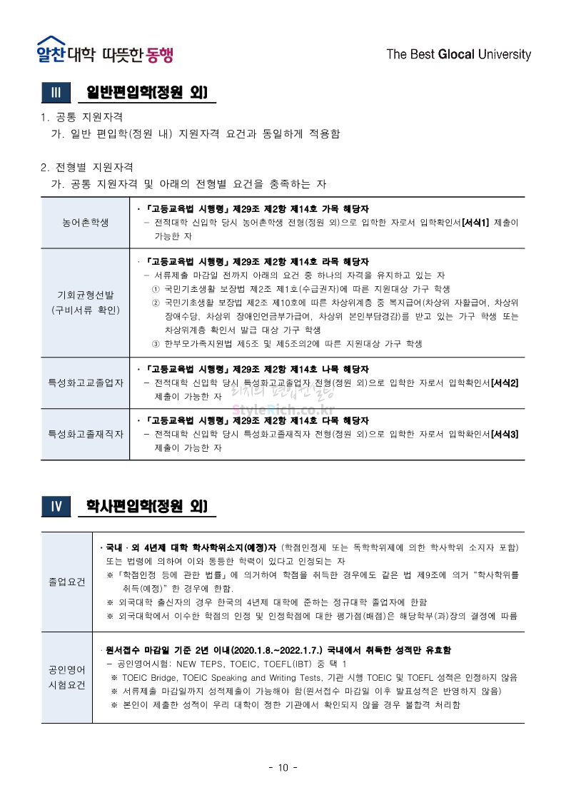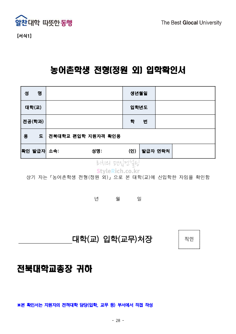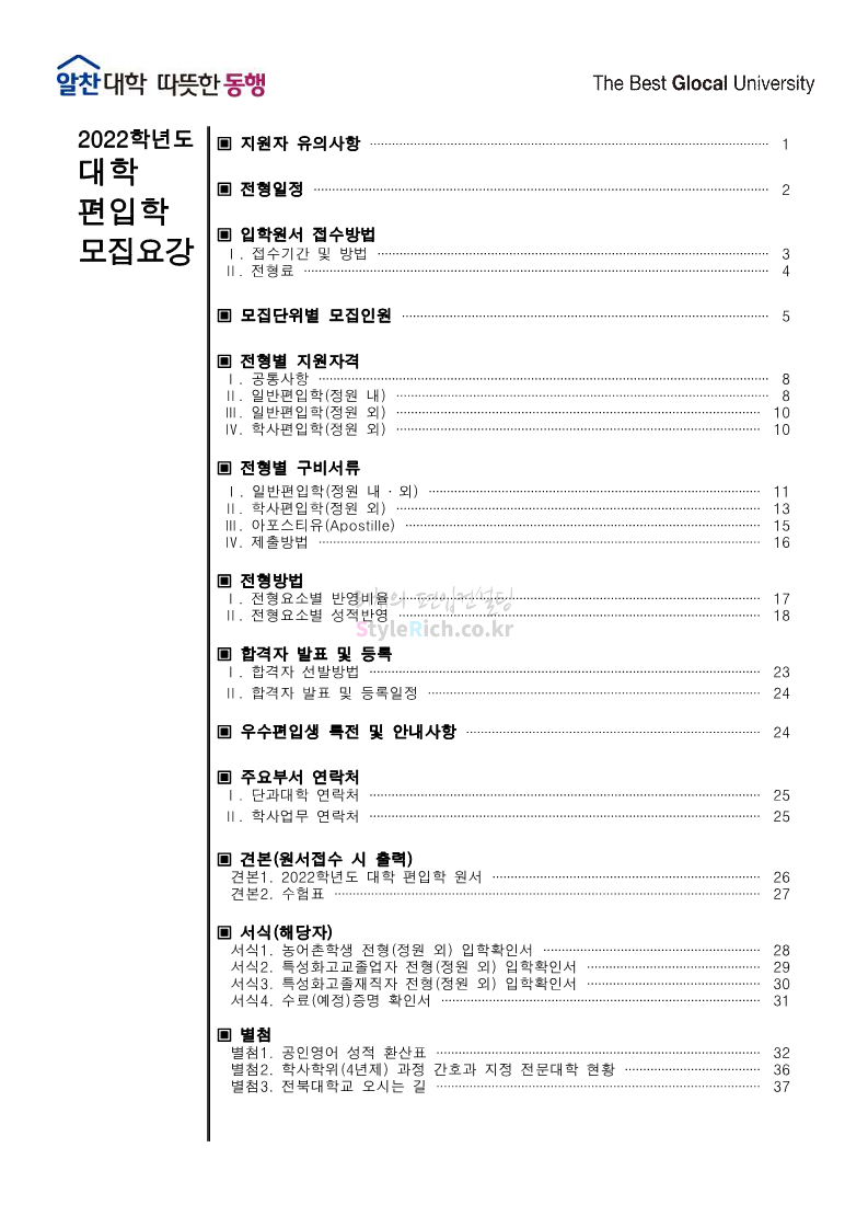 전북대 편입 2022학년도 모집요강 간편하게 보자! 2021.12.15 23:41 편입 모집요강/2022학년도 모집요강 2022학년도 전북대 편입 모집요강(2021.12.15 기준)을 간편하게 확인하세요. * 최종 모집요강 발표 이후에도 내용의 일부가 변경될 수 있으니 지원 전 반드시 전북대 입학처의 모집요강을 확인 바랍니다. 2022학년도 전북대 편입 모집요강 다운받기 <출처: 전북대> 전북대학교 홍보영상(캠퍼스) 공유하기 게시글 관리 리치의 편입컨설팅 저작자표시 비영리 변경금지 (새창열림) '편입 모집요강 > 2022학년도 모집요강' 카테고리의 다른 글 인천대 편입 2022학년도 모집요강 간편하게 보자! (0) 2021.12.17 성신여대 편입 2022학년도 모집요강 간편하게 보자! (0) 2021.12.16 한양대(에리카)편입 2022학년도 모집요강 간편하게 보자! (0) 2021.12.15 삼육대 편입 2022학년도 모집요강 간편하게 보자! (0) 2021.12.15 고려대(세종) 편입 2022학년도 모집요강 간편하게 보자! (0) 2021.12.15 댓글 공유하기 다른 글 댓글 이 글 공유하기 구독하기 구독하기 카카오톡 카카오톡 라인 라인 트위터 트위터 Facebook Facebook 카카오스토리 카카오스토리 밴드 밴드 네이버 블로그 네이버 블로그 Pocket Pocket Evernote Evernote 다른 글 인천대 편입 2022학년도 모집요강 간편하게 보자! 인천대 편입 2022학년도 모집요강 간편하게 보자! 2021.12.17 성신여대 편입 2022학년도 모집요강 간편하게 보자! 성신여대 편입 2022학년도 모집요강 간편하게 보자! 2021.12.16 한양대(에리카)편입 2022학년도 모집요강 간편하게 보자! 한양대(에리카)편입 2022학년도 모집요강 간편하게 보자! 2021.12.15 삼육대 편입 2022학년도 모집요강 간편하게 보자! 삼육대 편입 2022학년도 모집요강 간편하게 보자! 2021.12.15 다른 글 더 둘러보기
