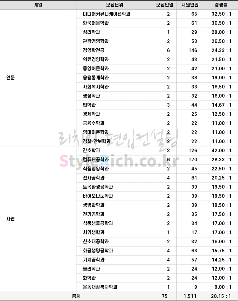 자연 경쟁률 TOP3 학과: 물리치료학과, 컴퓨터공학과, 토목환경공학과