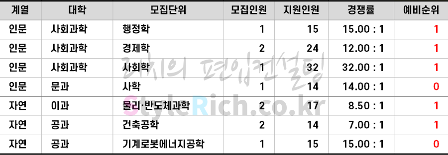 * 모집단위는 인문, 자연, 예체능으로 분류 후 추가합격이 많은 순으로 정렬