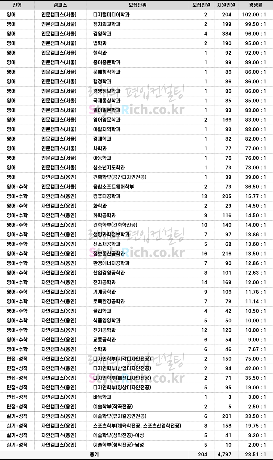 영어+수학전형 경쟁률 TOP3 학과: 융합소프트웨어학부, 컴퓨터공학과, 화학과, 화학공학과