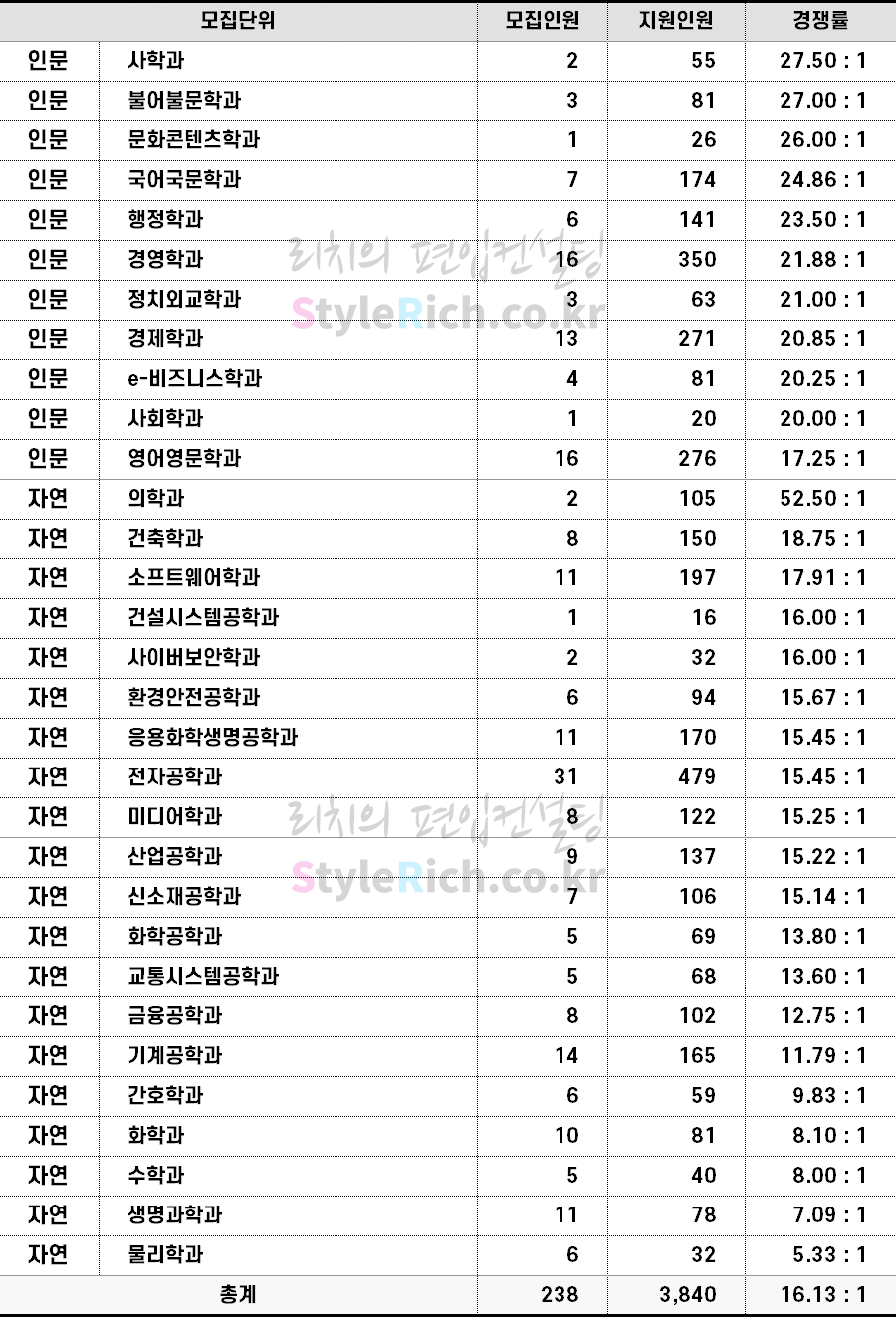 * 인문, 자연으로 분류 후 경쟁률이 높은 학과 순으로 정렬