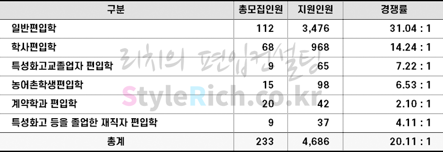2022학년도 인하대 편입 전형별 경쟁률 현황